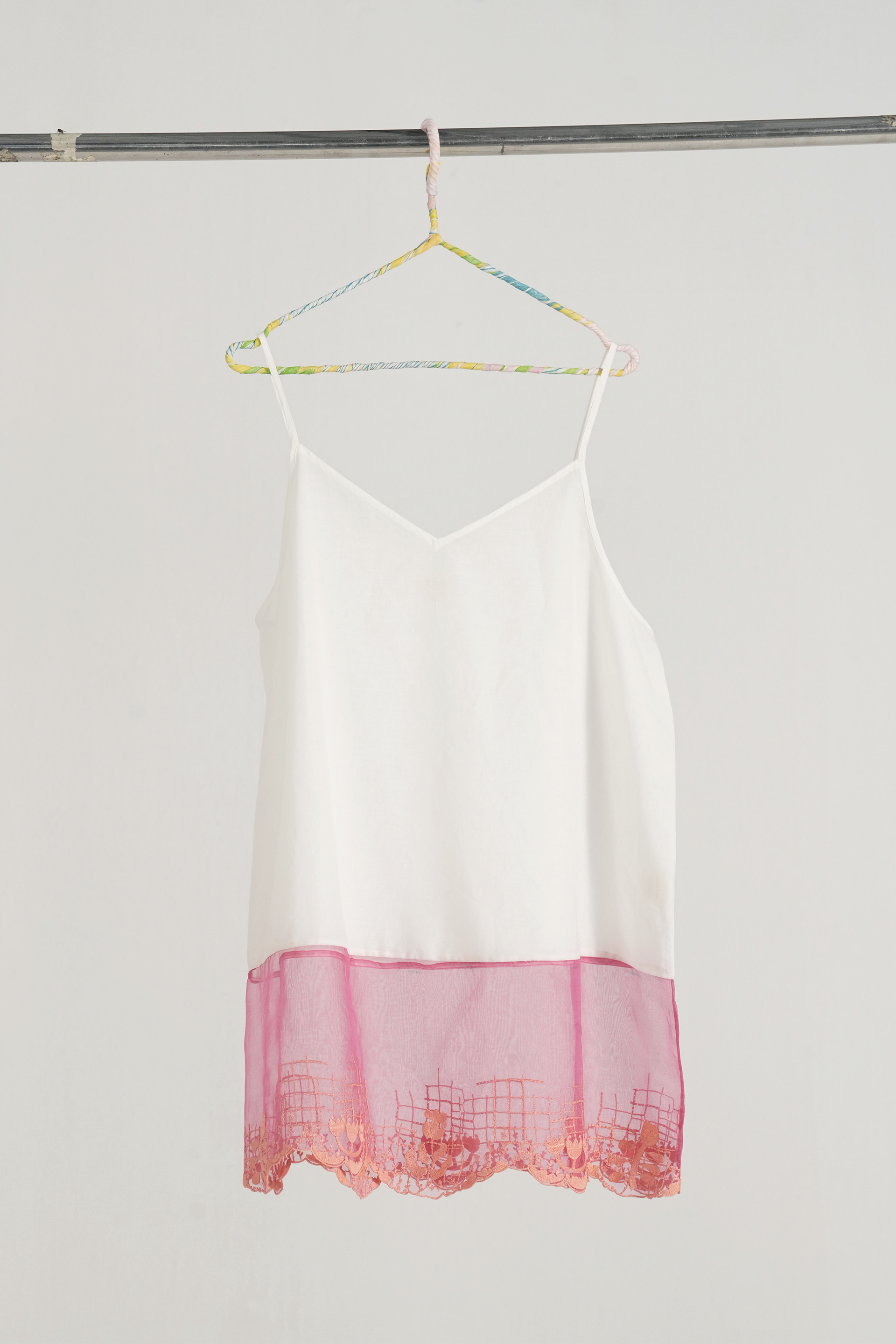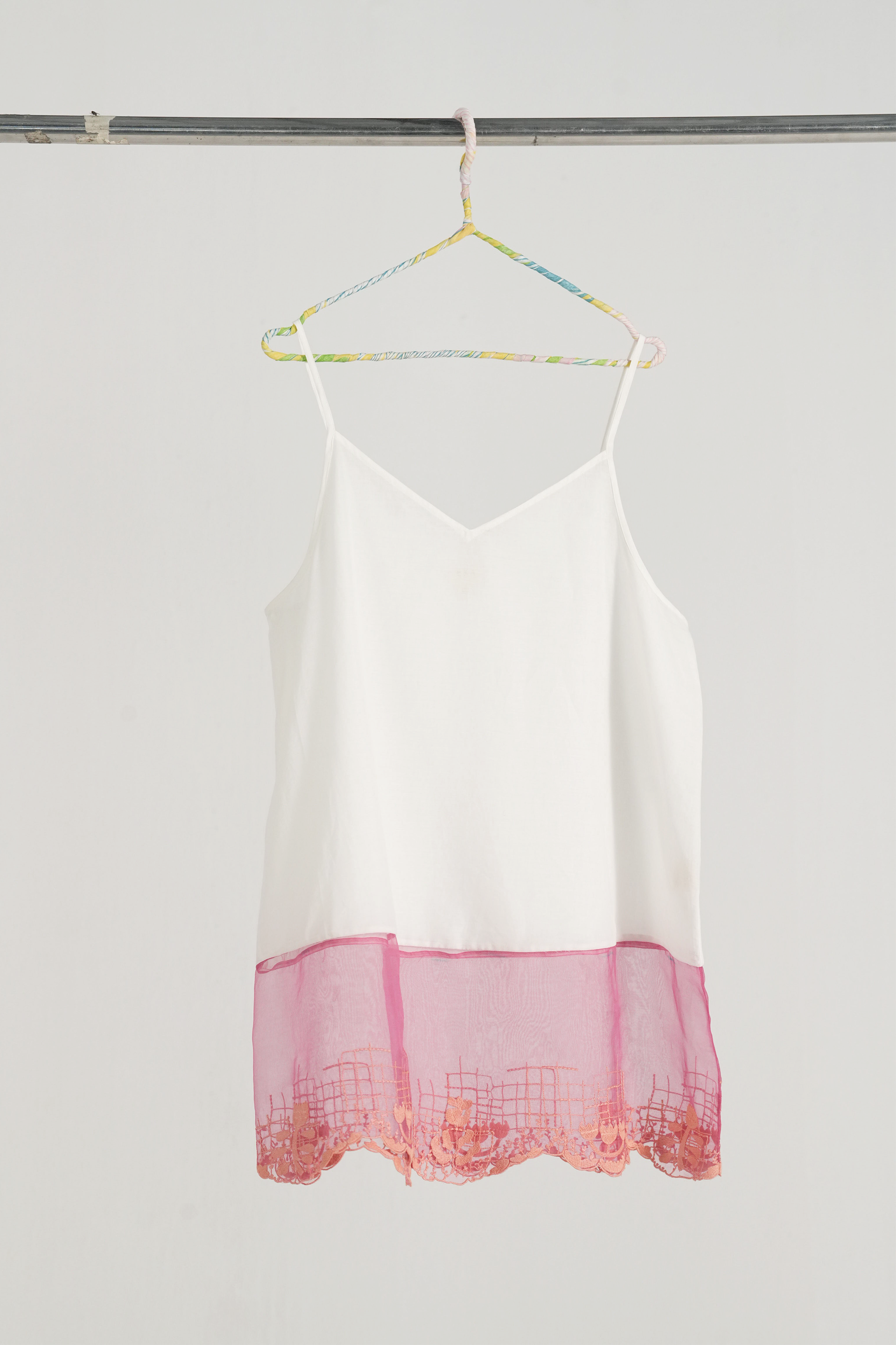 Short spaghetti lining with floral embroidery.