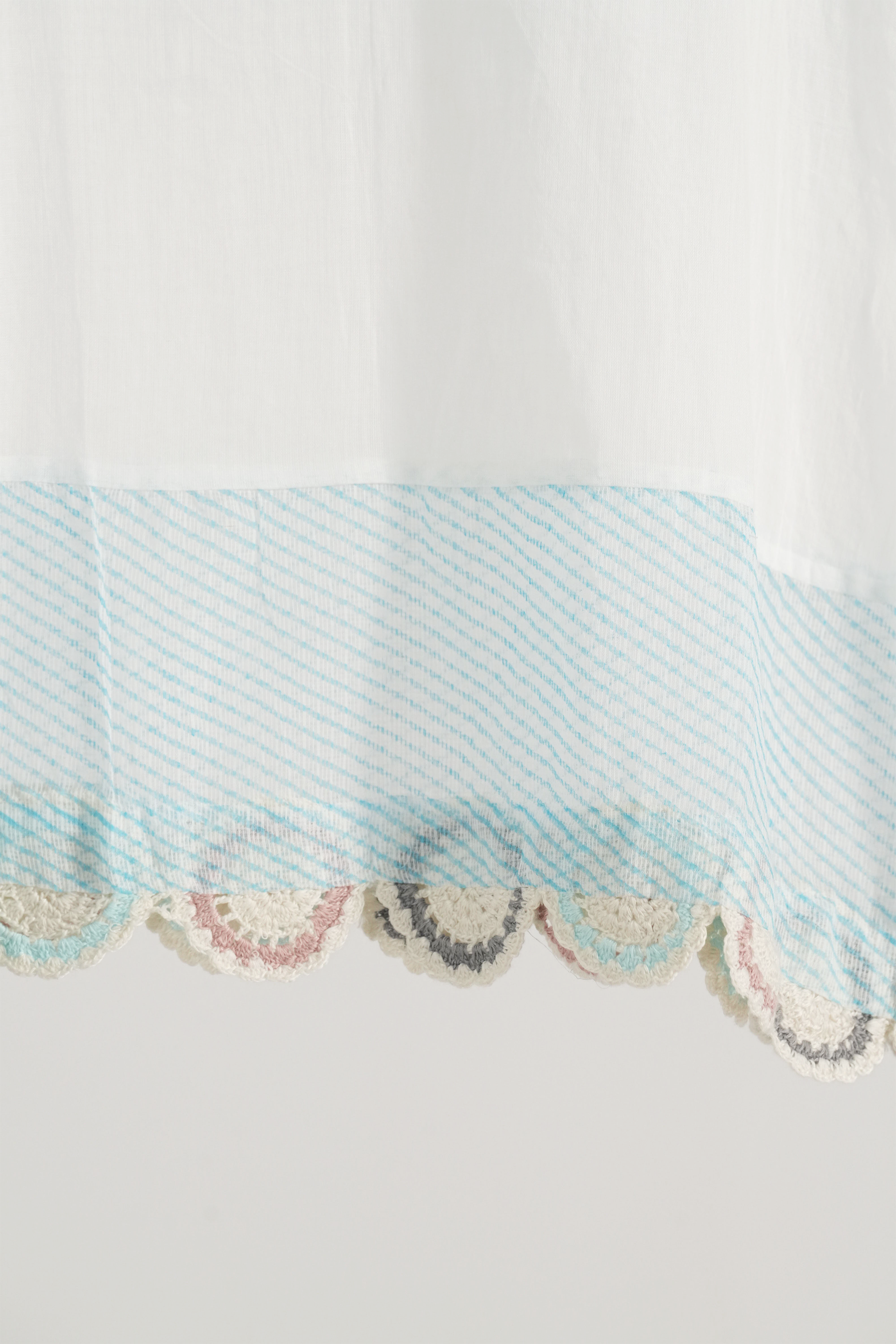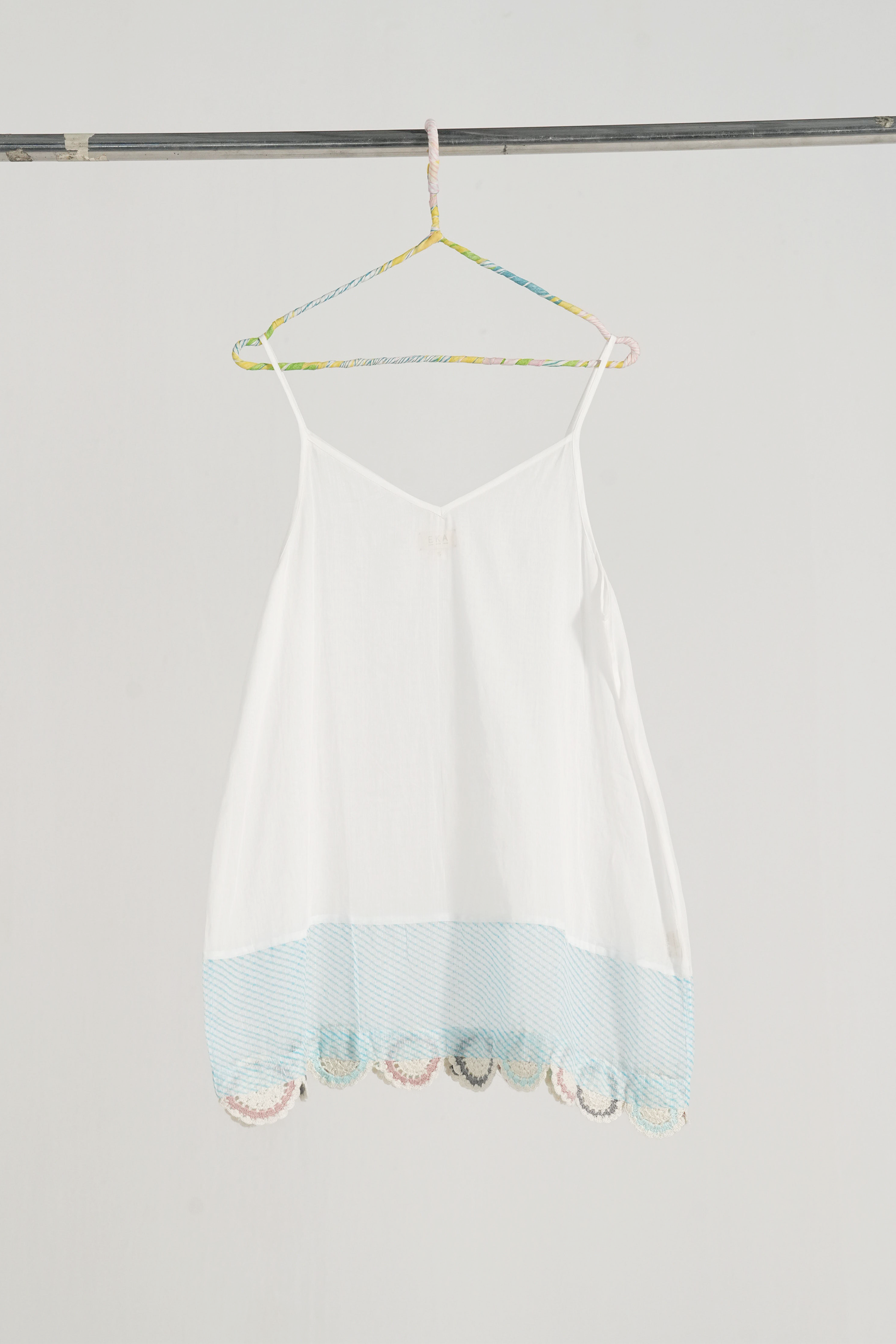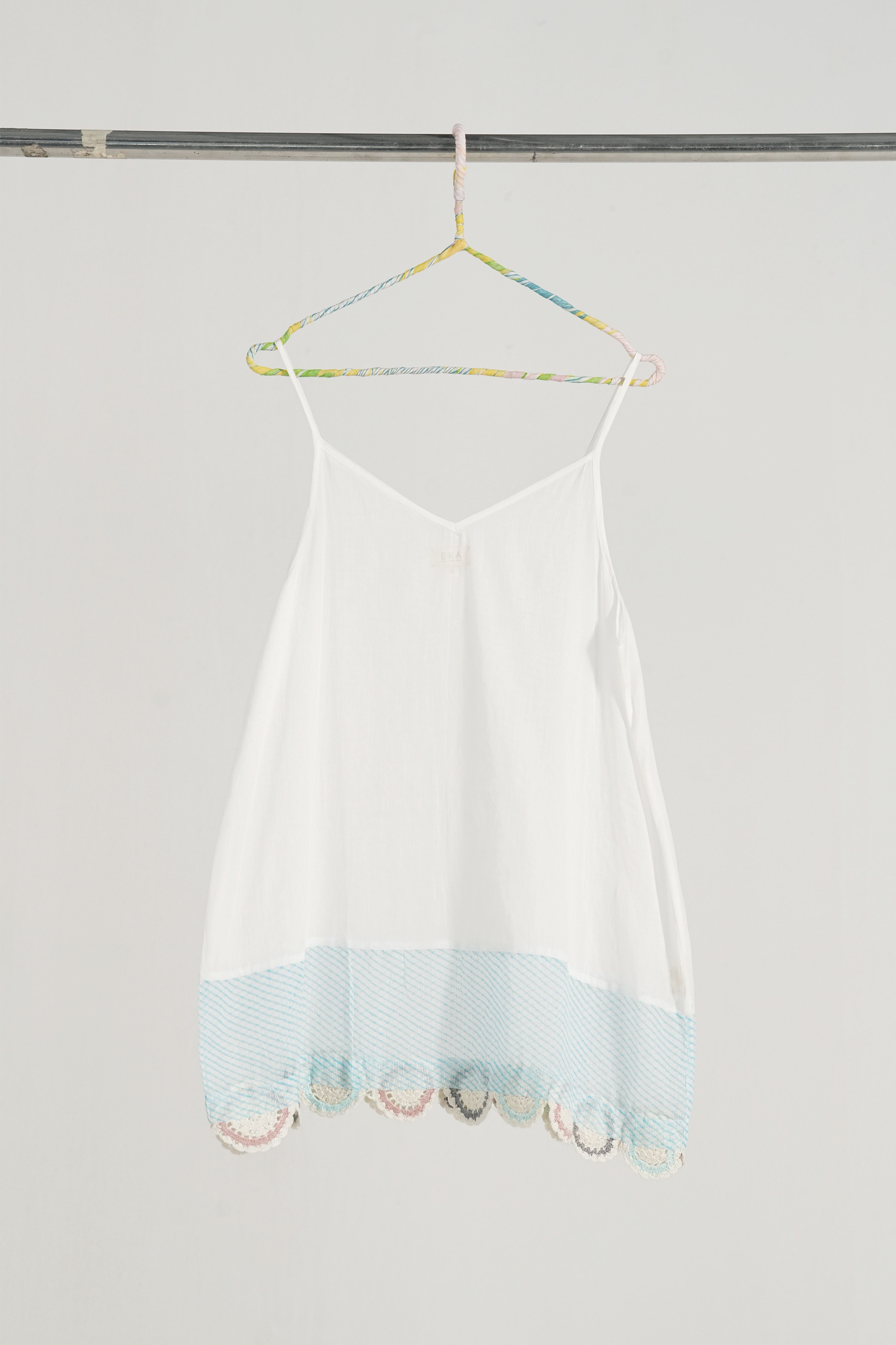 Short spaghetti lining with hand crochet lace insert.