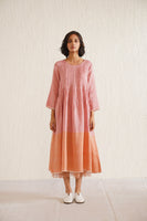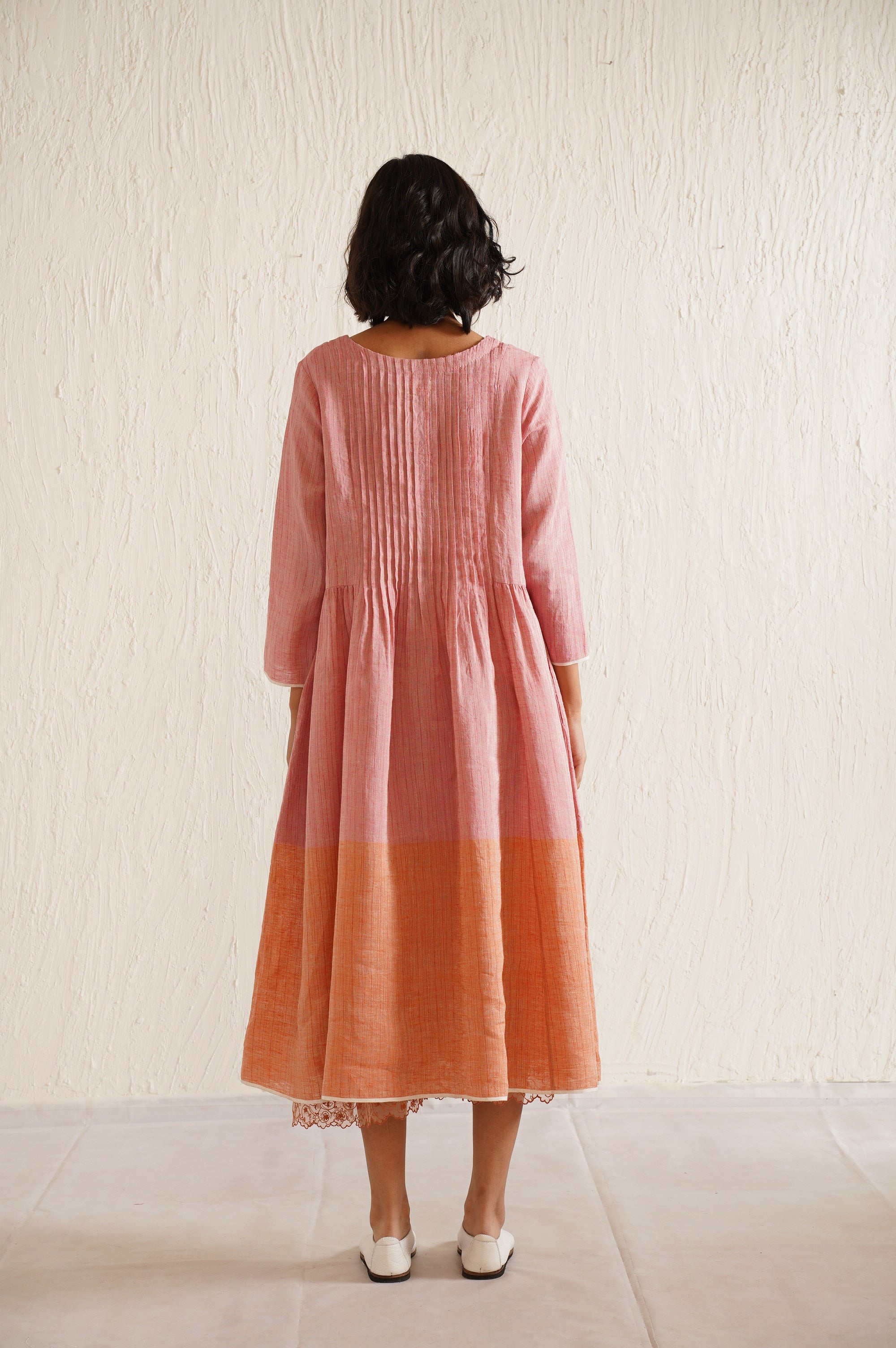 Pink half and half color dress in handwoven linen, featuring all over abstract striped print with pintucks on the front.
