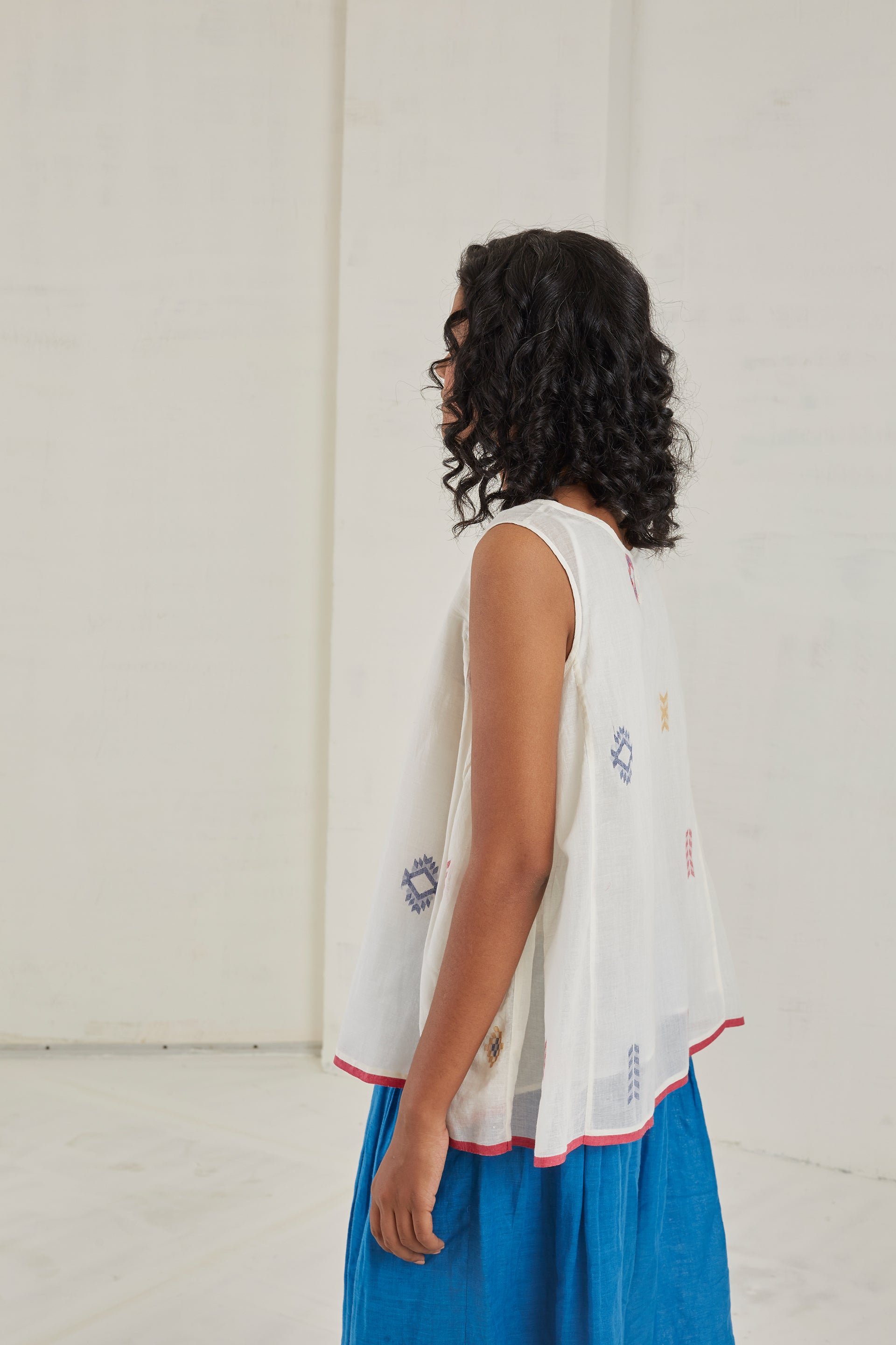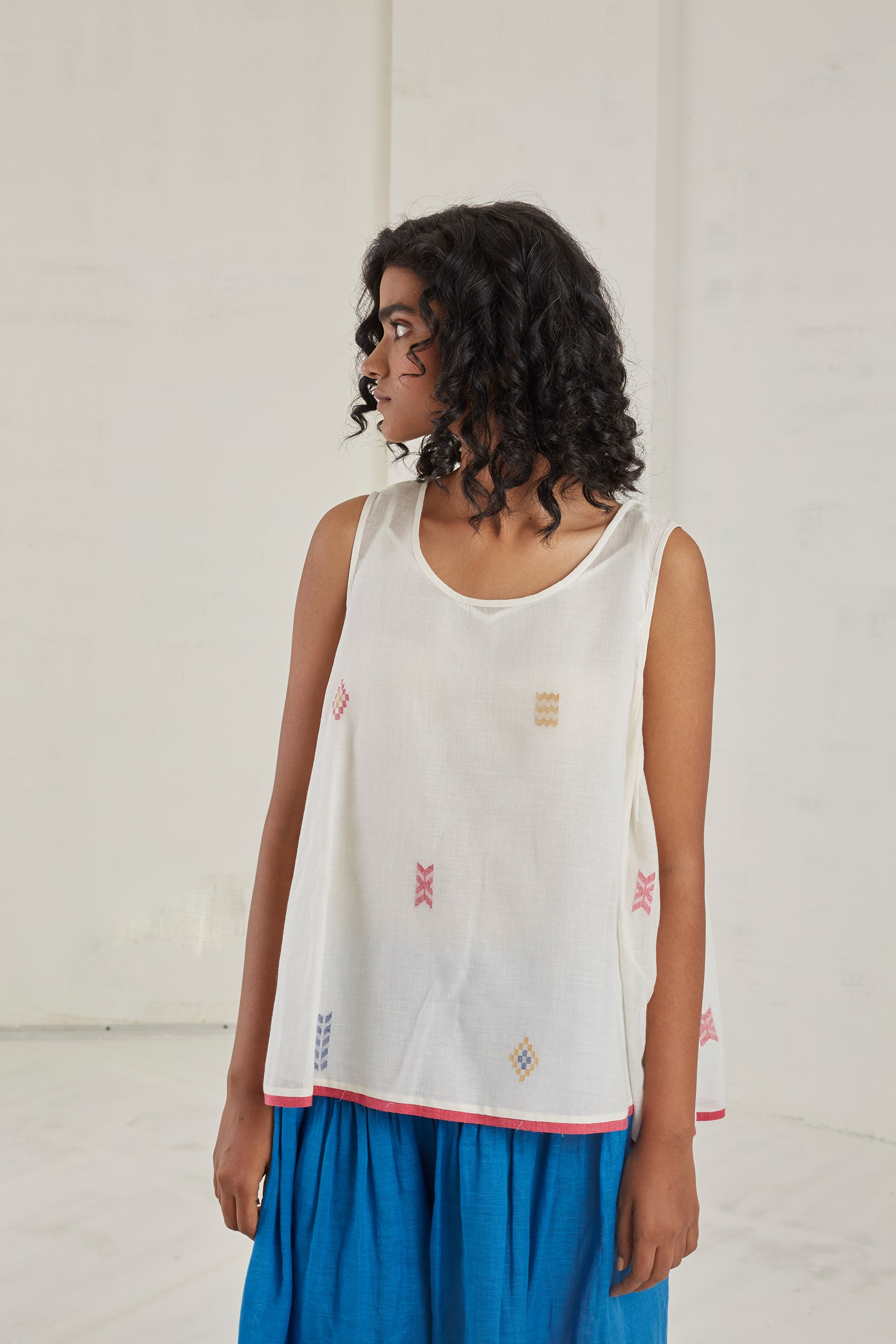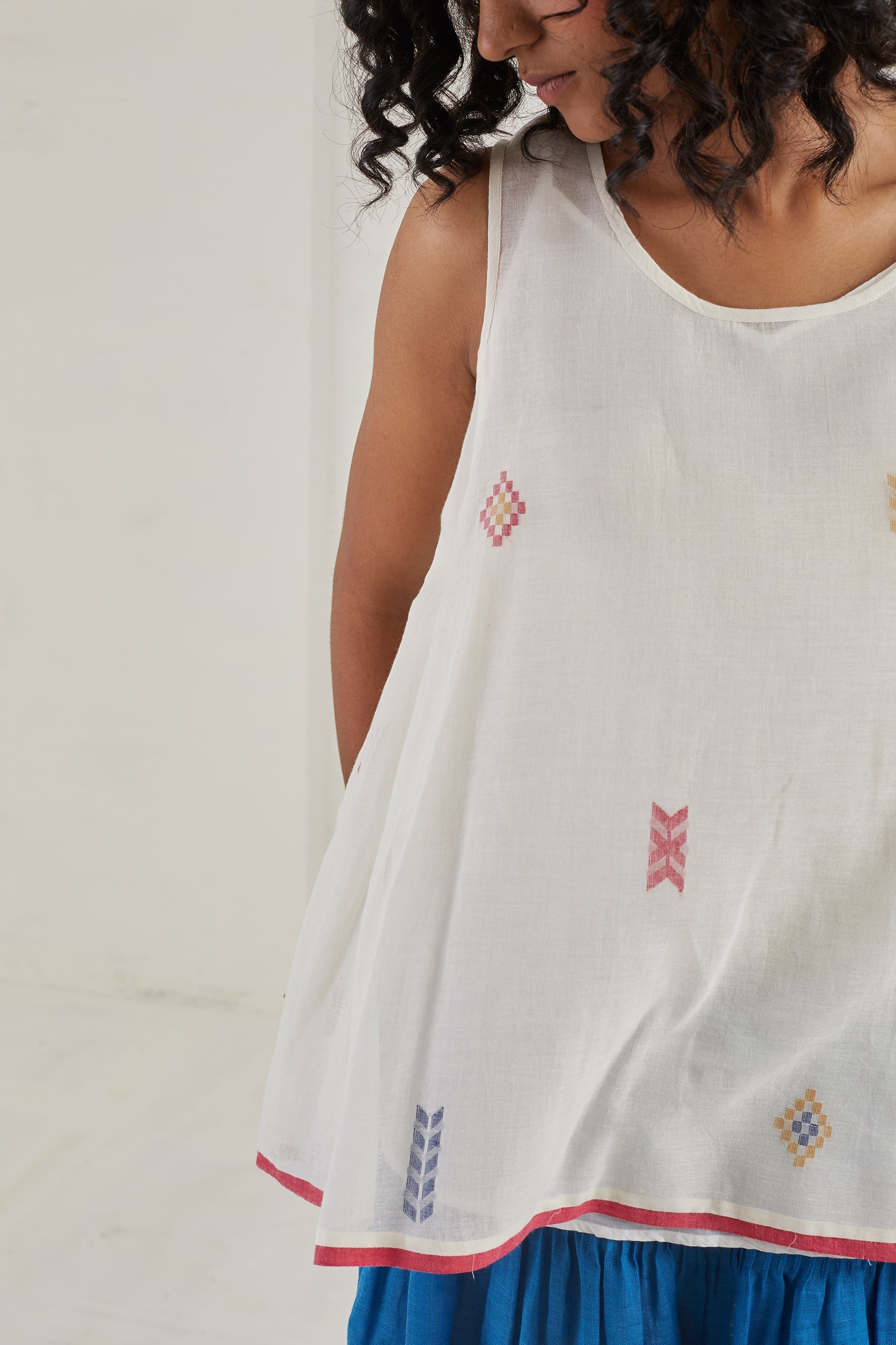 Sleeveless top in handloom cotton jamdani with multi-coloured geometric motifs, box pleats on the side and contrast selvedge on the hem