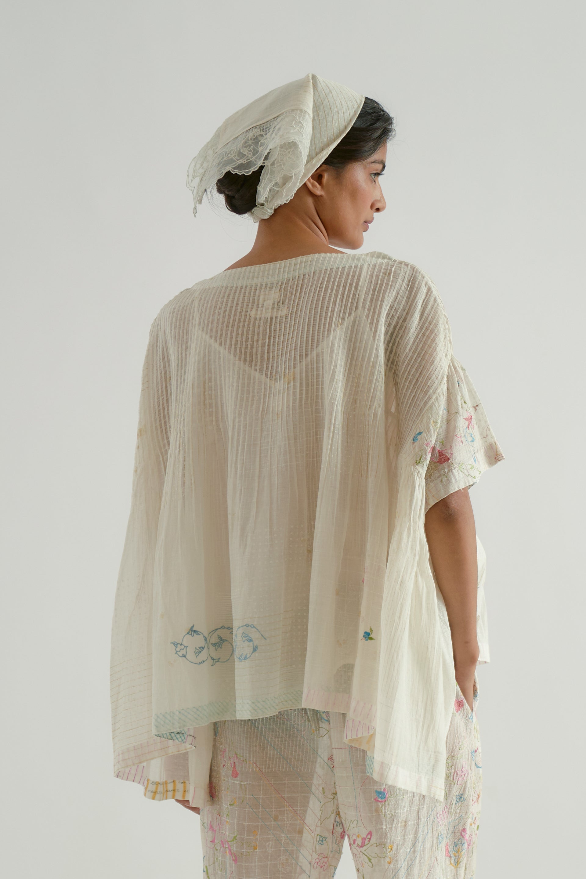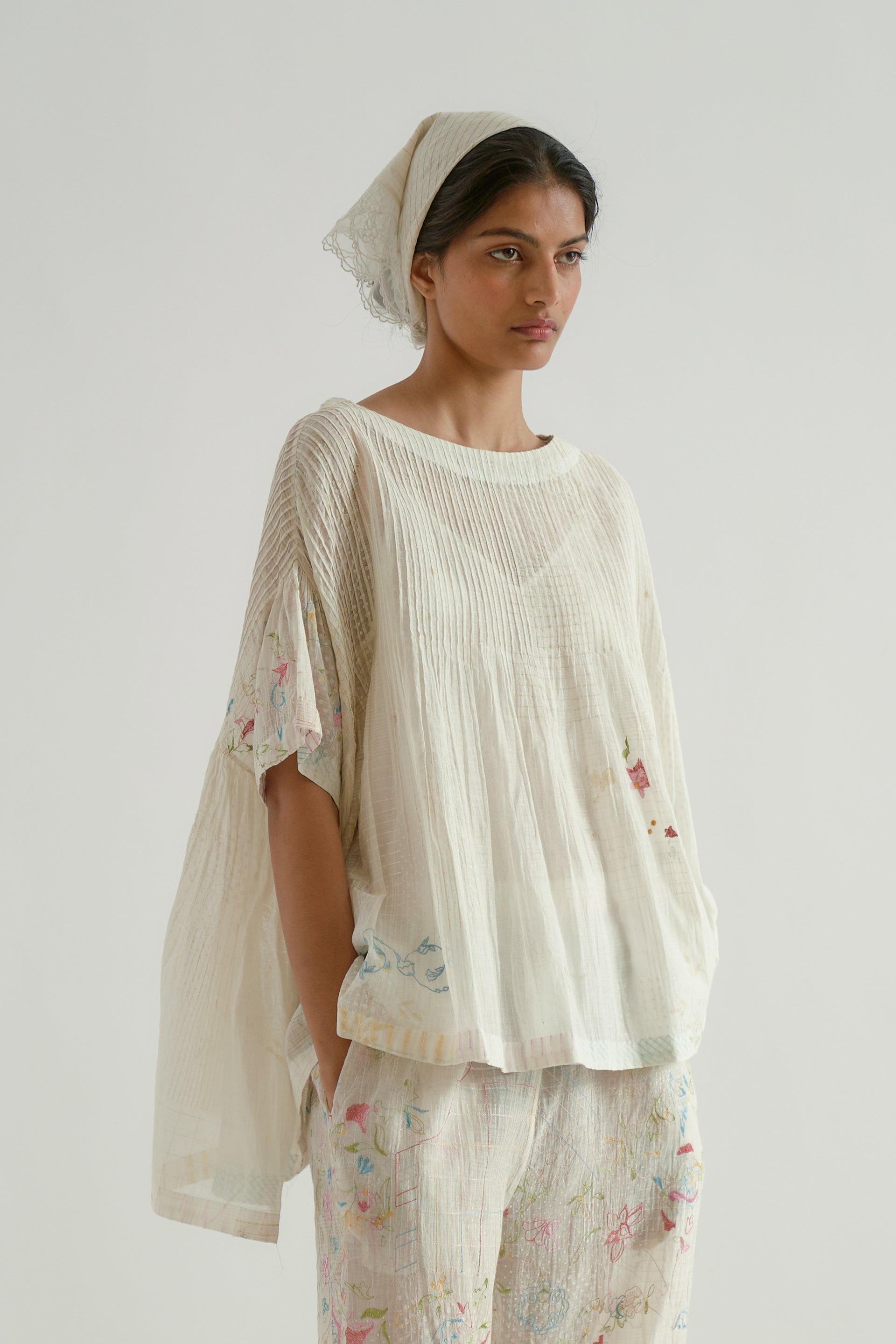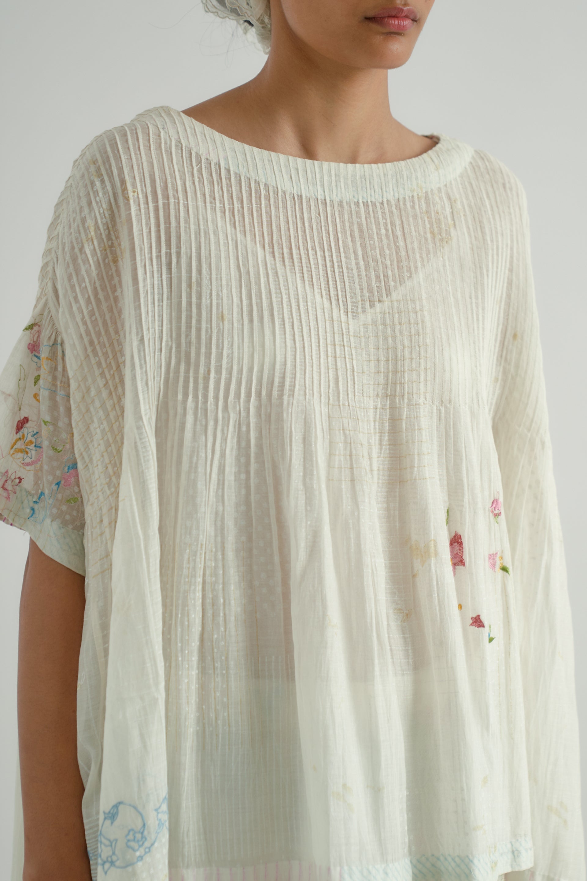 Oversized round-neck patchwork top featuring pintucks and gathers on the side panels, adding dimension and texture. Crafted from a 100% cotton-silk blend, the fabric showcases collage pattern of hand-block prints, beautifully complemented by scattered multicolor floral embroidery. The top is finished with a hand-block printed multicolor printed facing and comes with a separate cotton lining.
