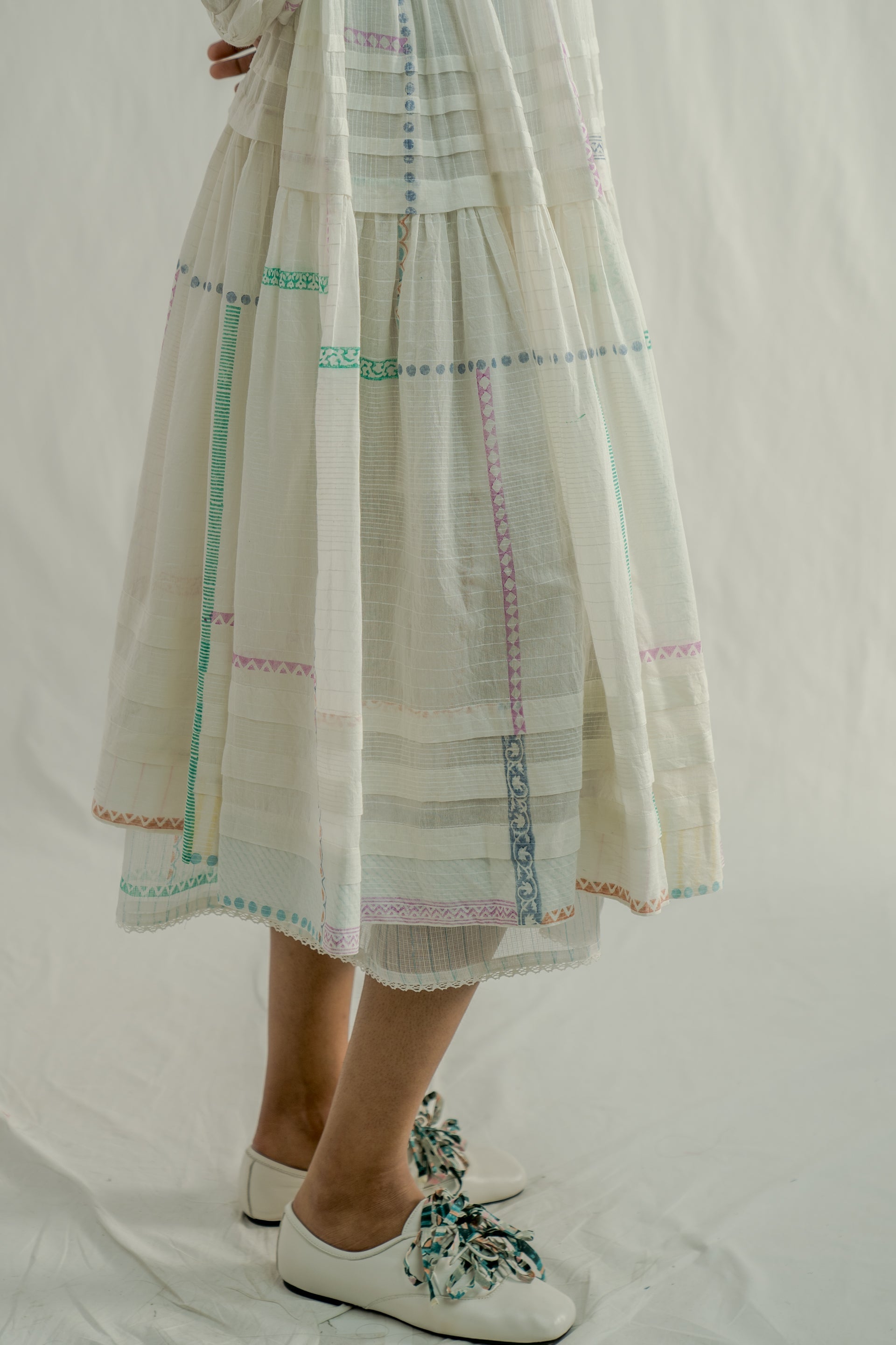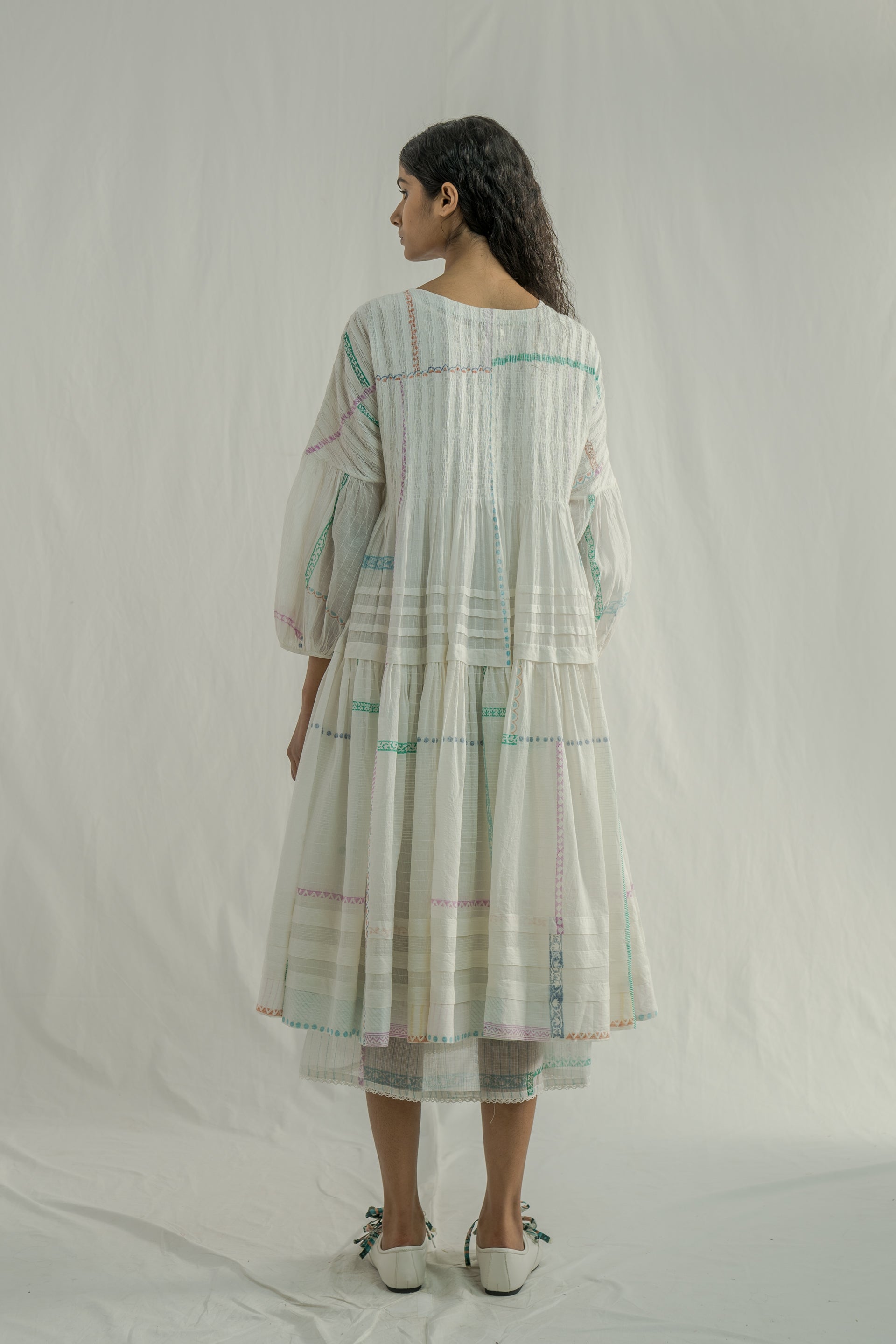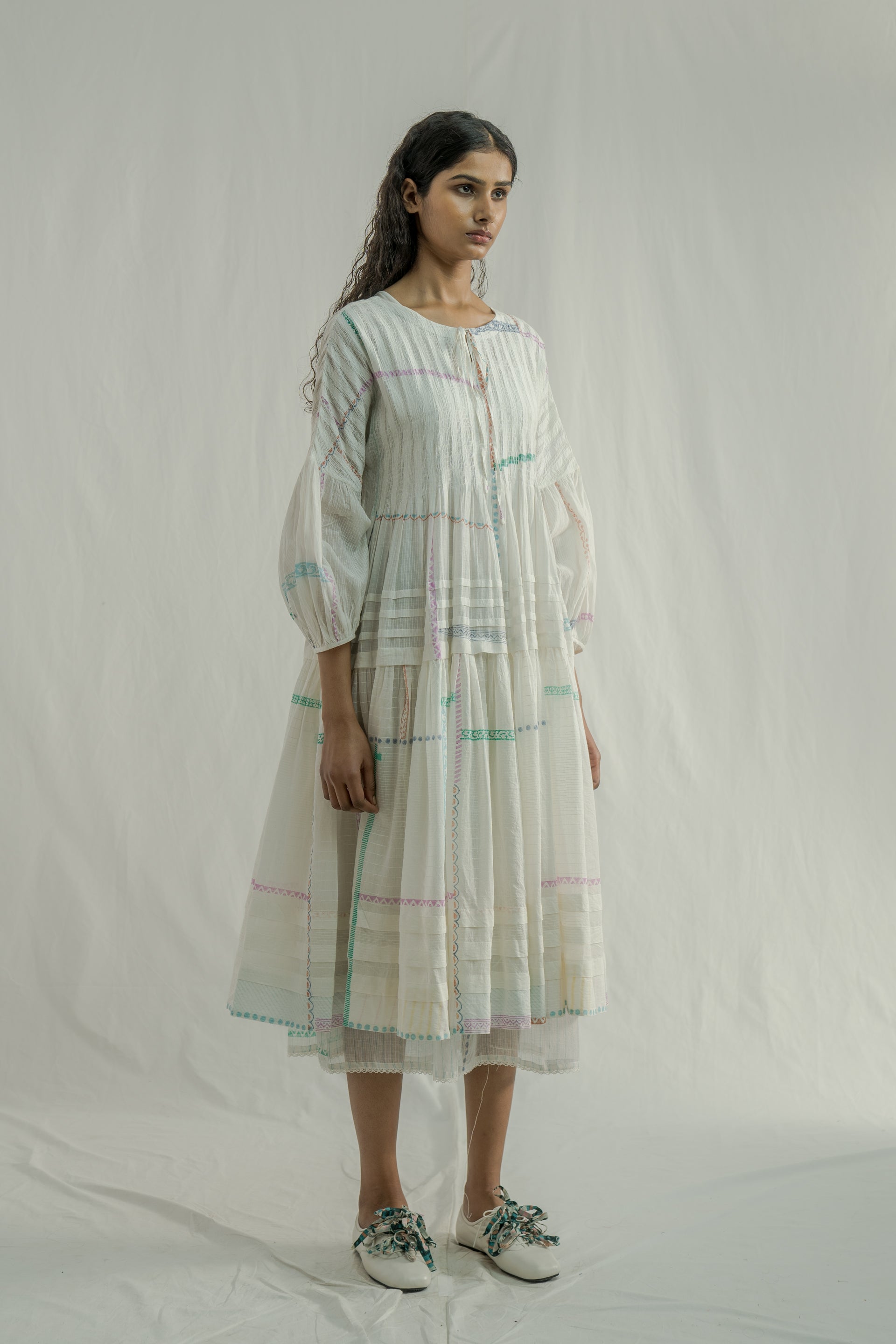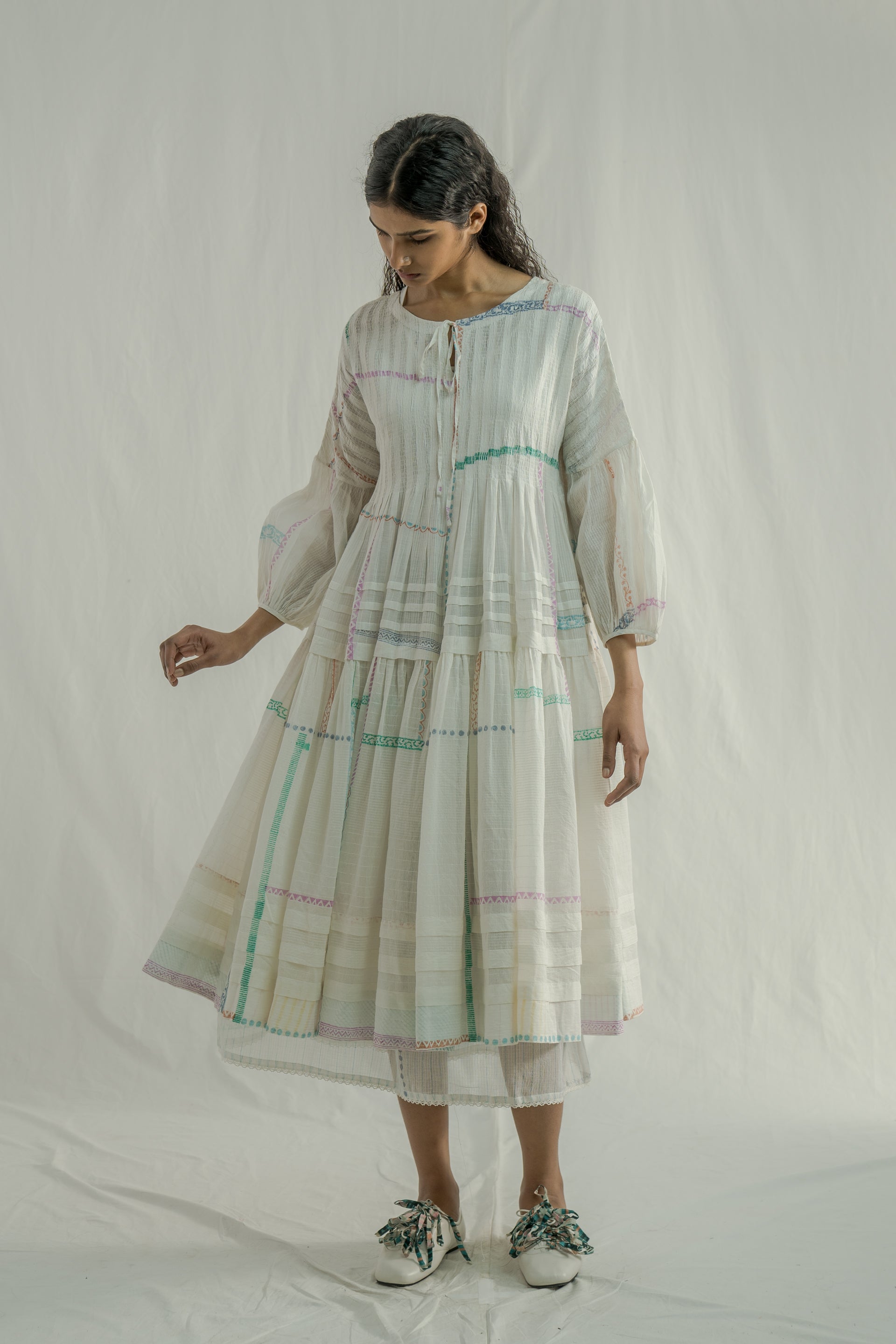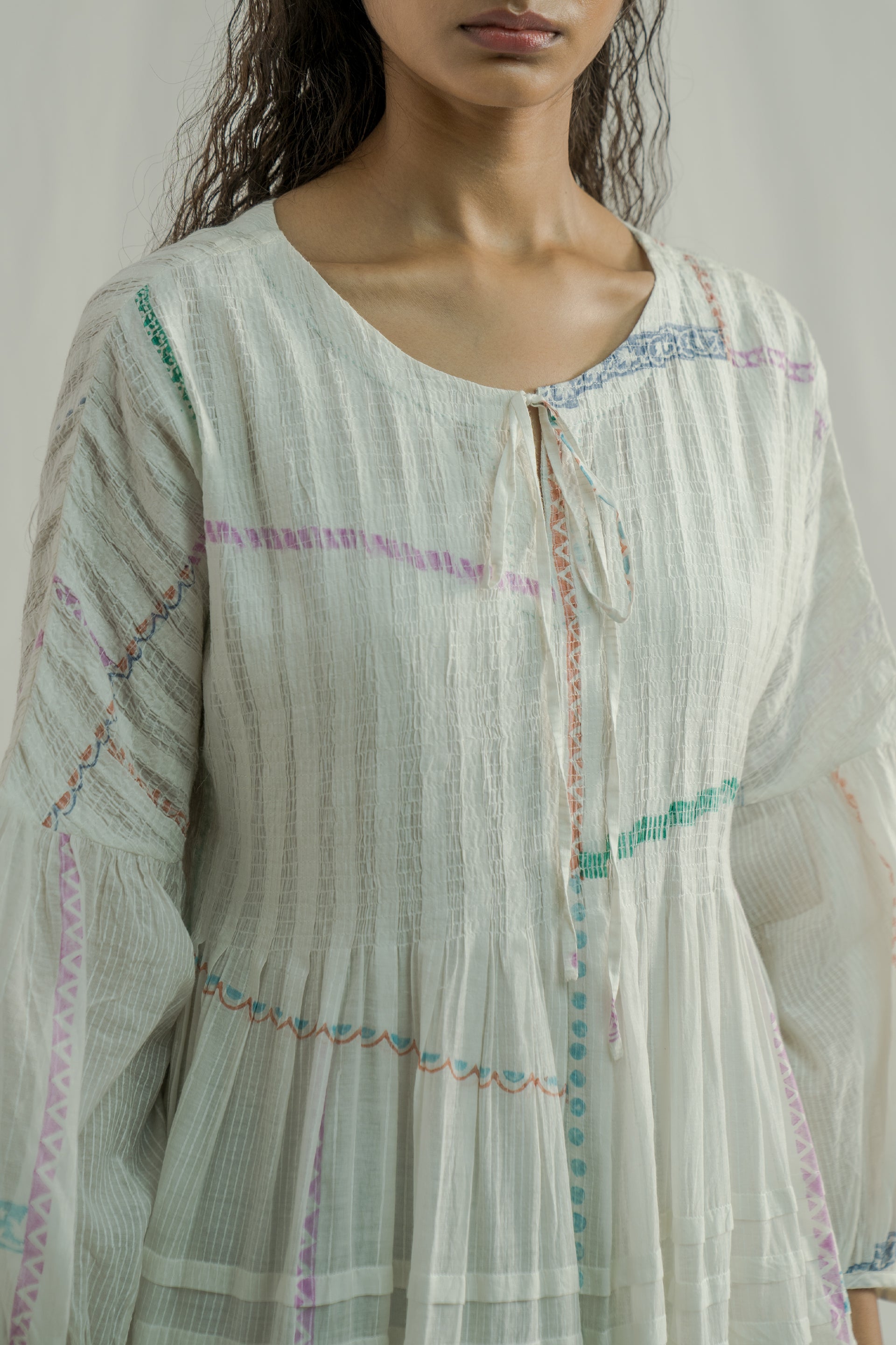 Tiered dress featuring ruching on the bodice, a tie-up detail at the neckline, and tucks along the hem and tiers. Expertly hand-cut to preserve the border design along the hem . Crafted from an all-over white-on-white striped and multi-grid hand-block printed cotton-silk blend fabric. The dress is completed with a separate cotton lining.