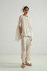 This patchwork midi-dress features a V-neckline, puff sleeves, and delicate gathers at the waist seam. It is beautifully finished with hand-block printed piping along the seams and an organza embroidery insert around the waist and the hem. Made from a 100% cotton-silk blend, the fabric showcases a tonal hand-block printed collage pattern, enhanced by scattered multicolor floral embroidery. The dress comes with a separate cotton lining.