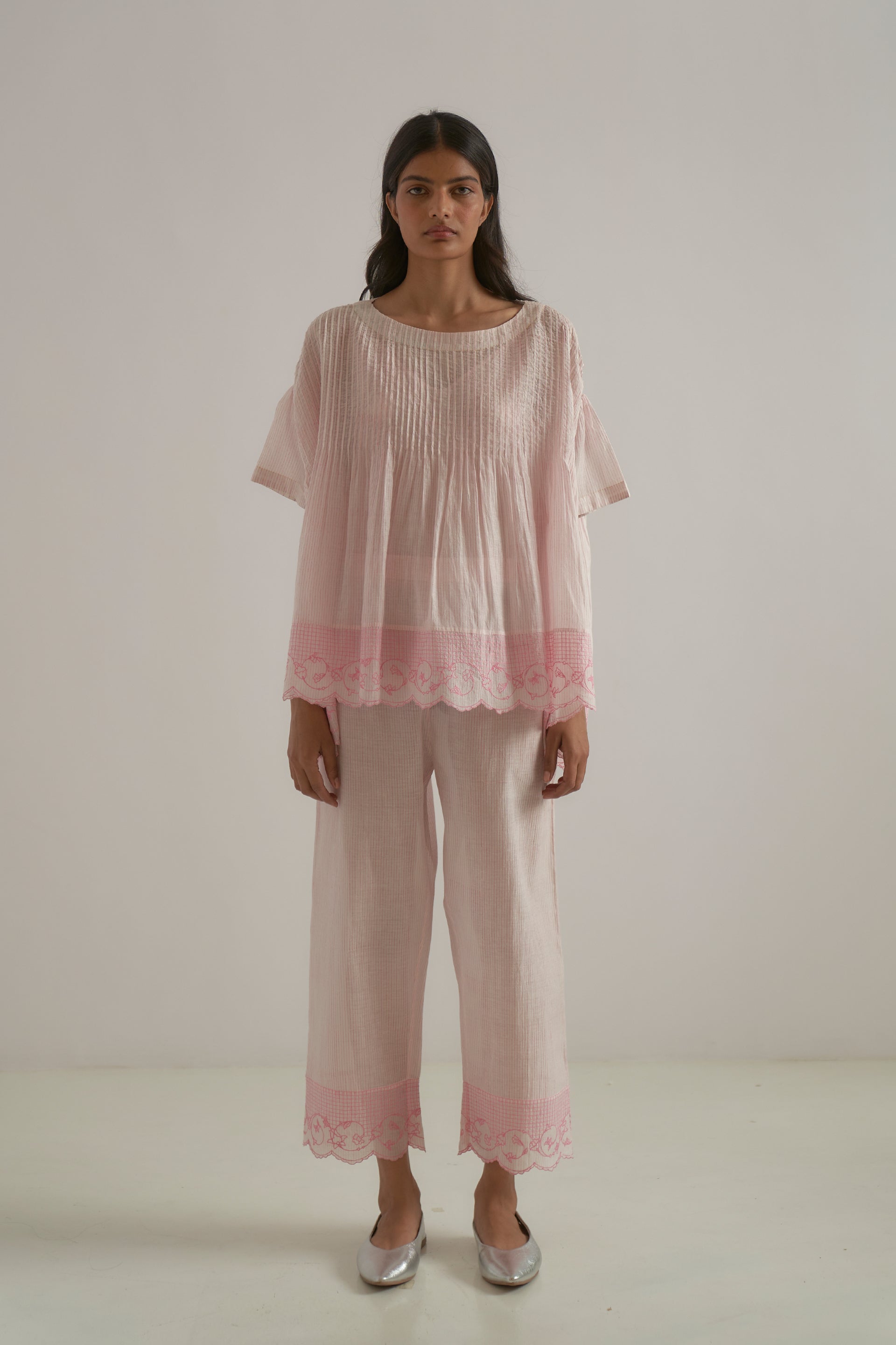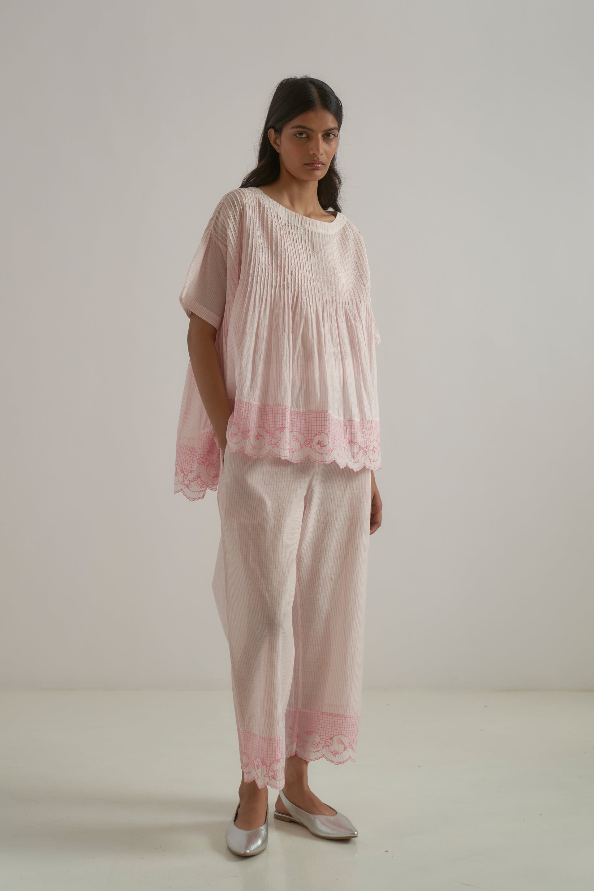 Oversized round-neck top featuring a unique patchwork design with pintucks and side gathers. Crafted from cotton-silk blend, it showcases a pin-striped hand-block print with an embroidered floral border. It also comes with a separate lining.