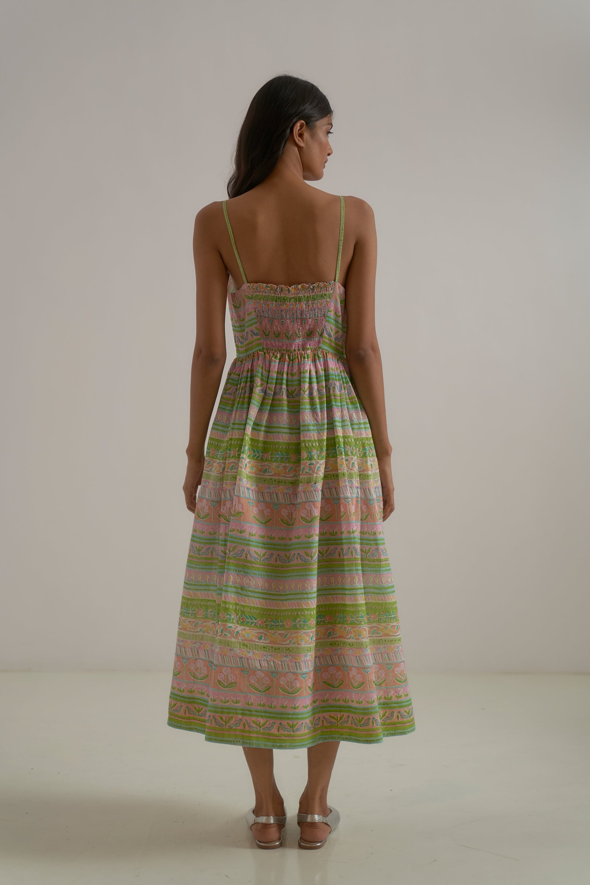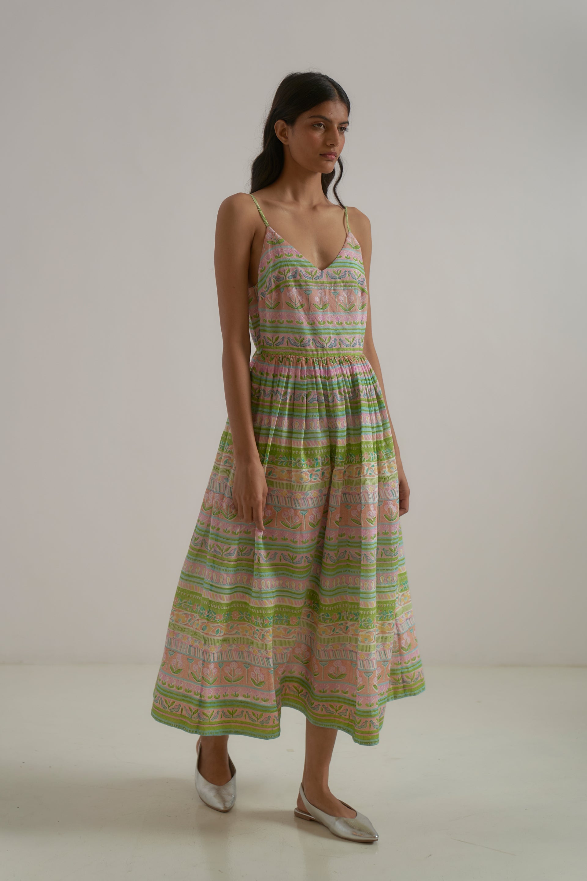 A midi-length sleeveless dress with spaghetti straps, featuring an elasticated back detail for a comfortable fit. Crafted from a cotton-silk blend fabric, this dress showcases a vibrant multicolor allover panel handblock print. it also comes with an attached handblock printed lining.