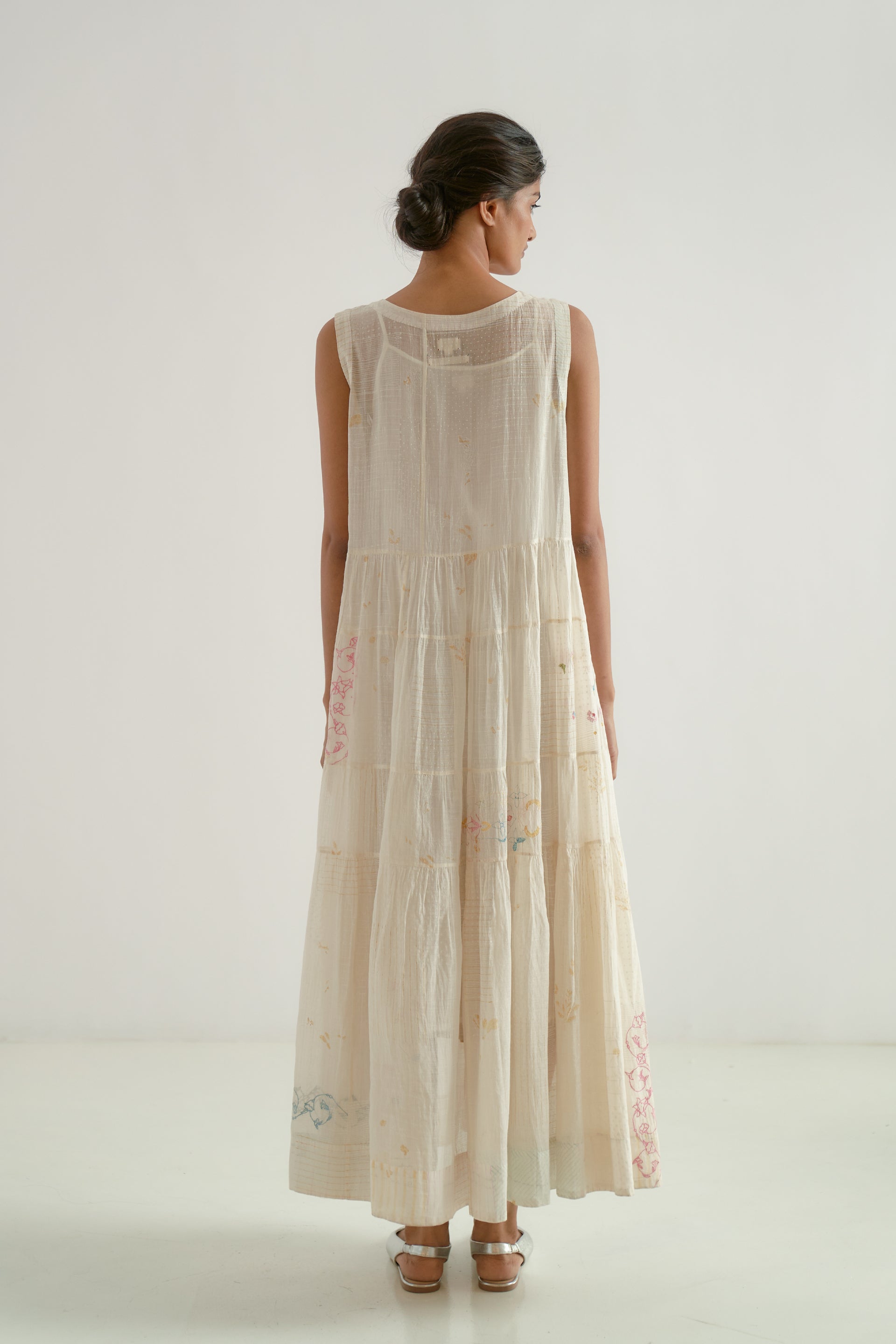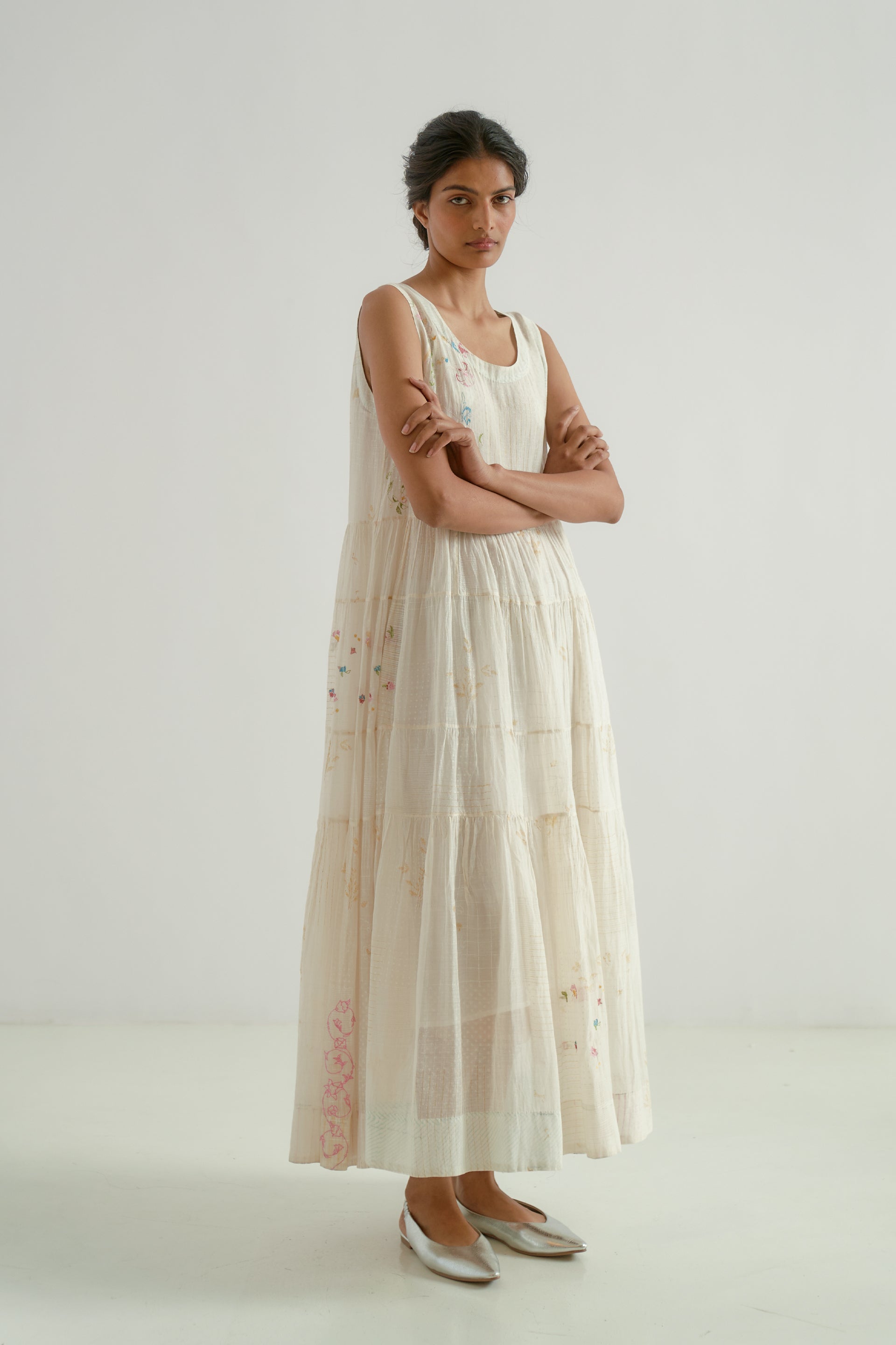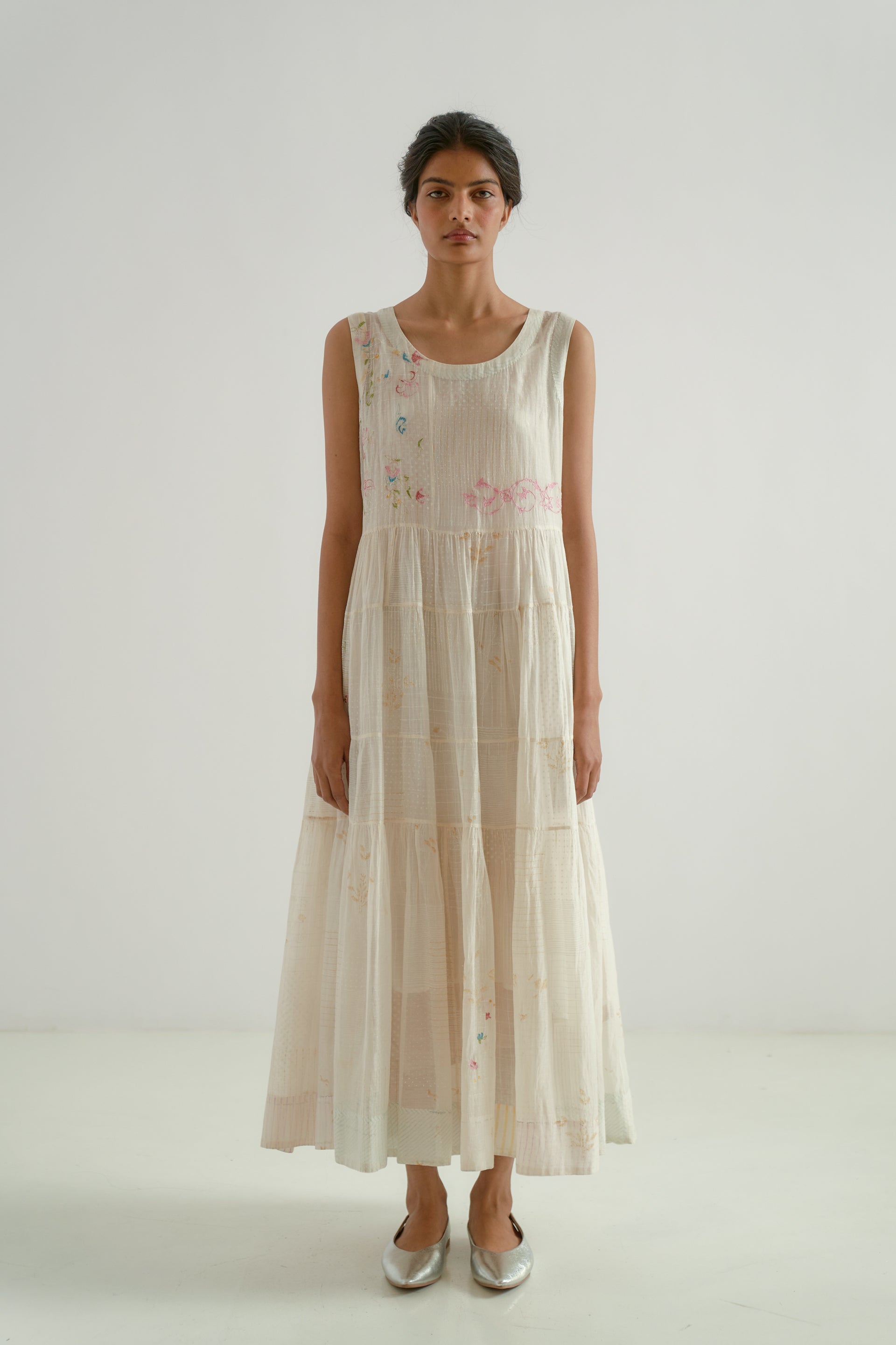 This round-neck, sleeveless midi dress features gathered patchwork tiers and a scalloped hem detail. Crafted from a 100% cotton-silk blend, the fabric showcases a tonal hand-block printed collage pattern, beautifully enhanced by scattered multicolor floral embroidery. The dress is finished with a separate cotton lining.