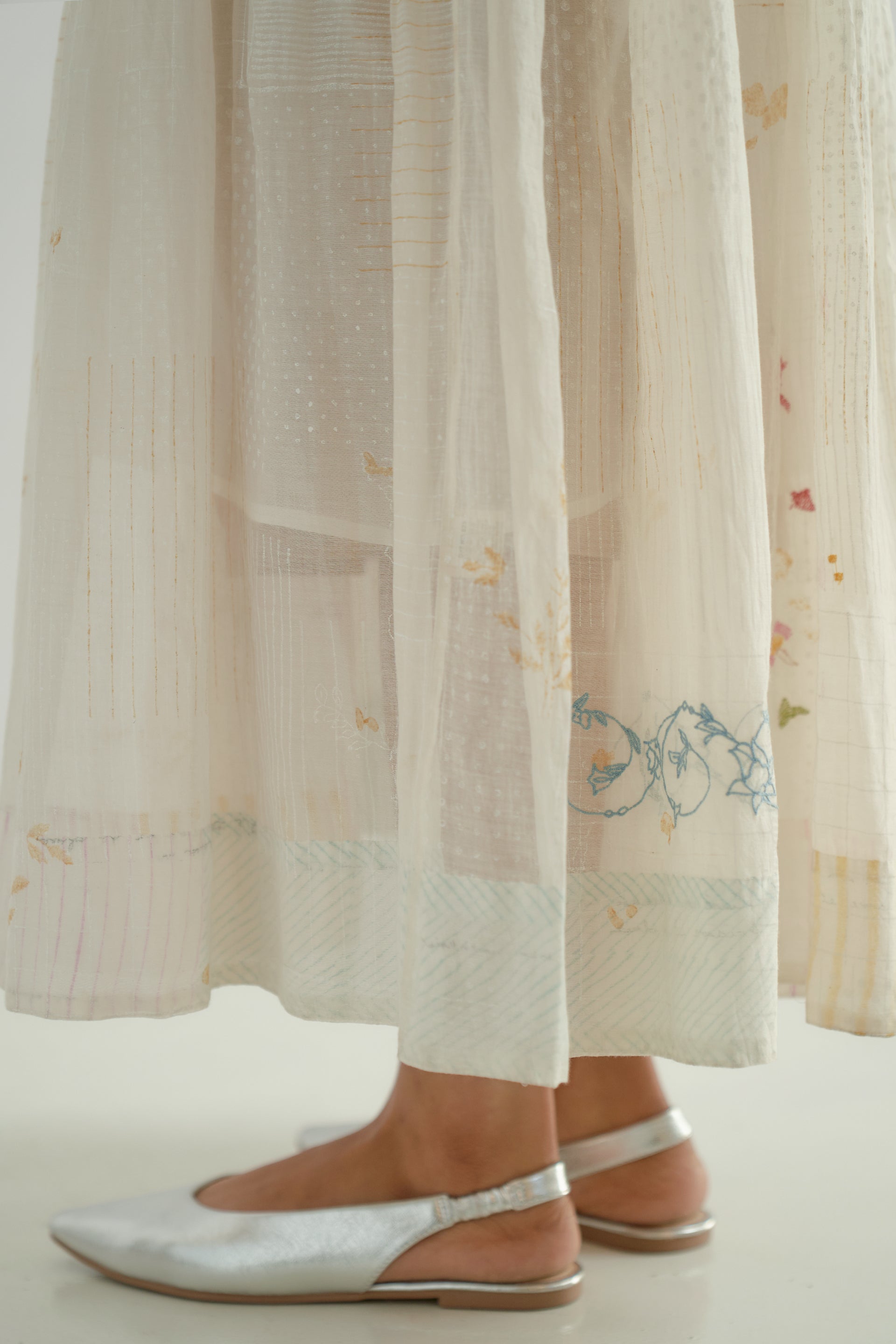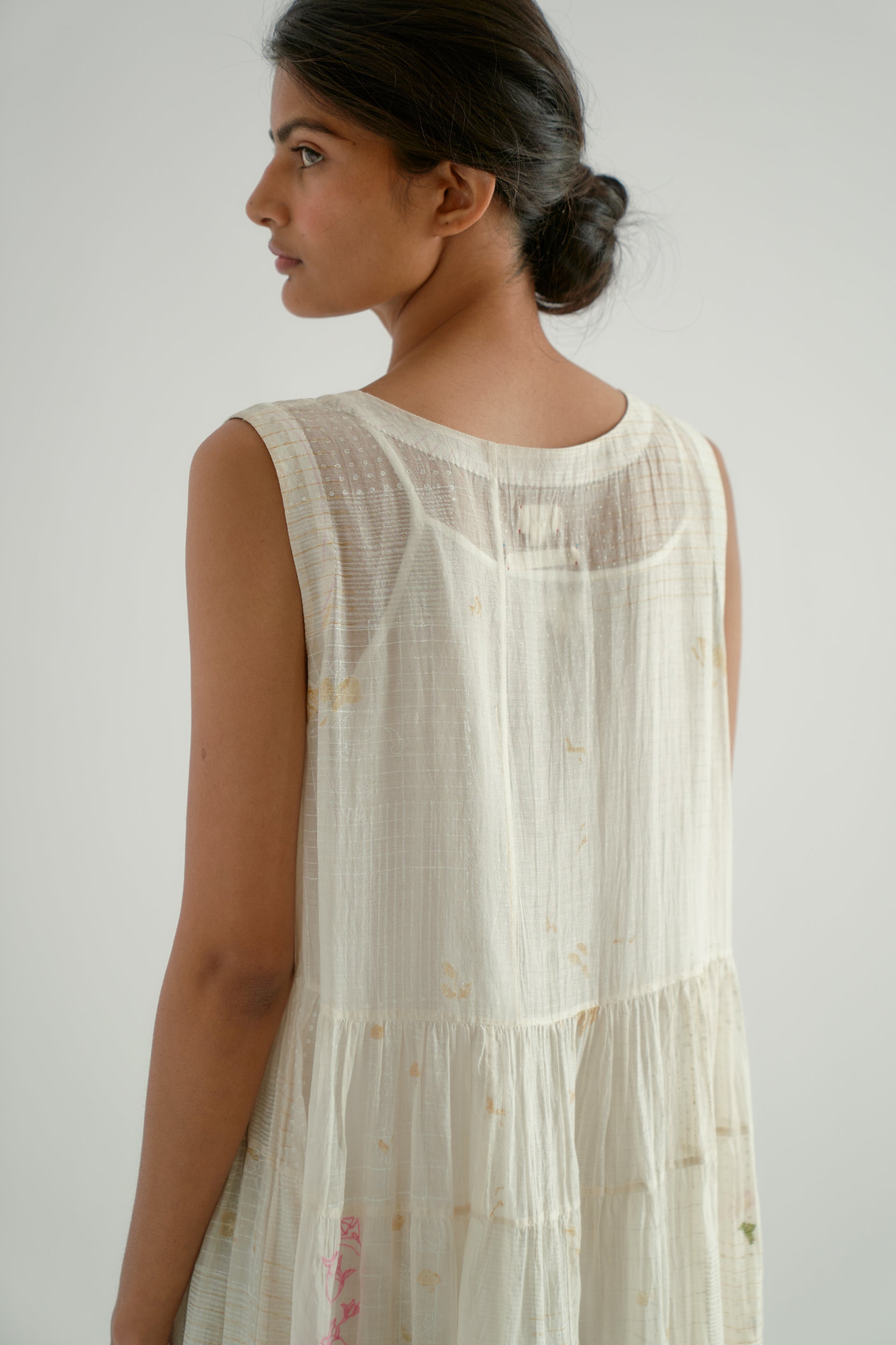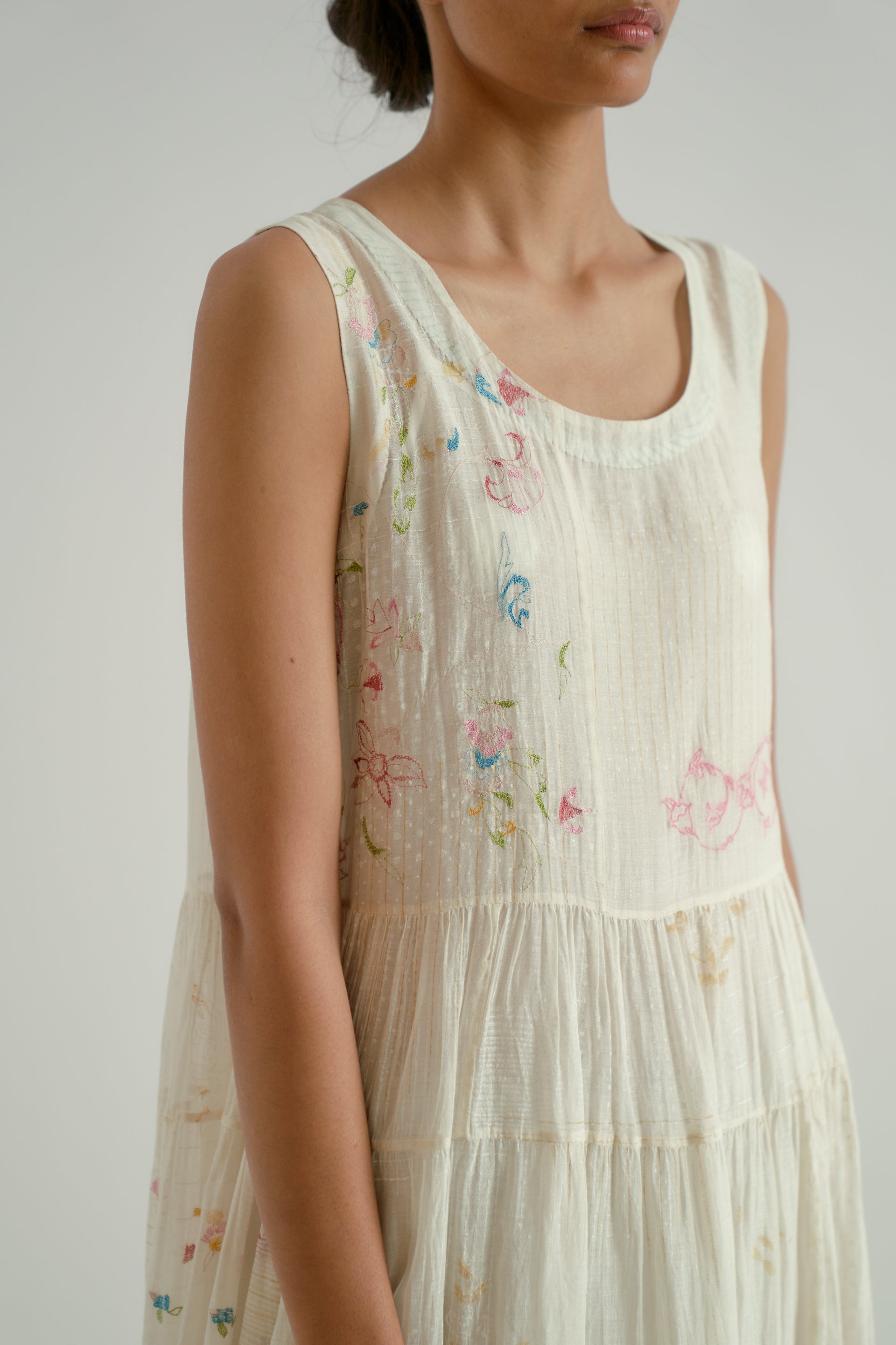 This round-neck, sleeveless midi dress features gathered patchwork tiers and a scalloped hem detail. Crafted from a 100% cotton-silk blend, the fabric showcases a tonal hand-block printed collage pattern, beautifully enhanced by scattered multicolor floral embroidery. The dress is finished with a separate cotton lining.