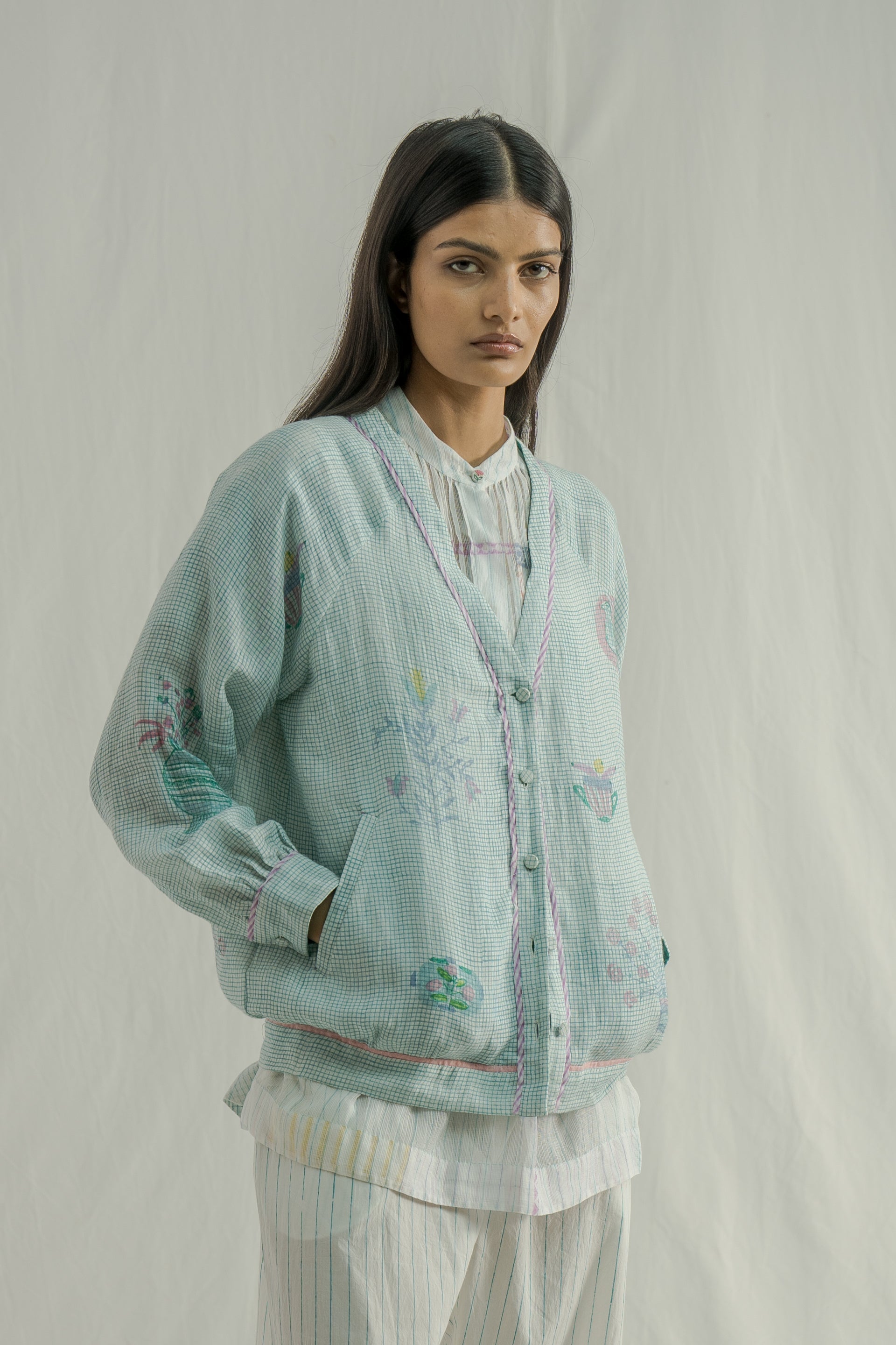 Short bomber front-open button-down jacket with a v-neckline and contrast selvedge detail. crafted from fine checks and multicolor placement handblock print, made with 100% linen fabric