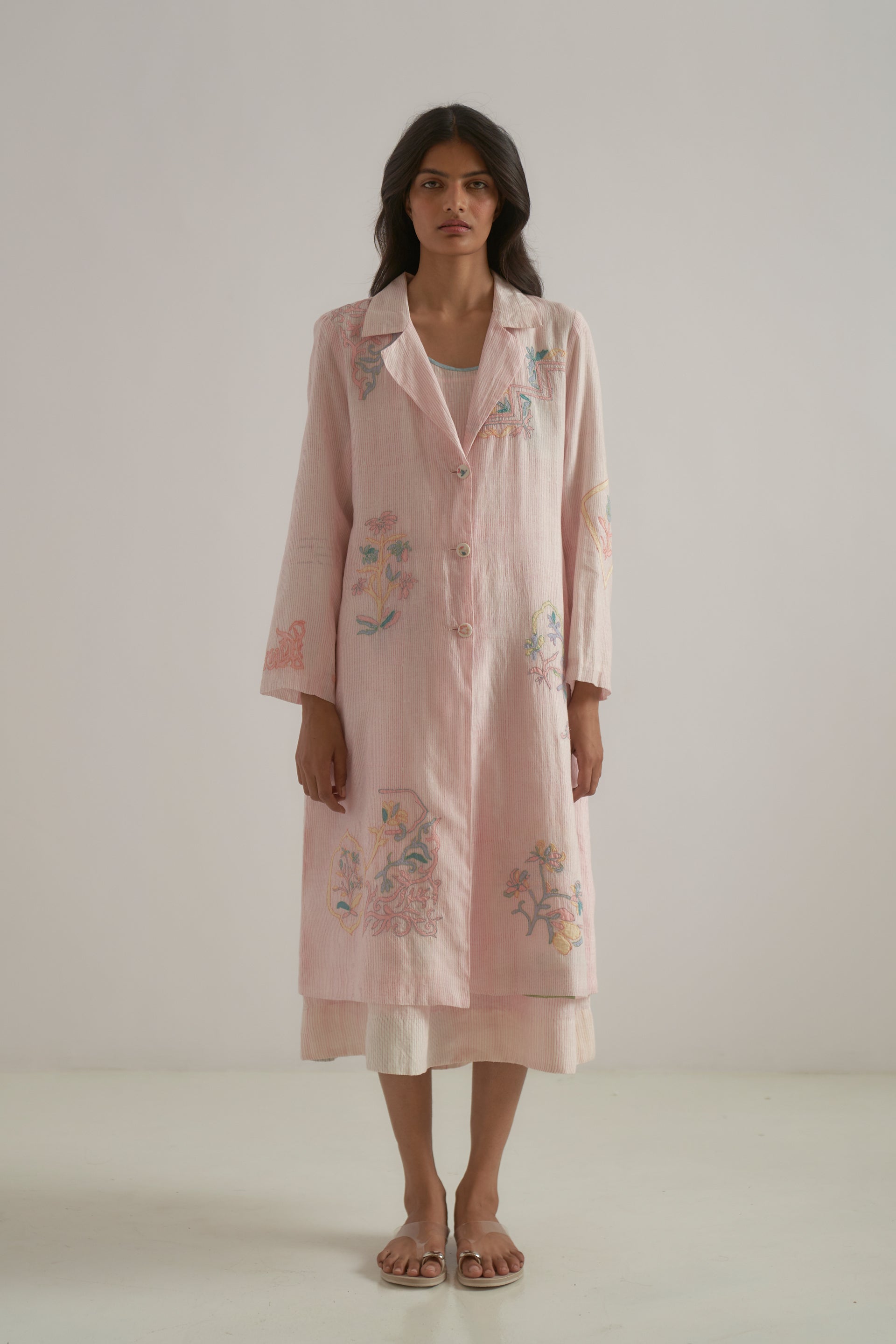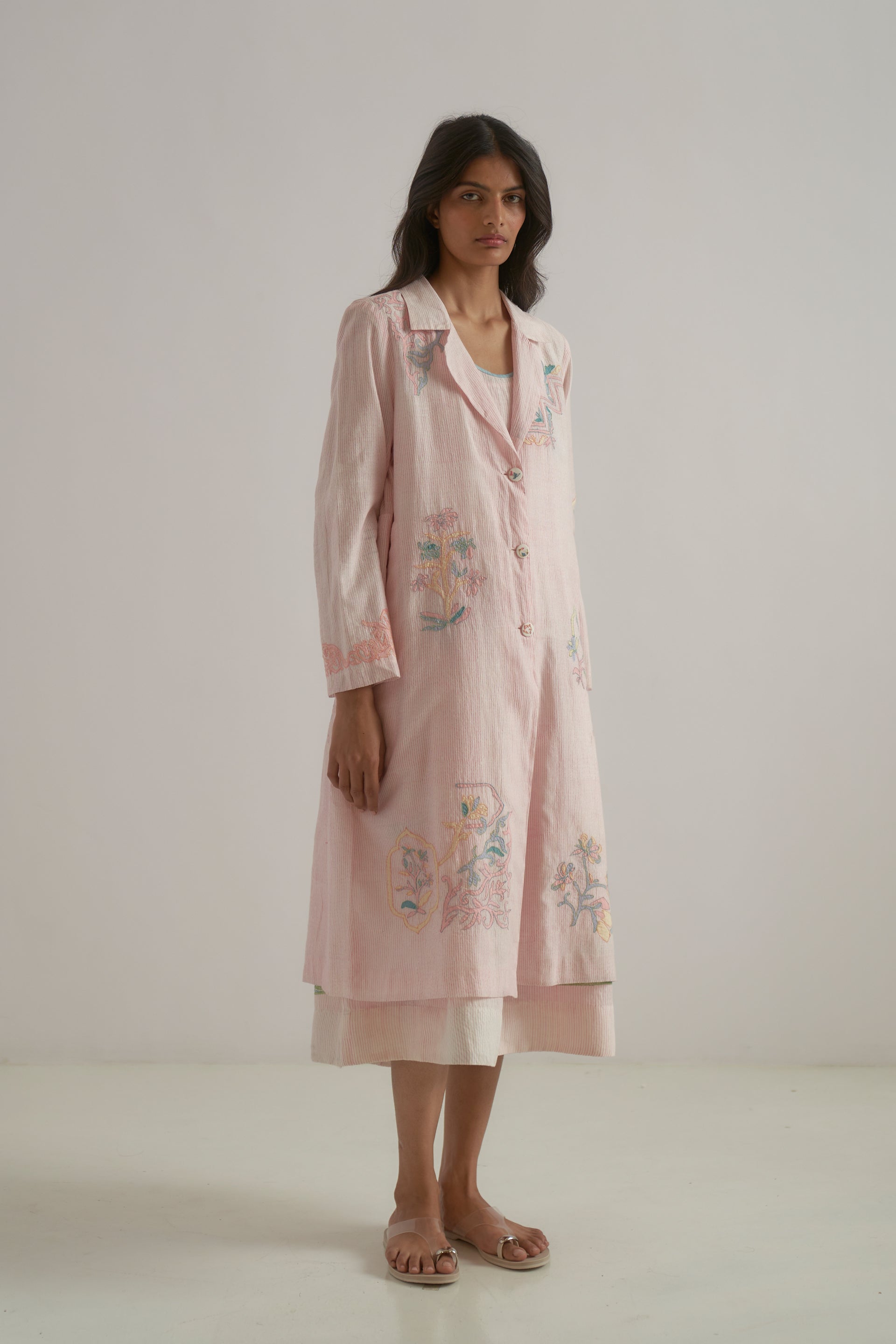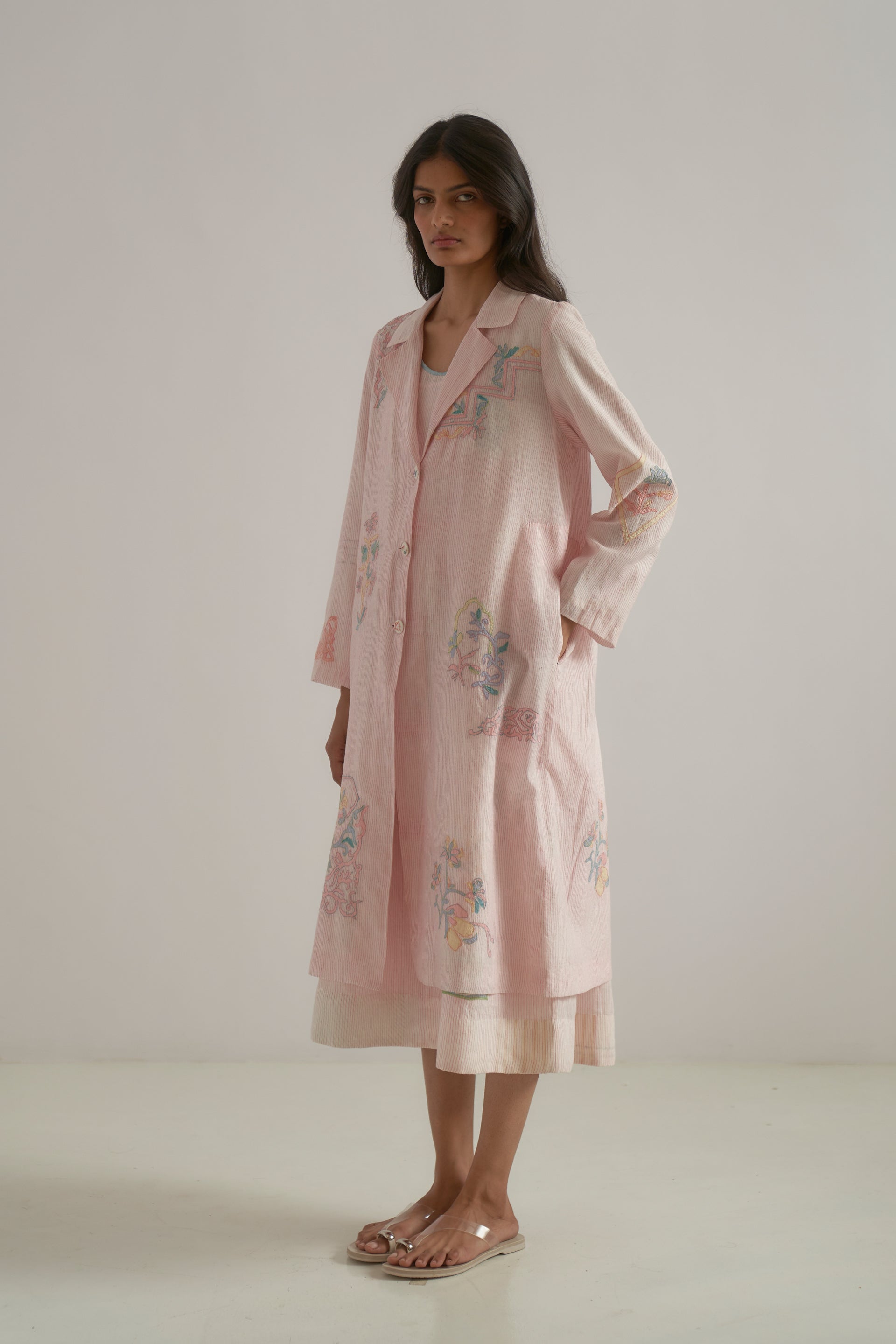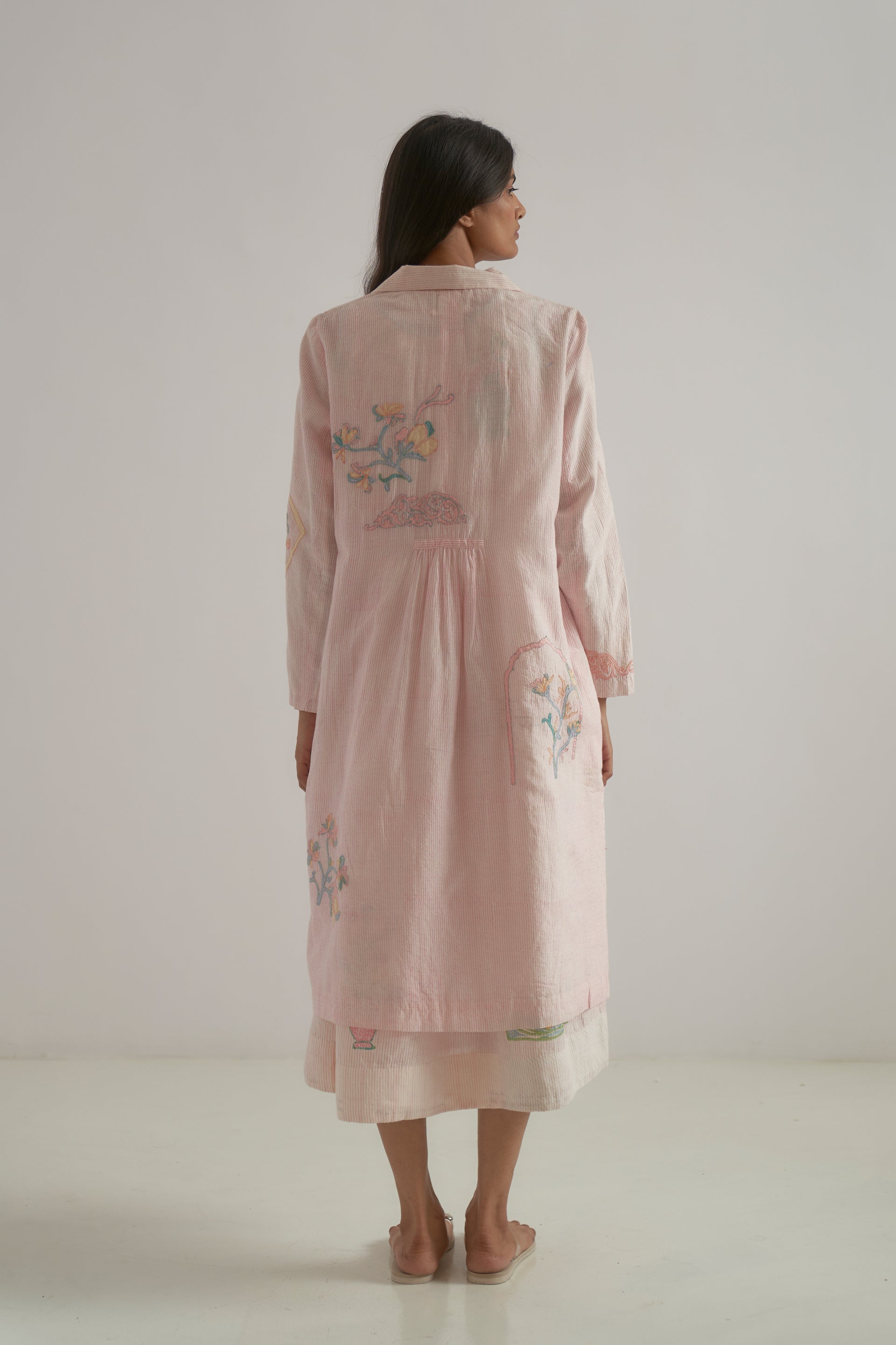 Notch collar front-open long straight jacket with contrast selvedge insert detail, crafted from fine handblock print stripes and contemporary multicolor placement applique motifs all over. Made from a cotton-silk blend fabric, it comes with an attached handblock print cotton-silk lining