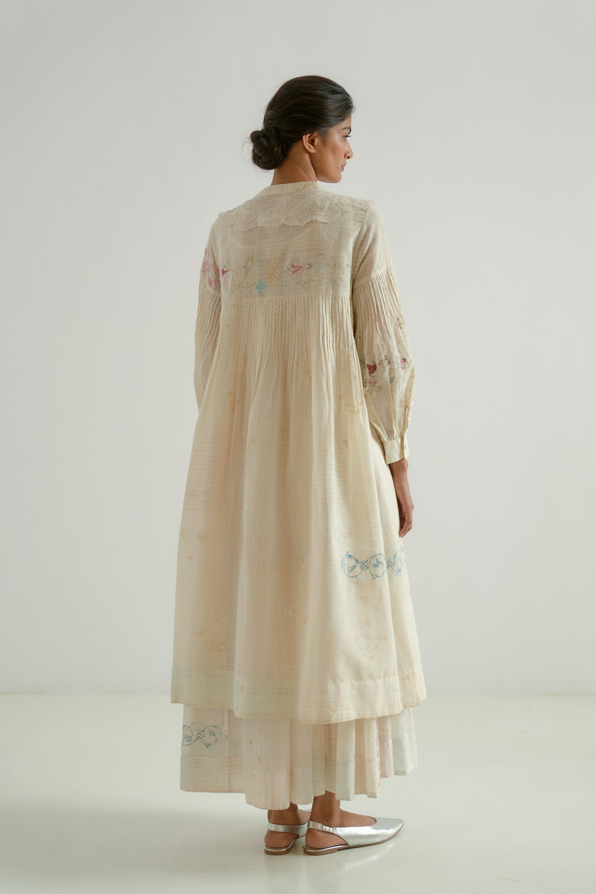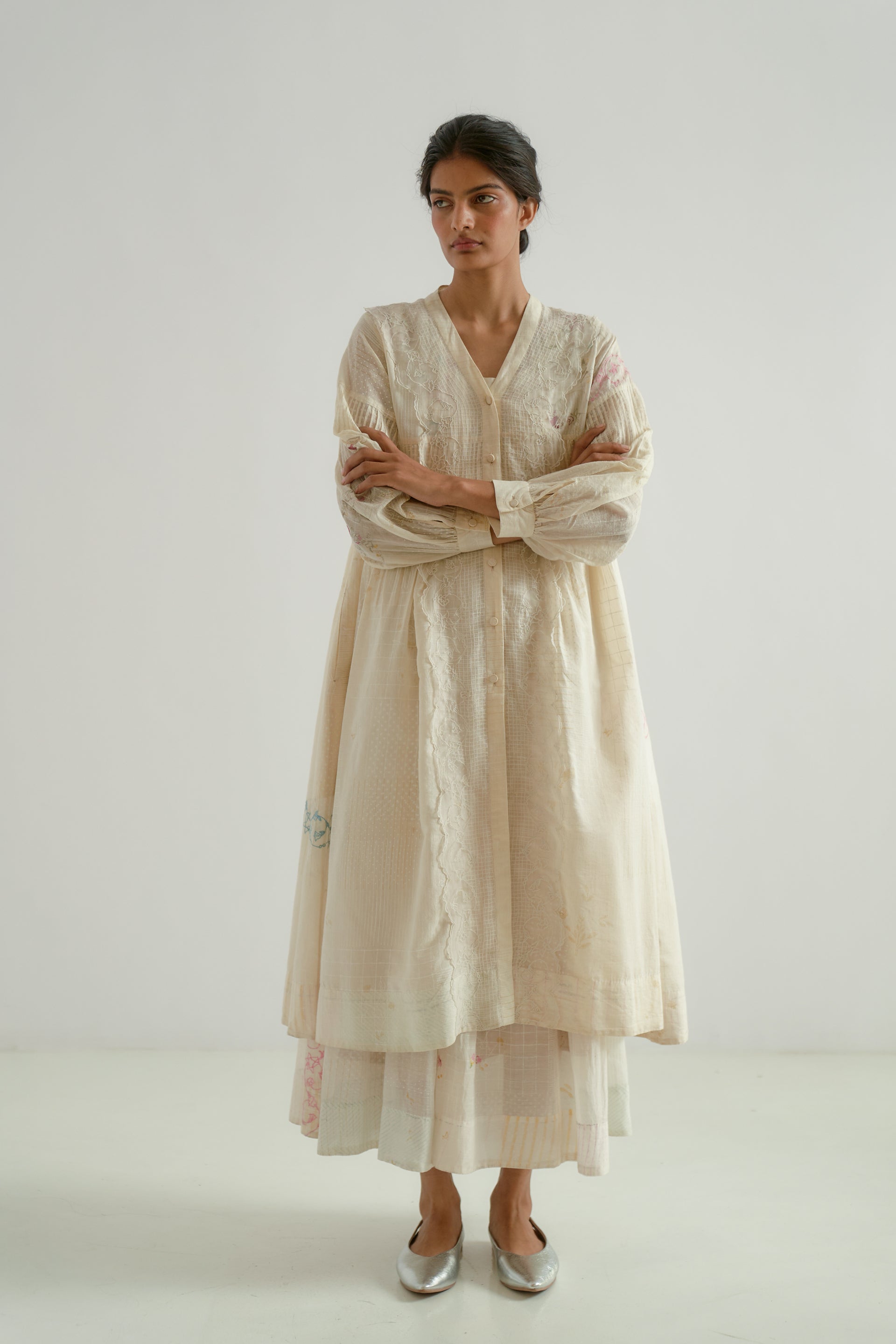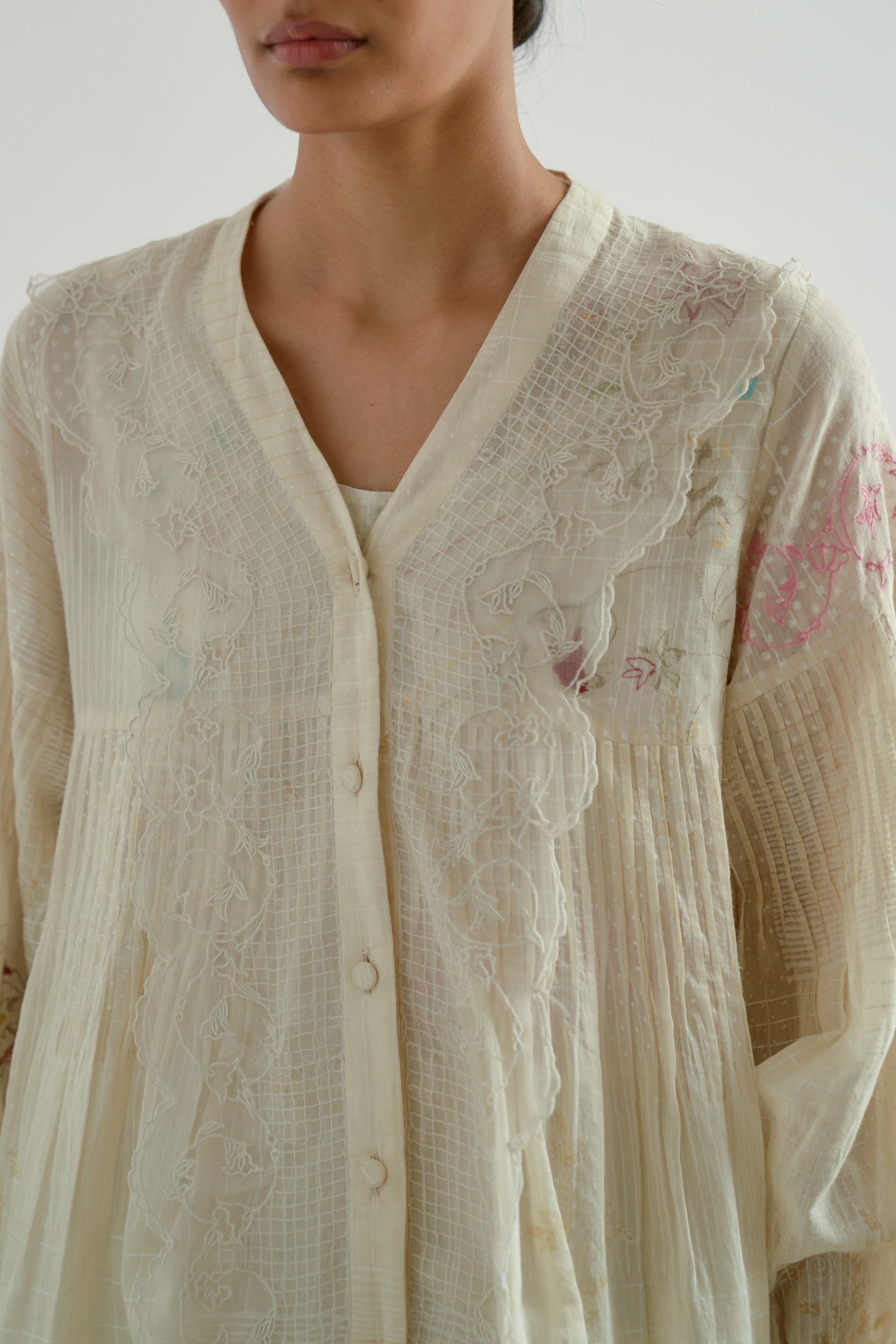 A front-button V-neck dress with pintucks detailing on the bodice and lace inserts along the placket. Featuring hand-cut embroidered inserts and a cotton-silk blend fabric with a hand-block printed collage pattern , beautifully accented by scattered multicolor floral embroidery. The dress has a separate cotton-silk lining with organza trim for a delicate finish.