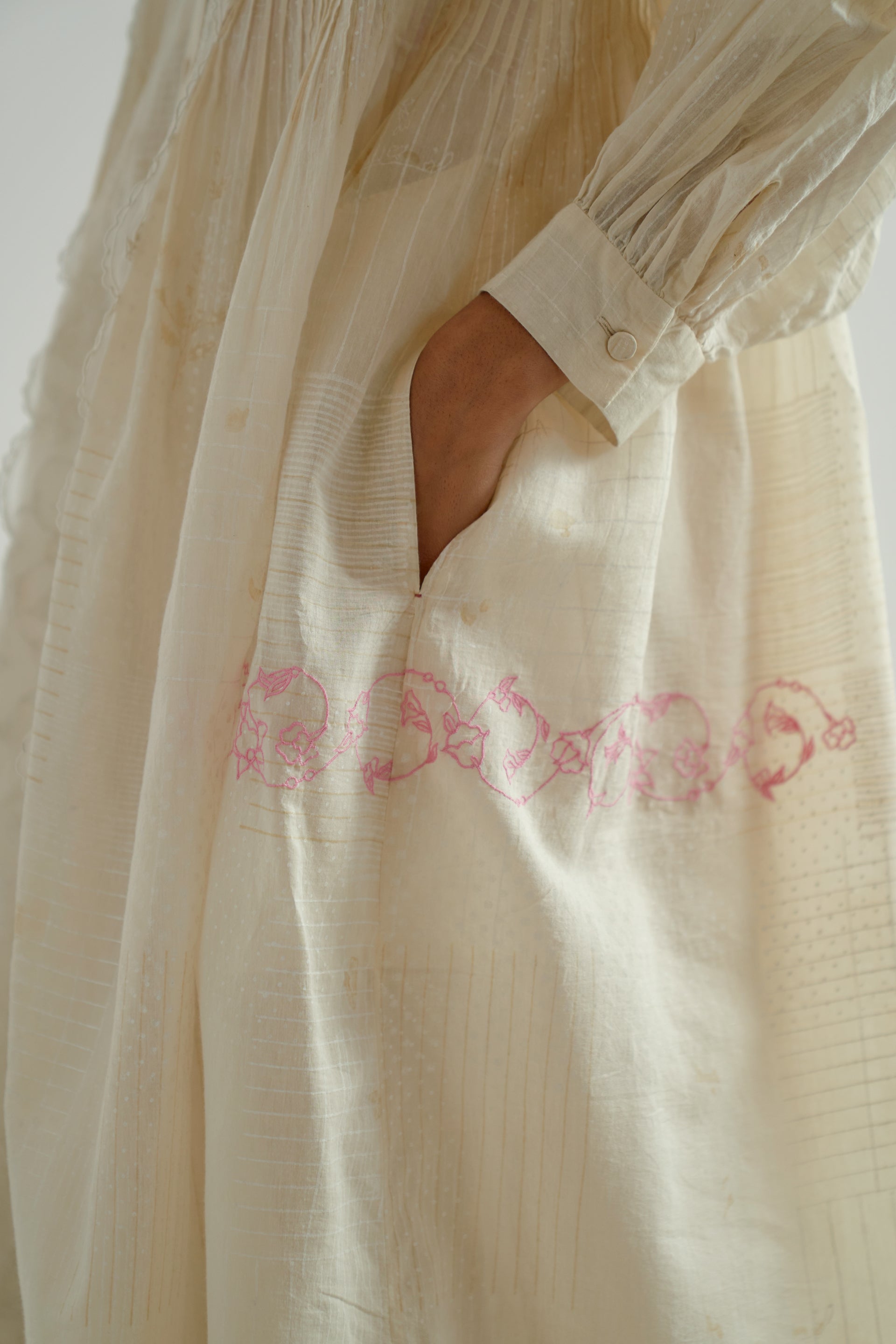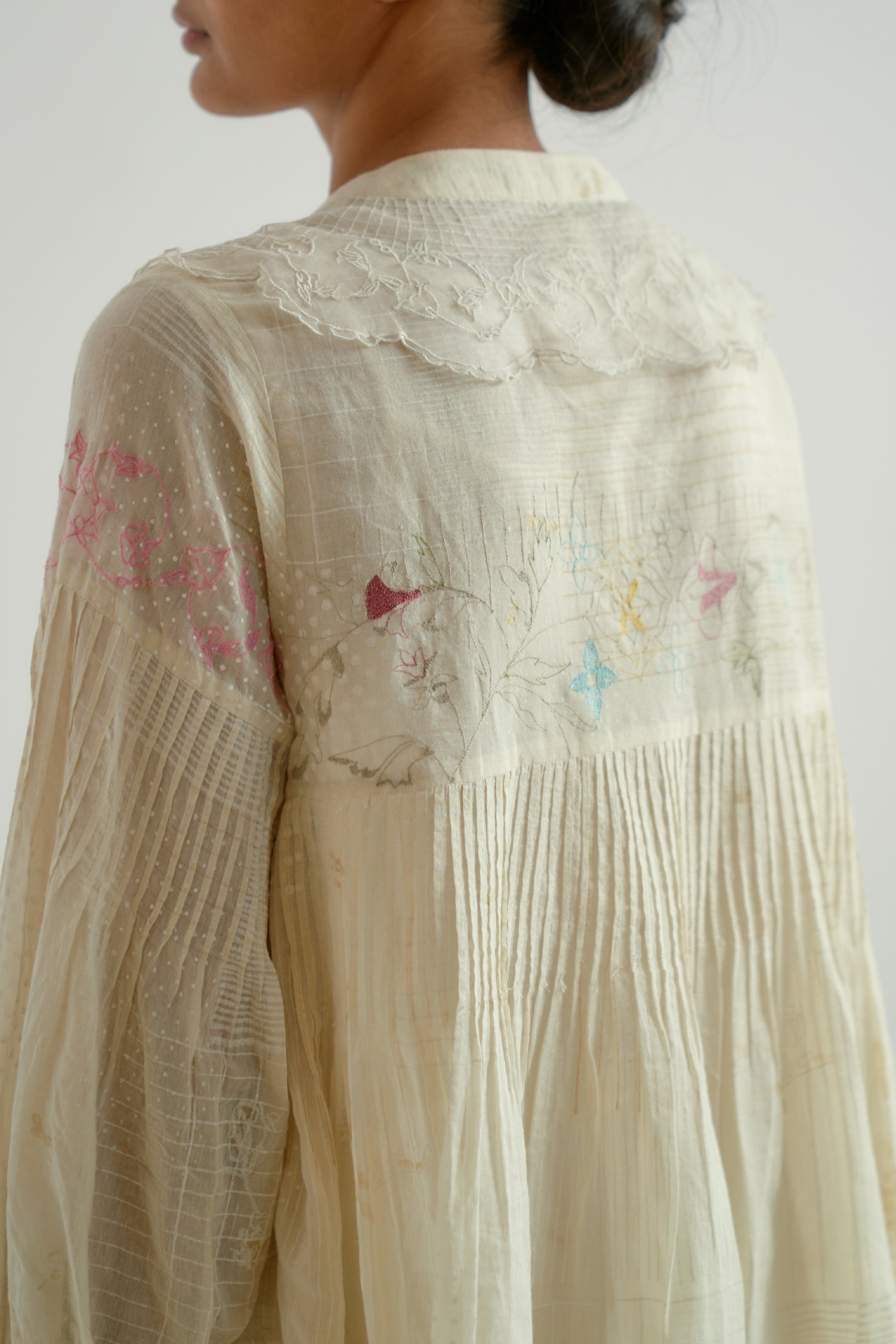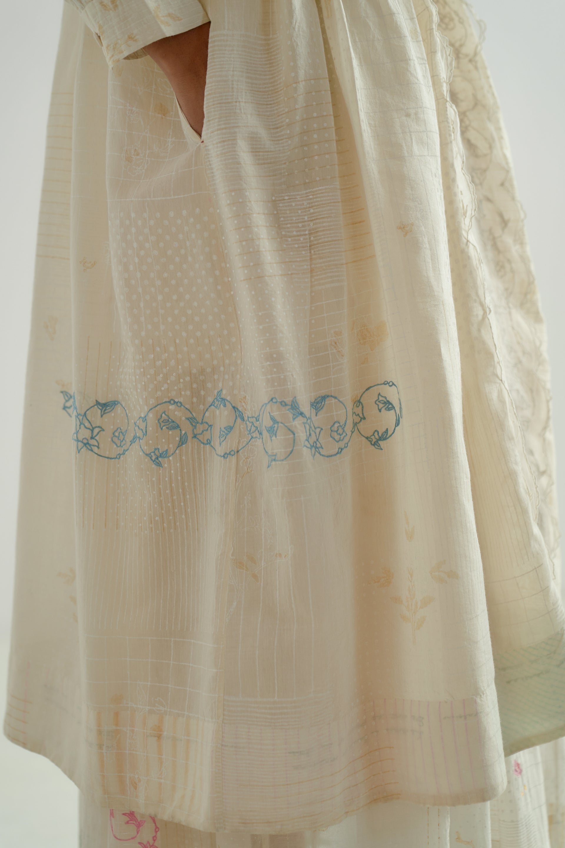 A front-button V-neck dress with pintucks detailing on the bodice and lace inserts along the placket. Featuring hand-cut embroidered inserts and a cotton-silk blend fabric with a hand-block printed collage pattern , beautifully accented by scattered multicolor floral embroidery. The dress has a separate cotton-silk lining with organza trim for a delicate finish.