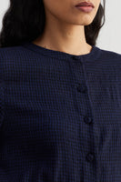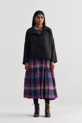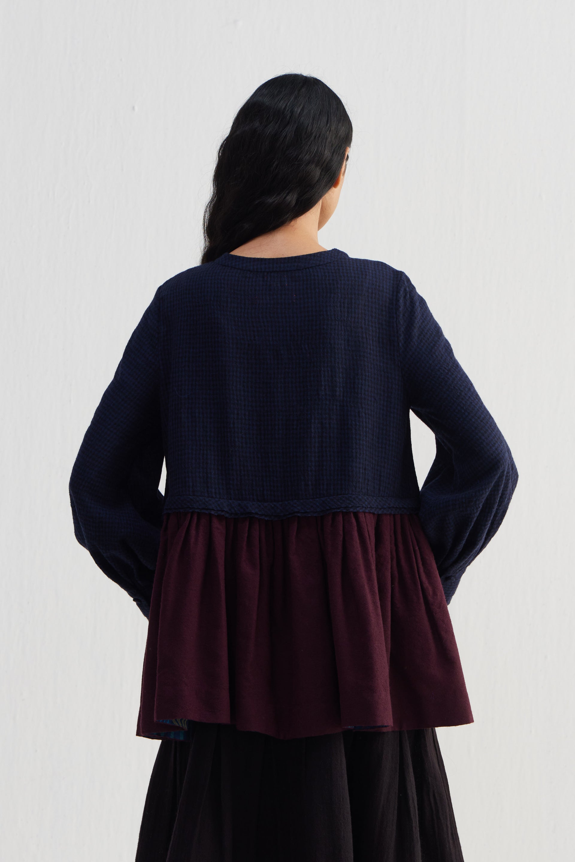 Round neckline front placket relaxed fit full sleeves top with light puff and gathers at waist detail. Constructed in colour block 100% merino wool fabric. Finished with contrast handblock print 100% silk binding detail on cuffs, hem and facing detail.