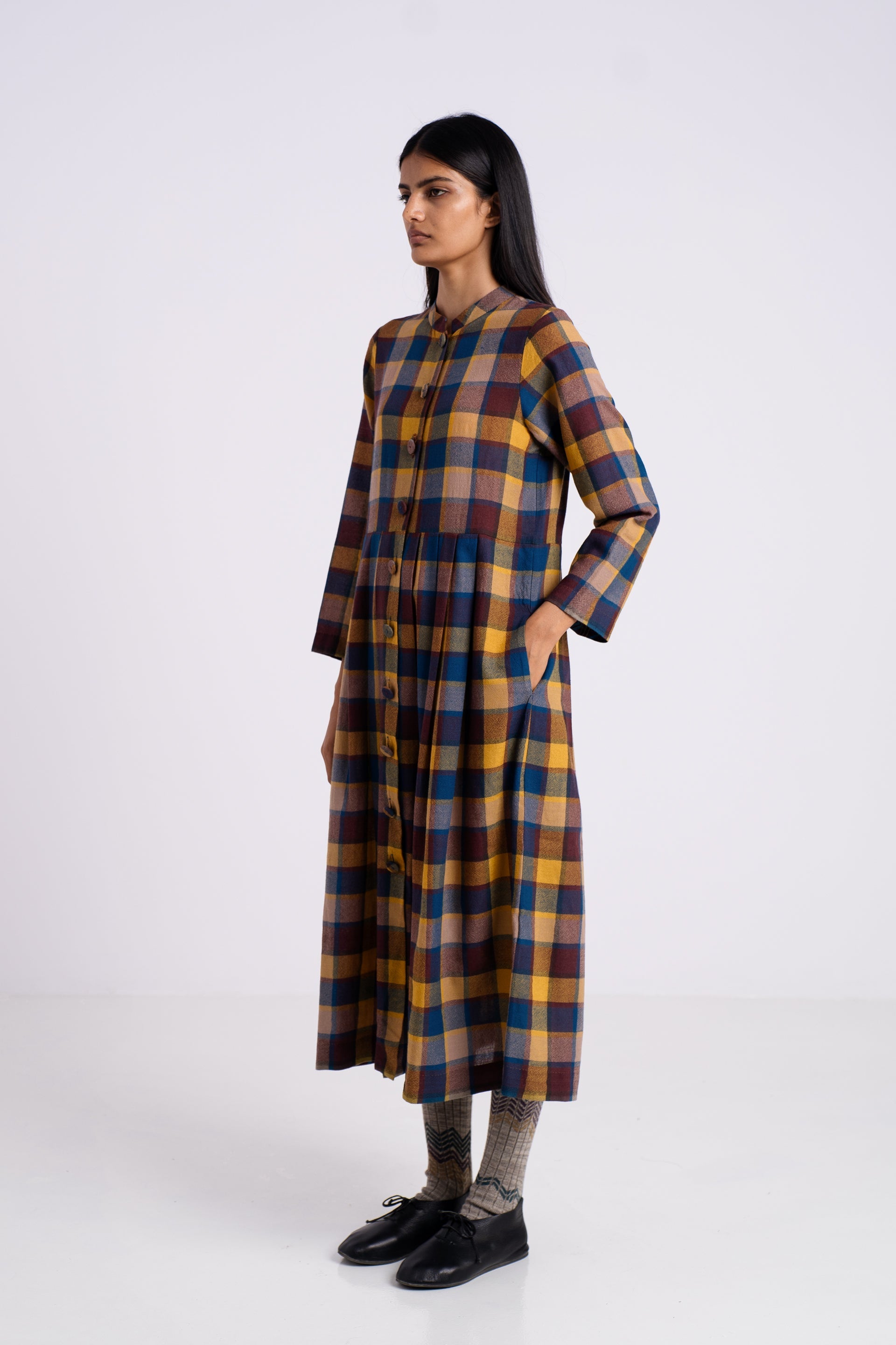 Front open pleated dress in 100% merino wool with embroidered button detailing .