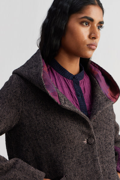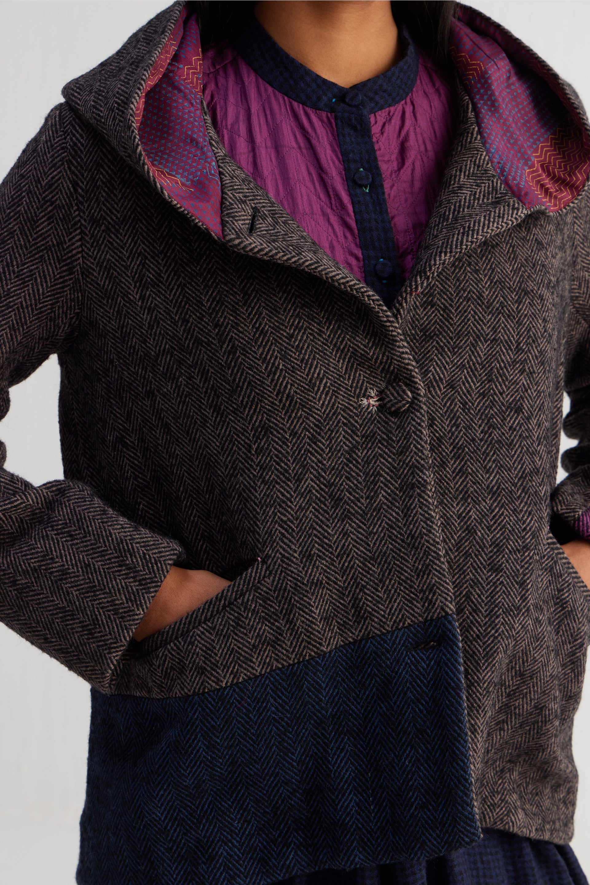 Short hoodie jacket with color block patch and full sleeves. Constructed in herringbone 100% wool (heavy). Finished with hand block printed 100% silk lining.