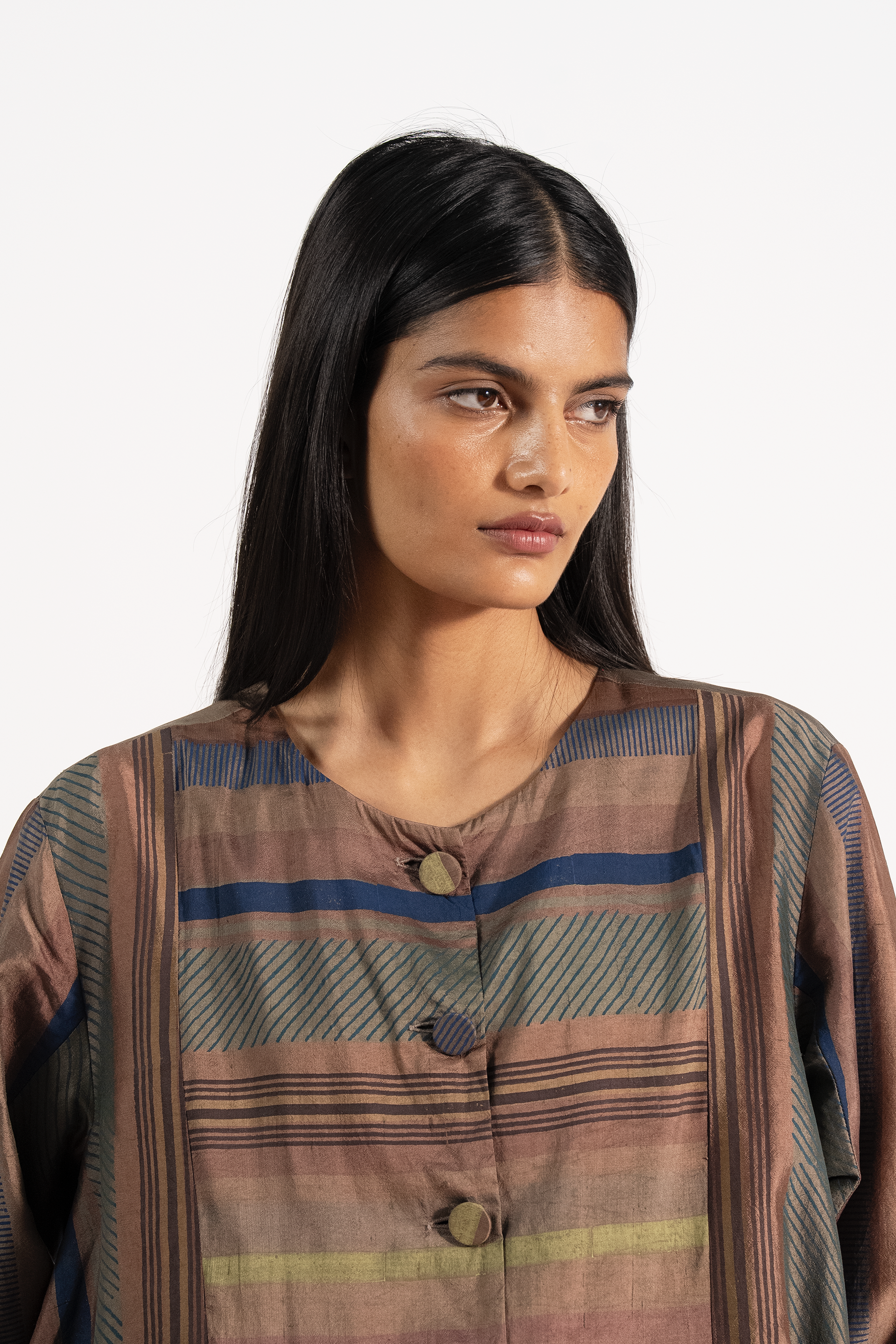 A-line Jacket Dress In Self Striper 100% Silk. Comes With An Attached Handblock Print 100% Silk Lining.
