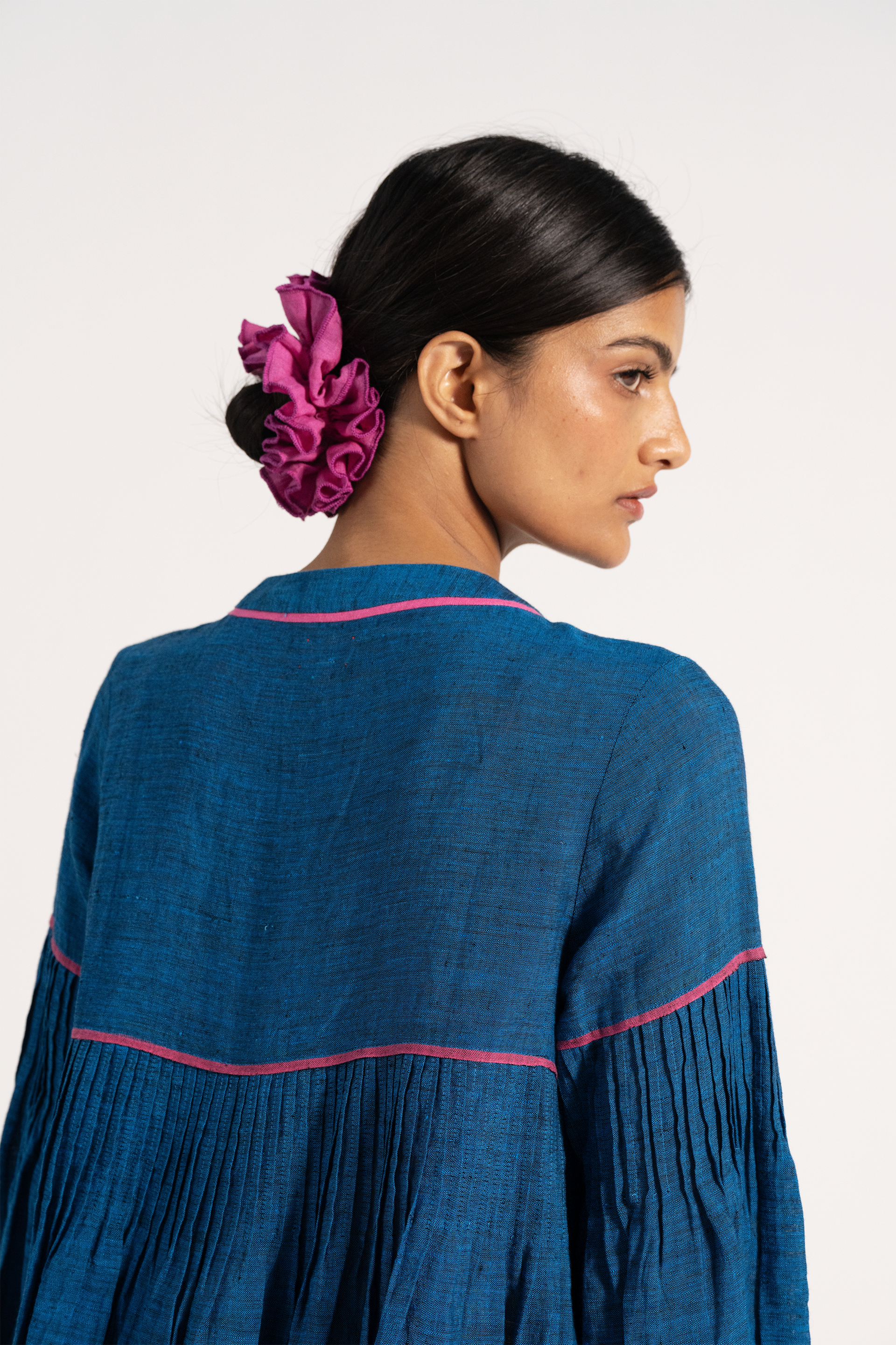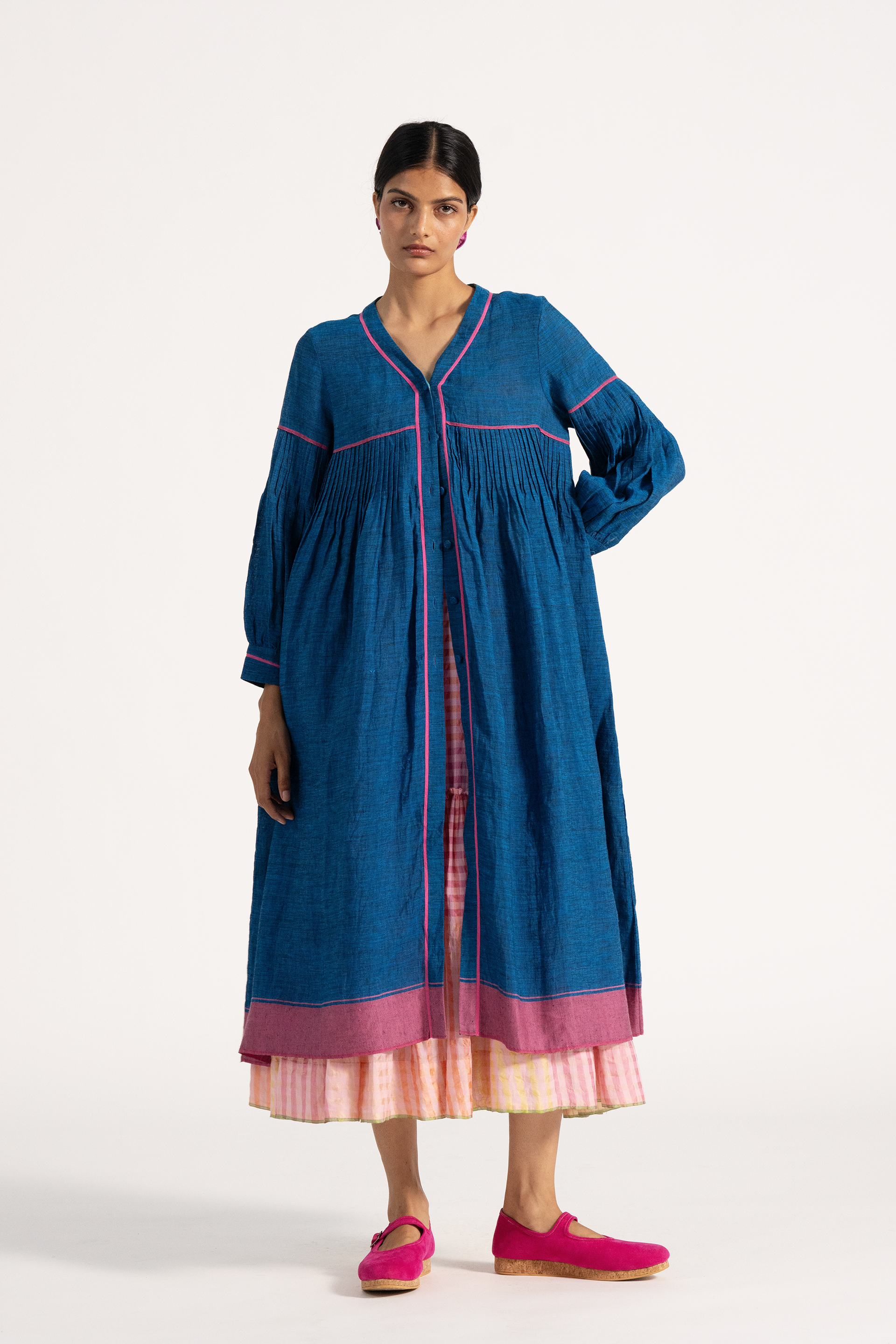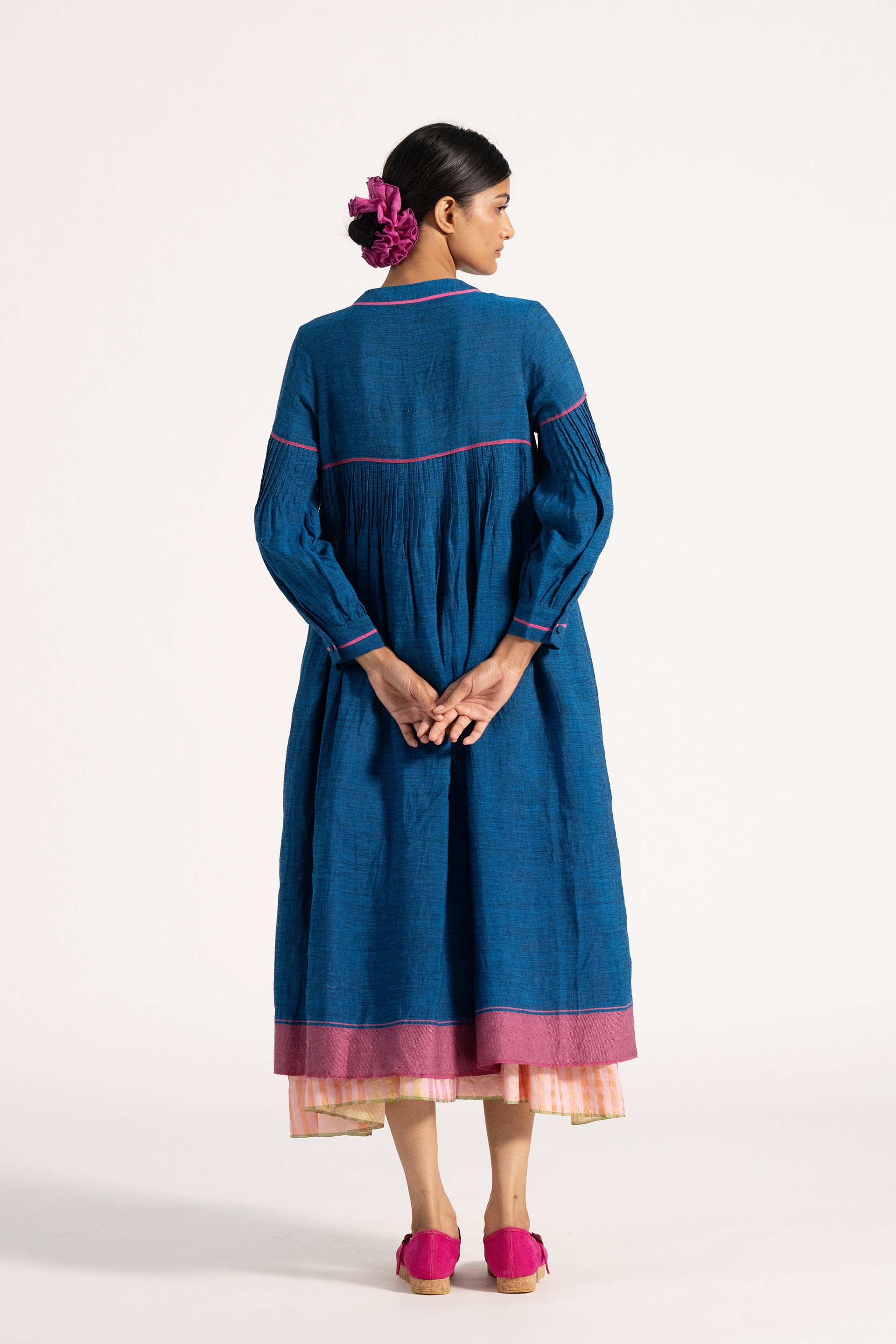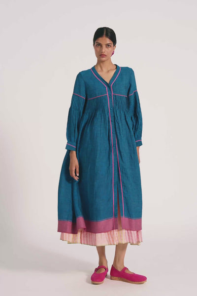 V neck button down dress in 100% linen. With all over pin tuck detail on bodice and contast selvedge detail.