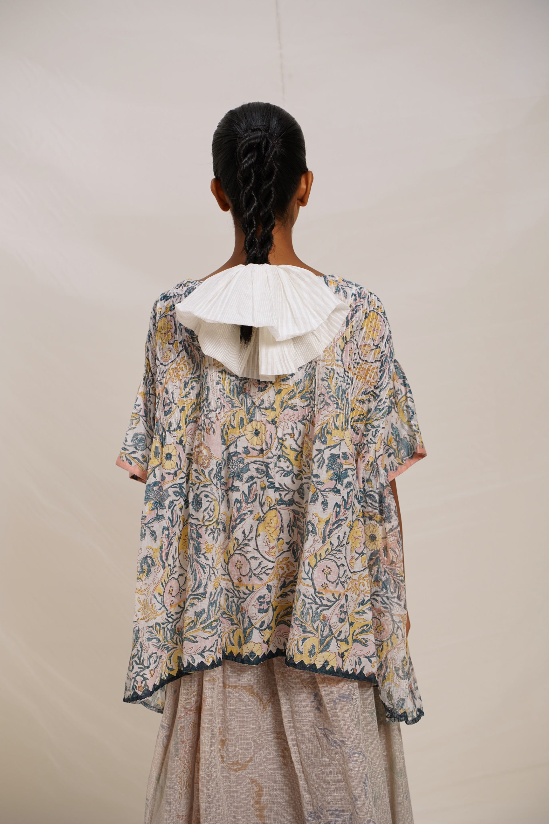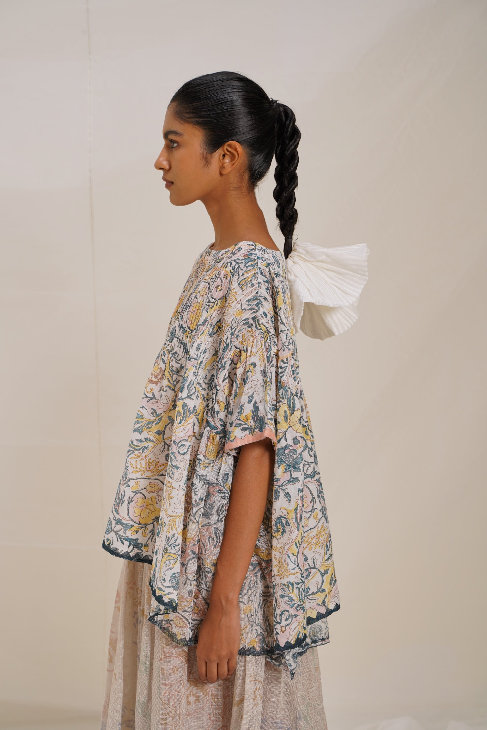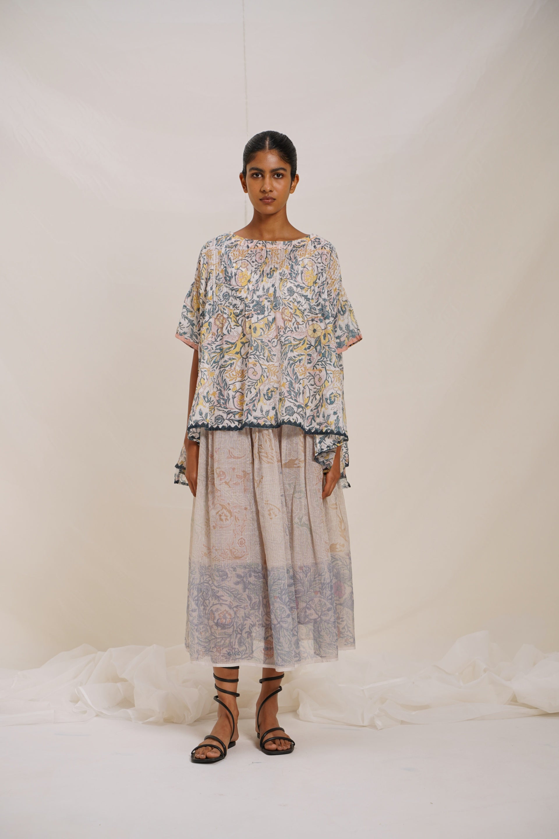 Oversized top in all over floral print with chevron applique embroidery detail.