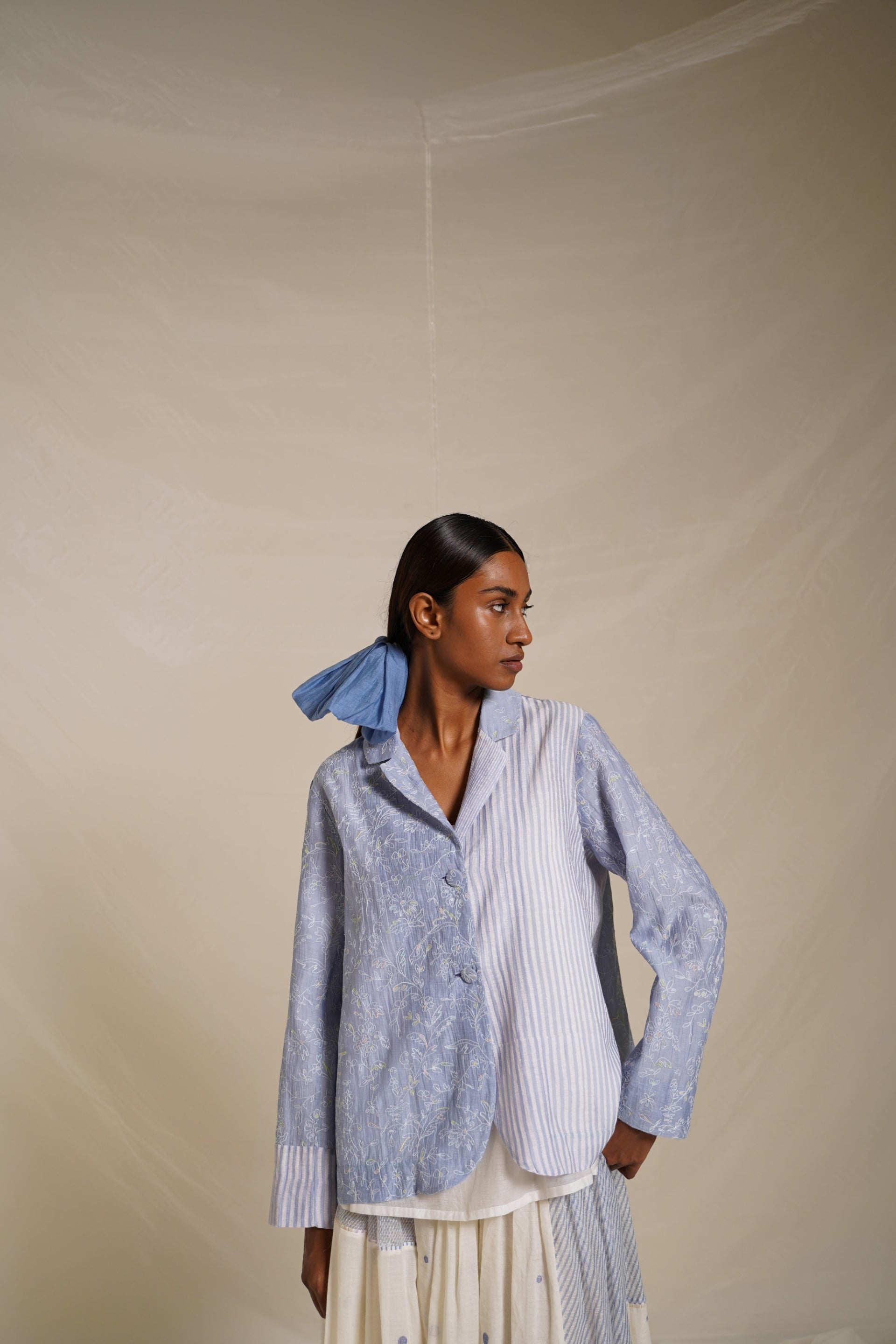 Short blazer, featuring a sophisticated notch collar design adorned with a unique mix of striper print and delicate floral embroidery. This piece comes with an attached lining featuring text print detailing.