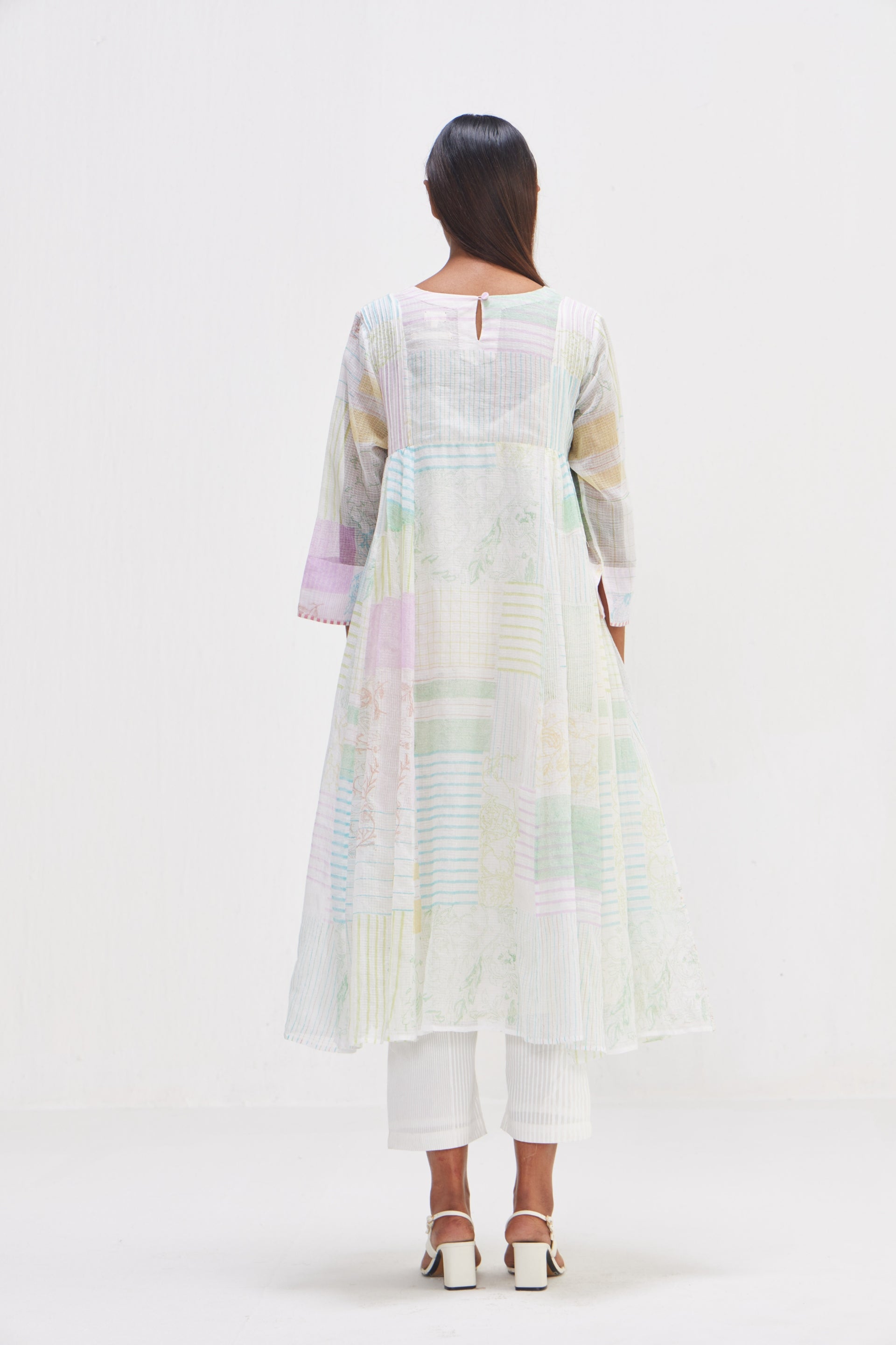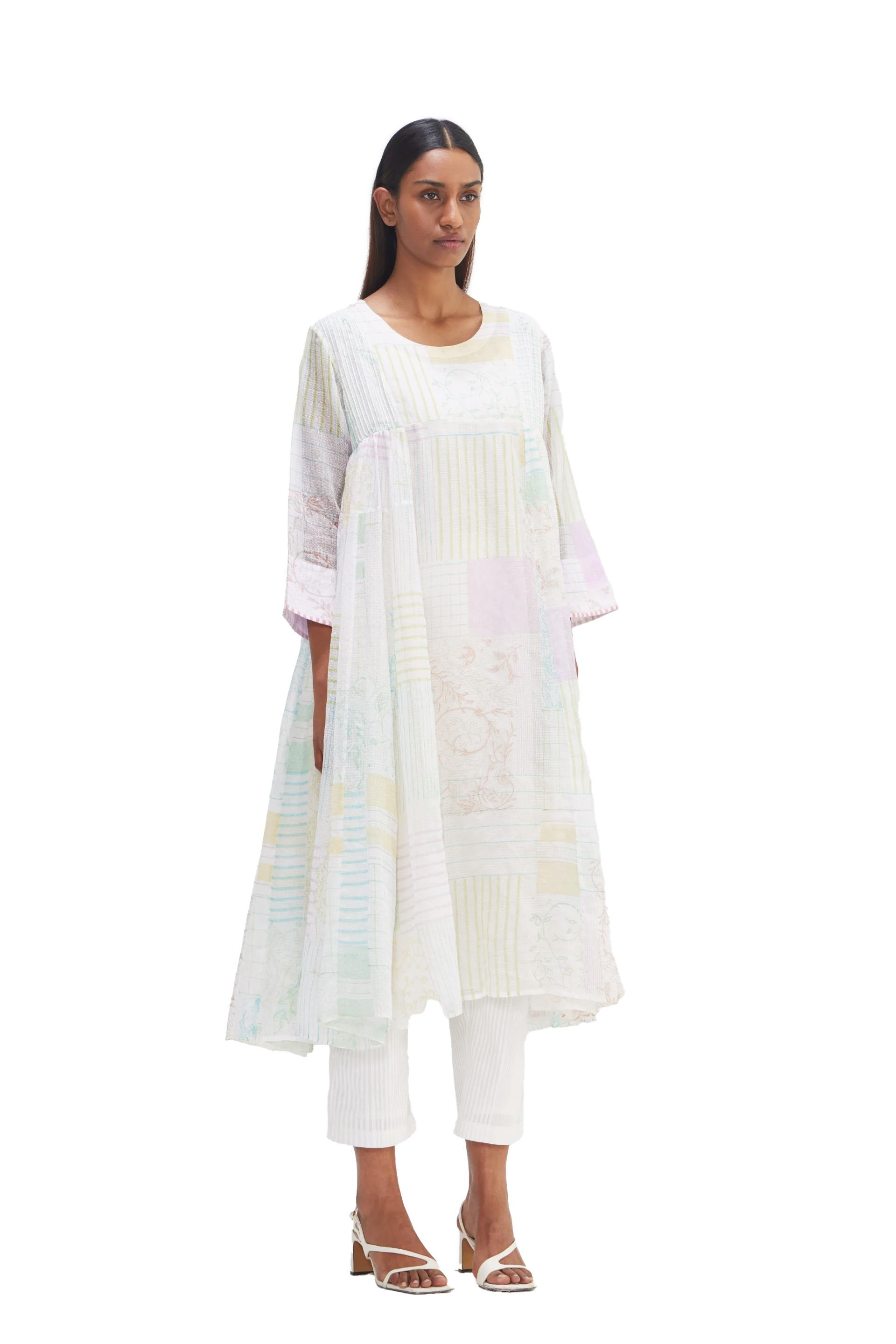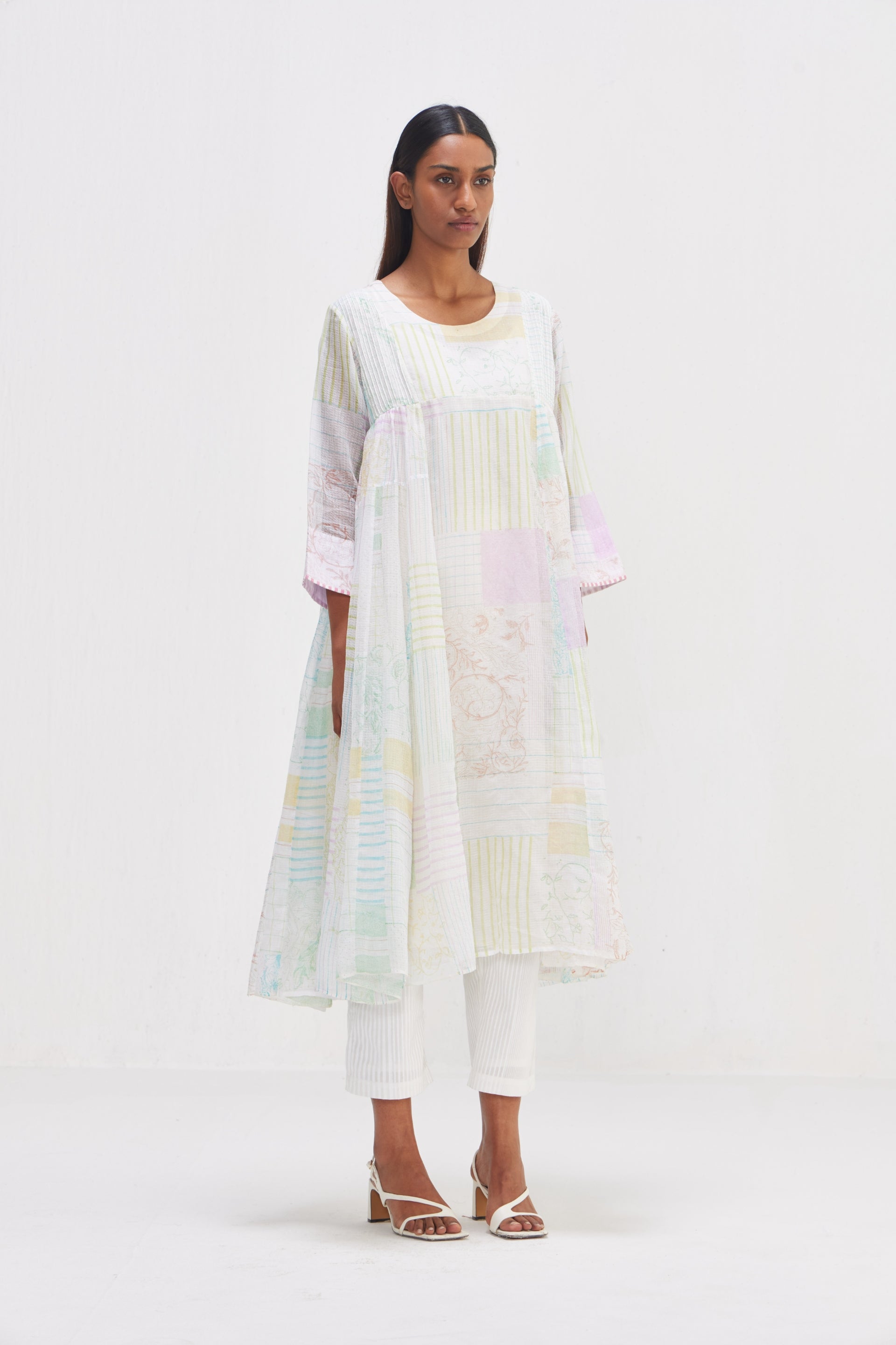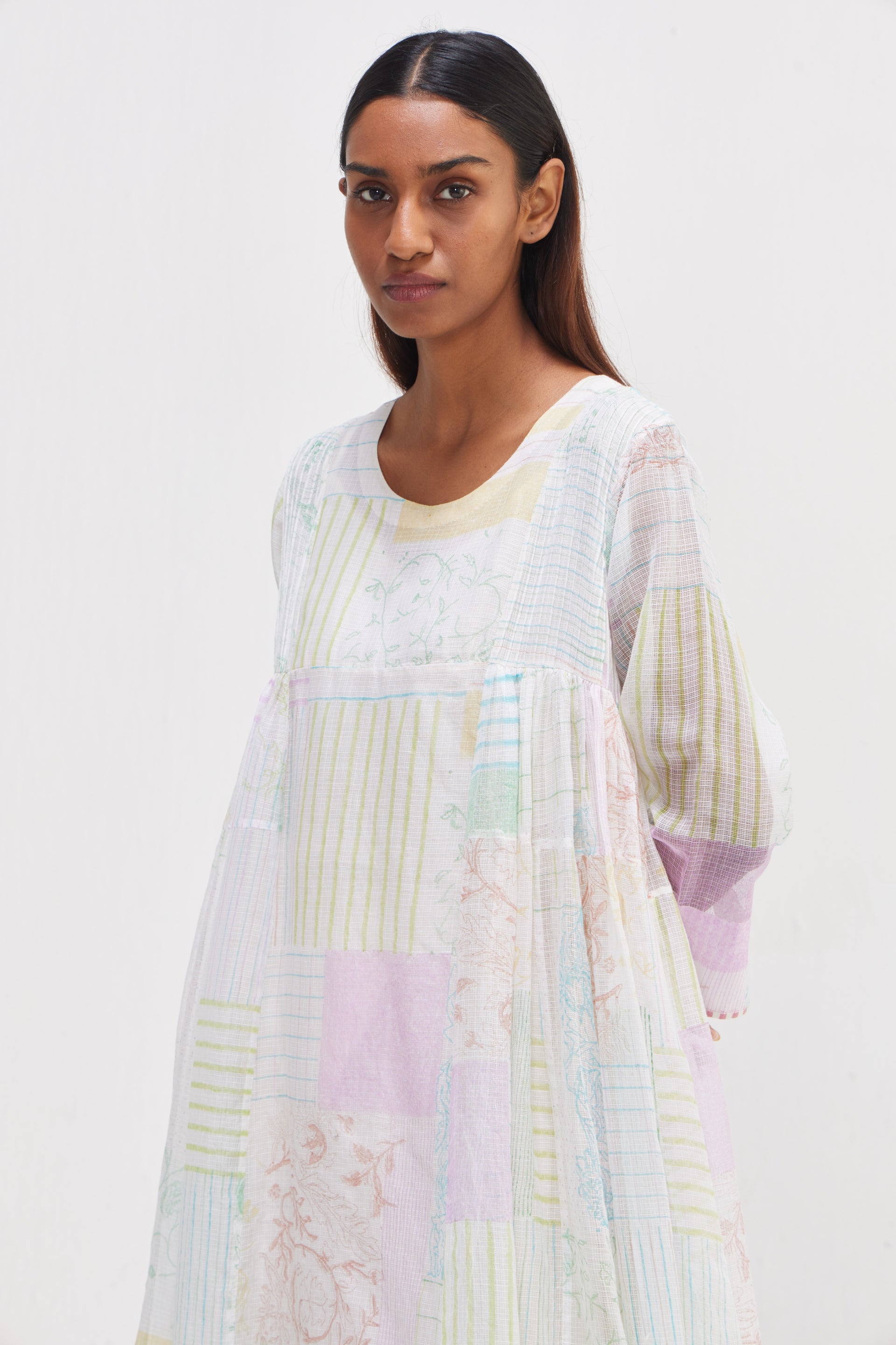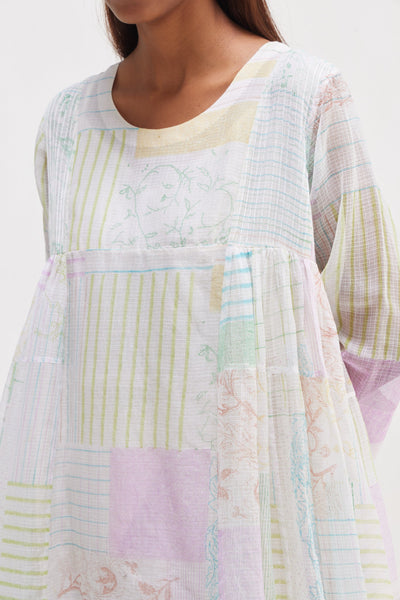 Panelled midi dress, adorned with an all-over hand block print collage mix for a unique and artistic touch. Featuring piping detail on the sleeves hem. Complete with an attached printed text lining, it offers both style and comfort in one elegant ensemble.