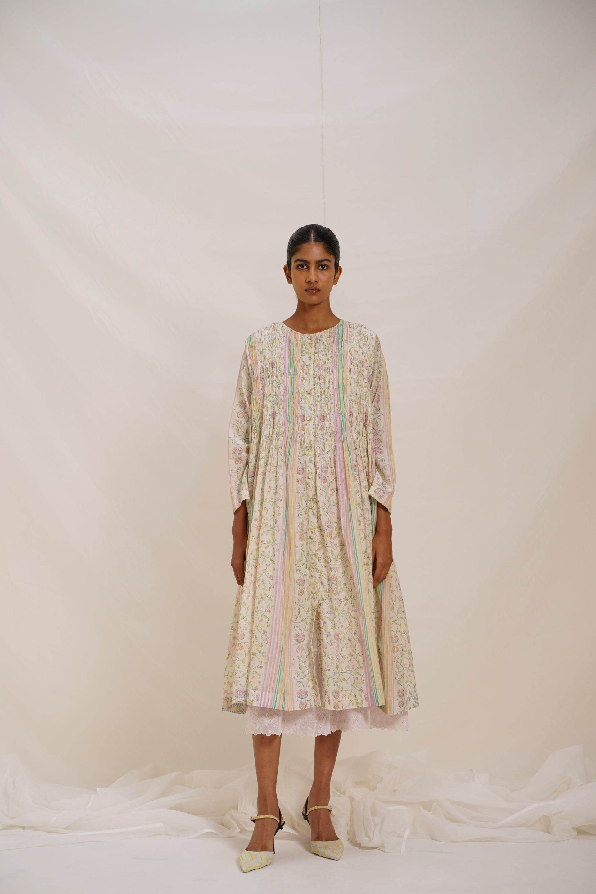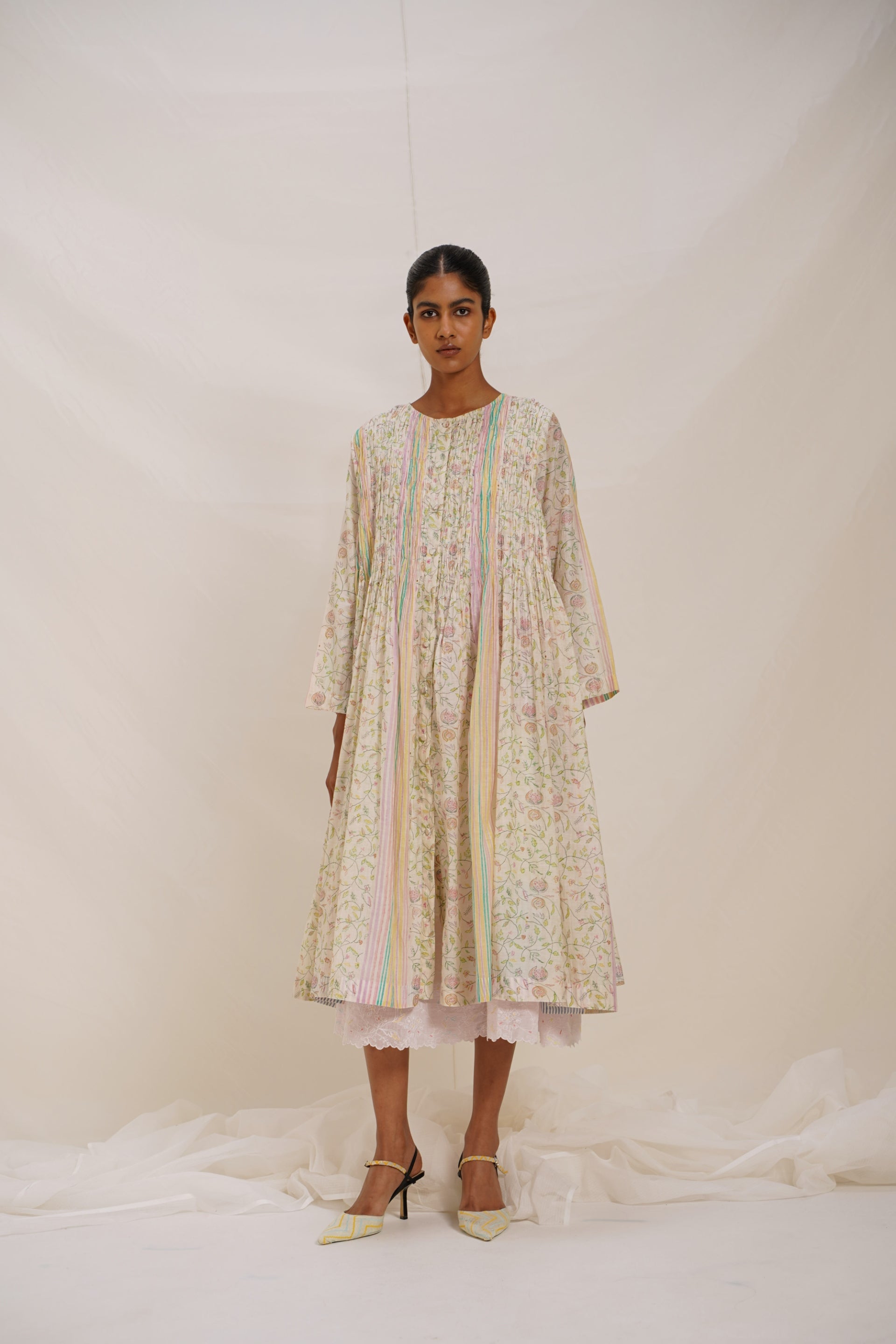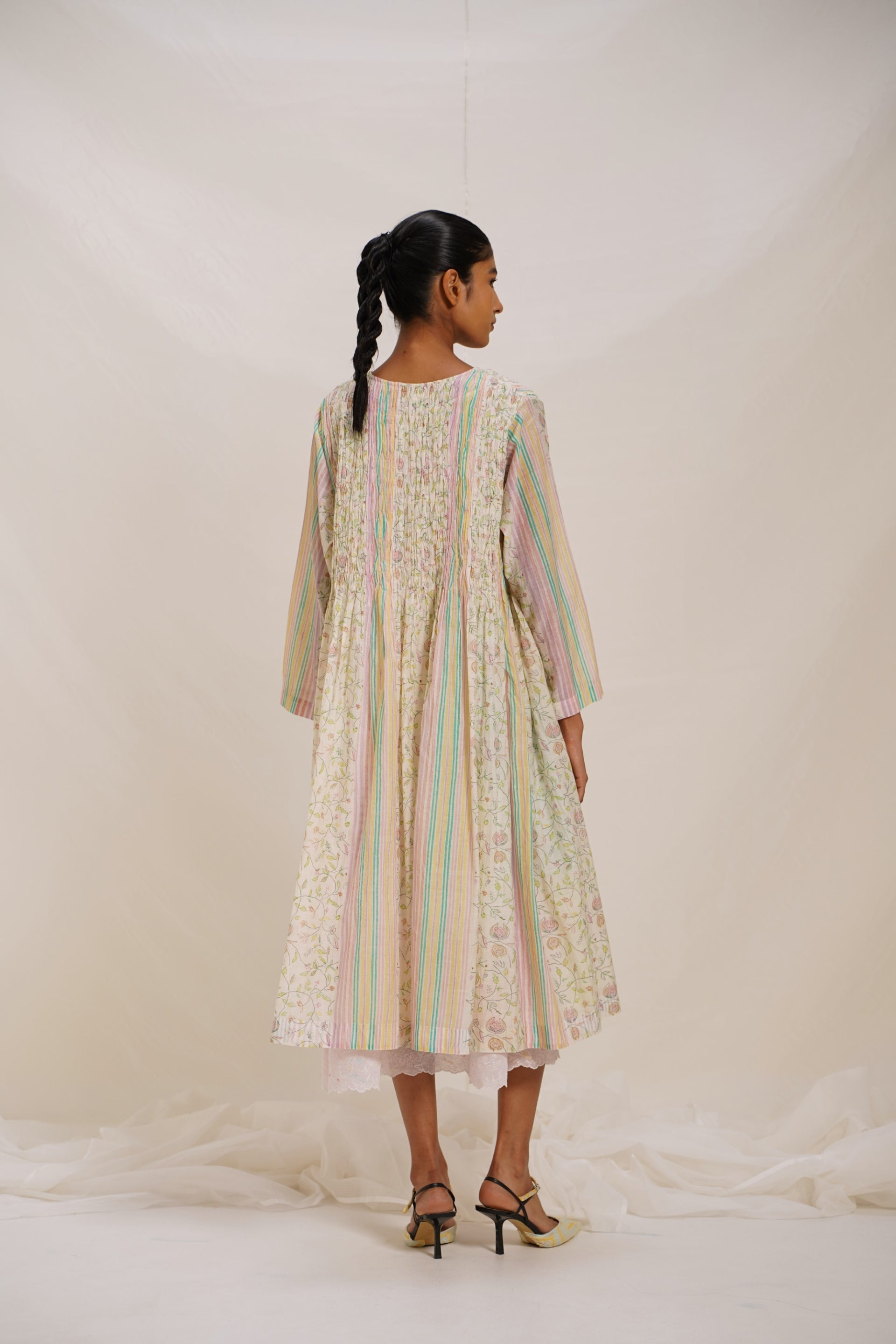 The dress is crafted with a front open, button-down dress featuring all-over hand block print that artfully combines floral, bird, and striper motifs, each element meticulously designed to create a vibrant yet cohesive pattern. This intricate smocking enhances the dress's texture, adding a subtle yet detail touch that elevates its overall aesthetic. Comes with an attached kota doriya lining.