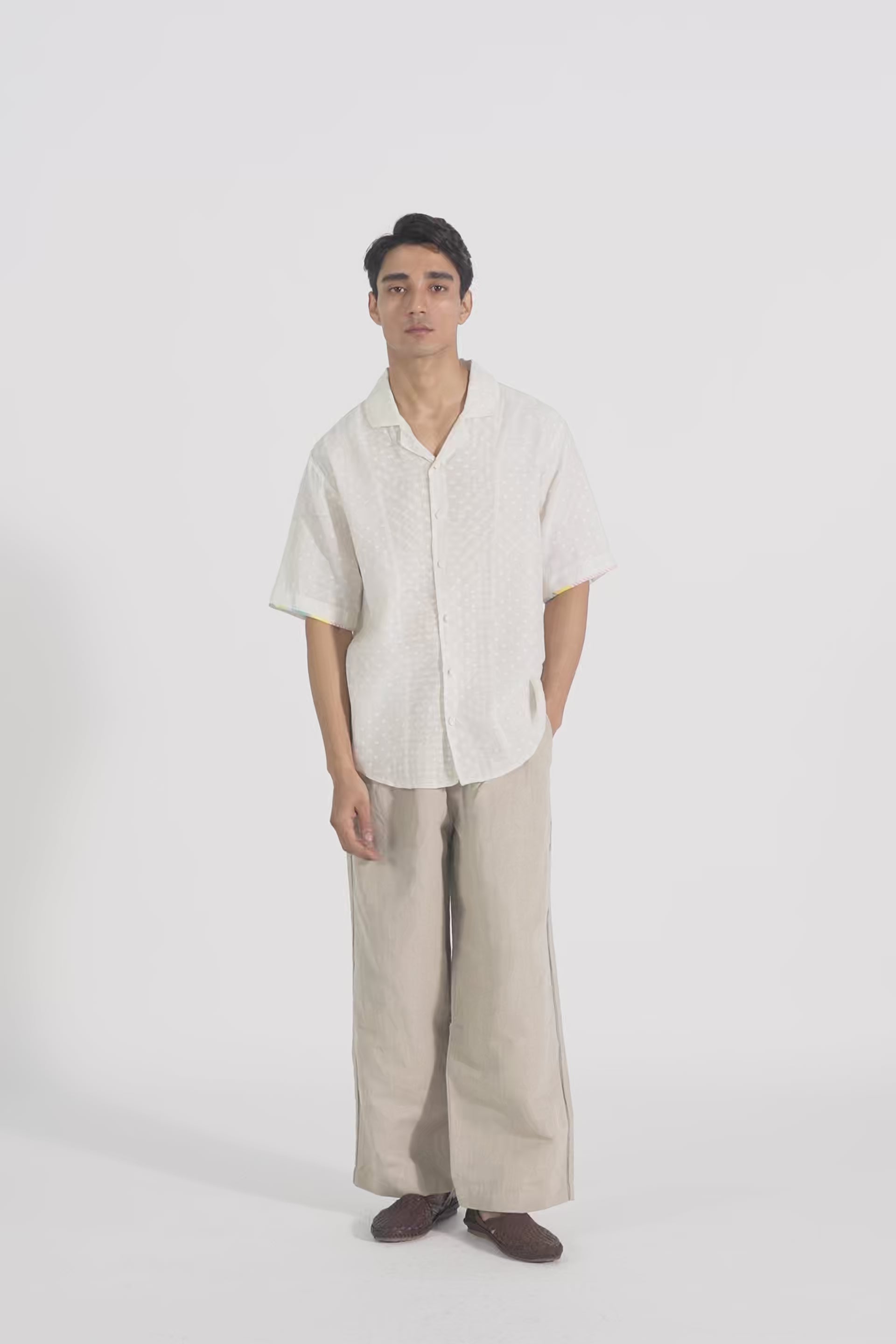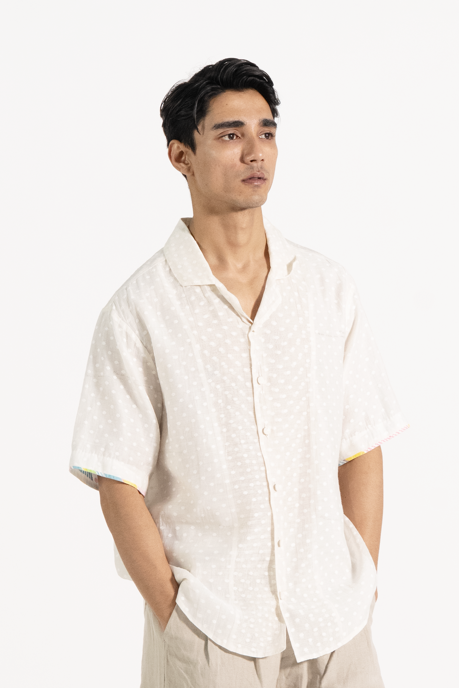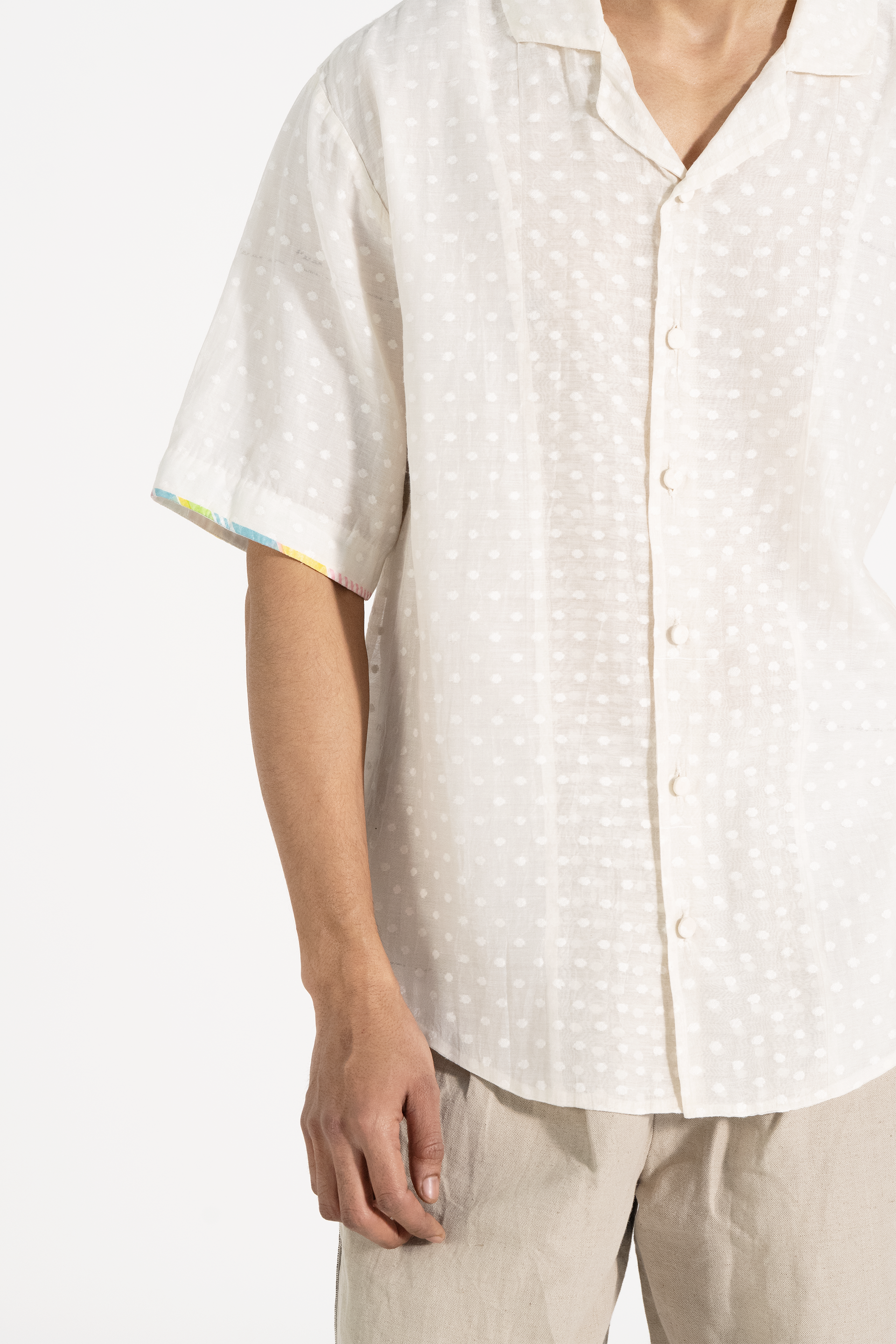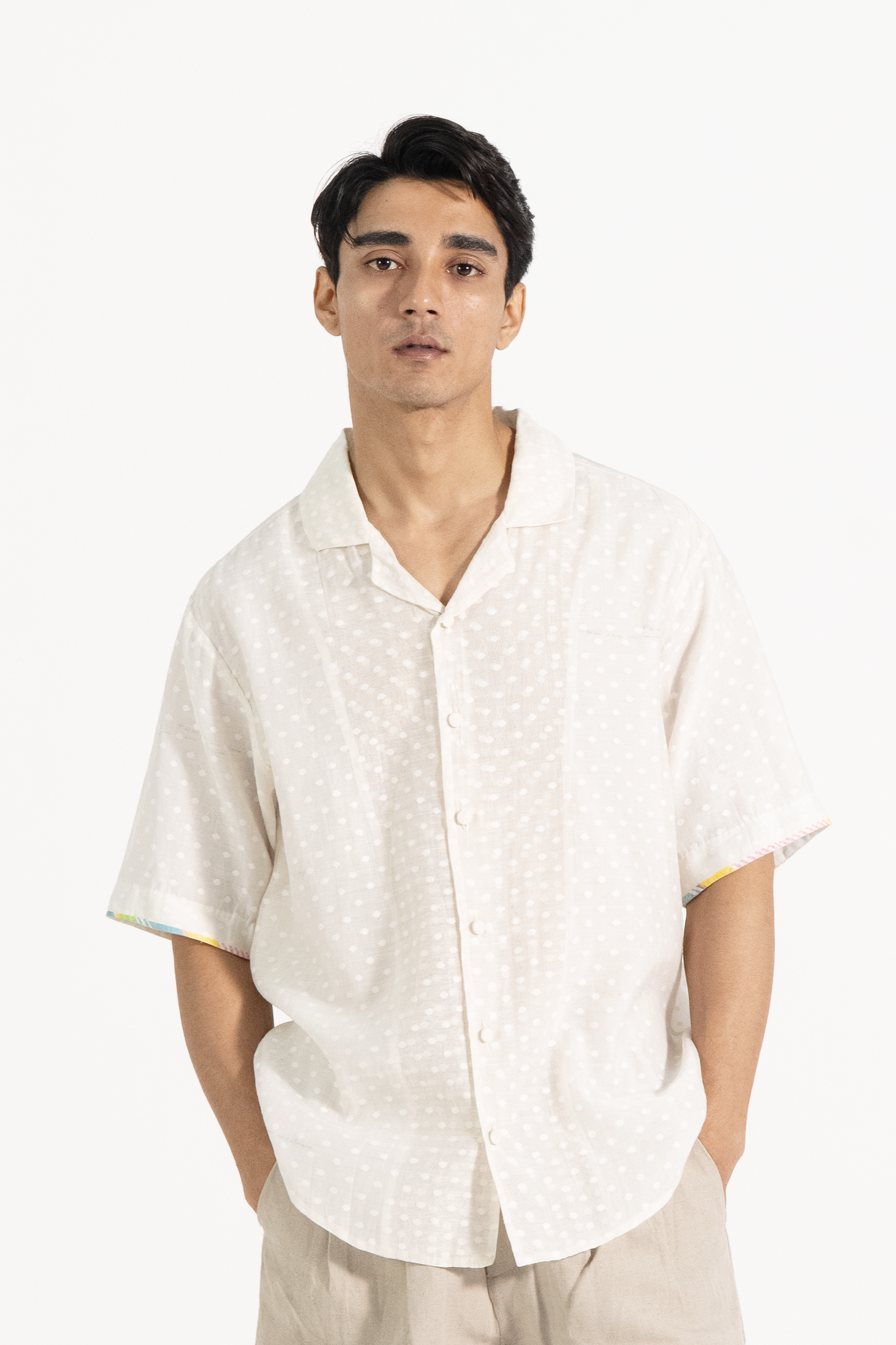 This off-white short-sleeve button-down shirt features a subtle block print with a textured dot pattern, a soft collar, and a relaxed fit. Delicate multicolored trim on the sleeve edges adds a refined touch.