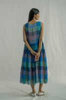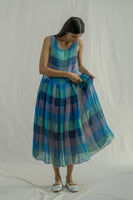 A sleeveless midi dress with a boat neckline, featuring box pleats at the waist and selvedge detailing on the hem. Crafted from multicolor checked 100% linen gauze fabric, it is lined with an attached multicolor placement handblock print cotton-silk lining.