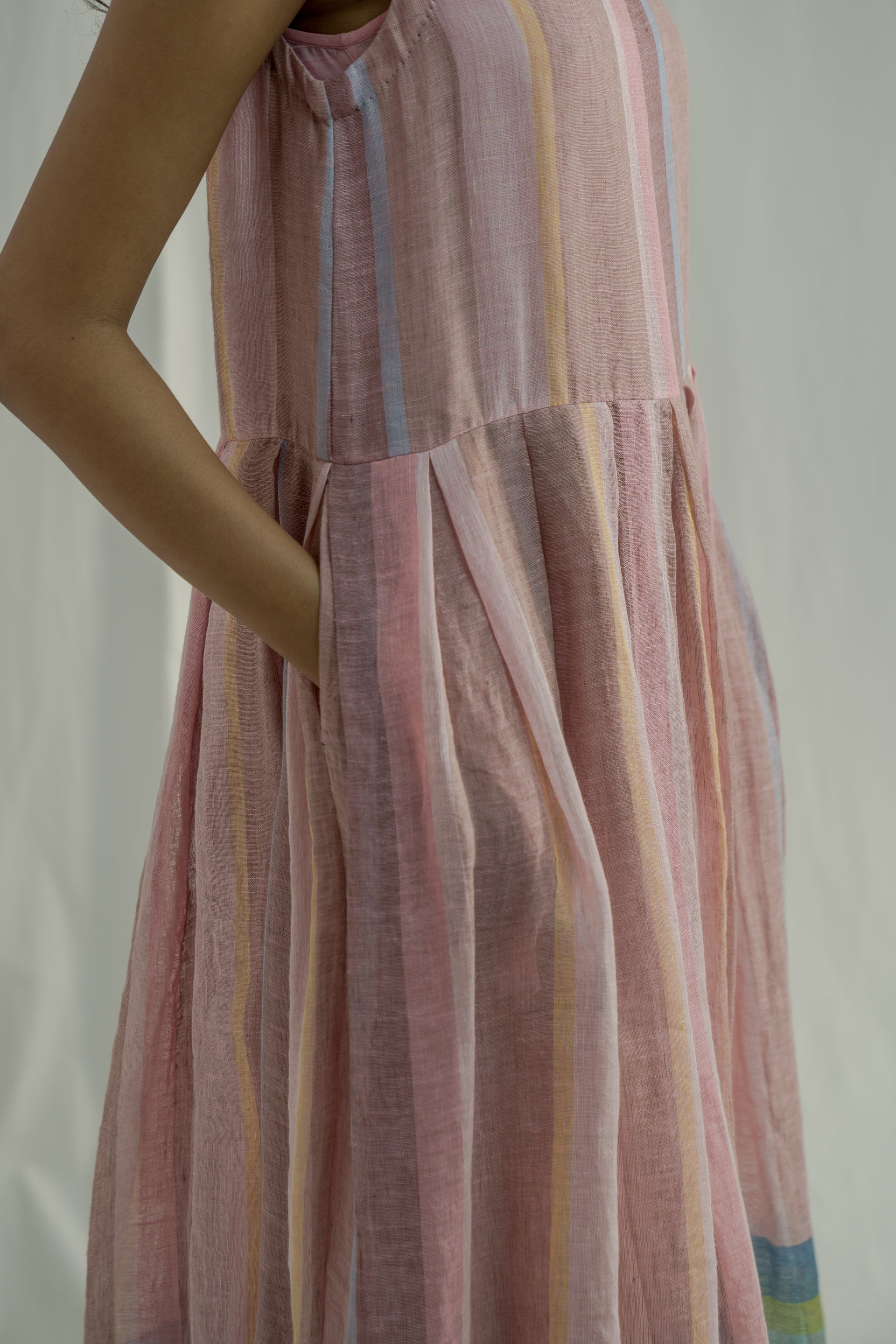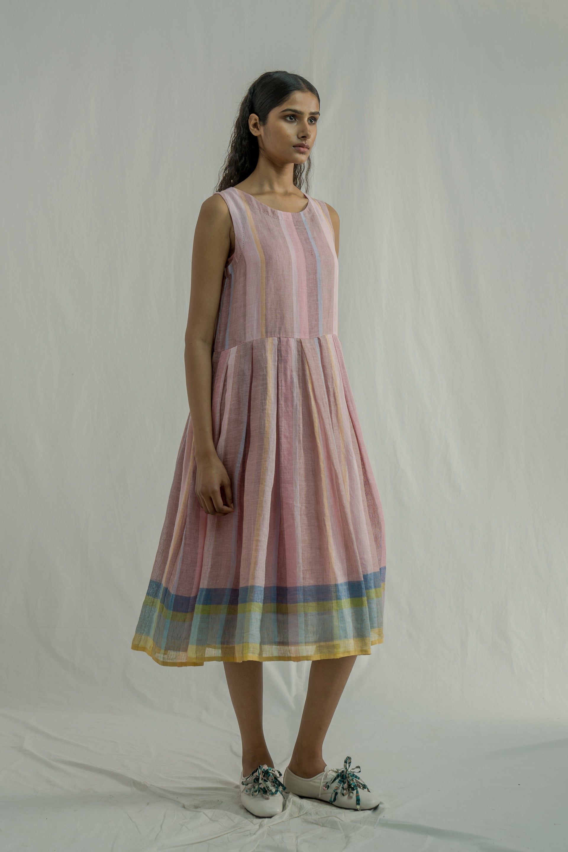 Boat neckline sleeveless midi dress with box pleat on the waist line and selvedge detail on hem. Constructed in multicolor striper and border mix 100% linen gauze fabric. Comes with an attached multicolor placement handblock print cotton silk lining.