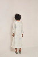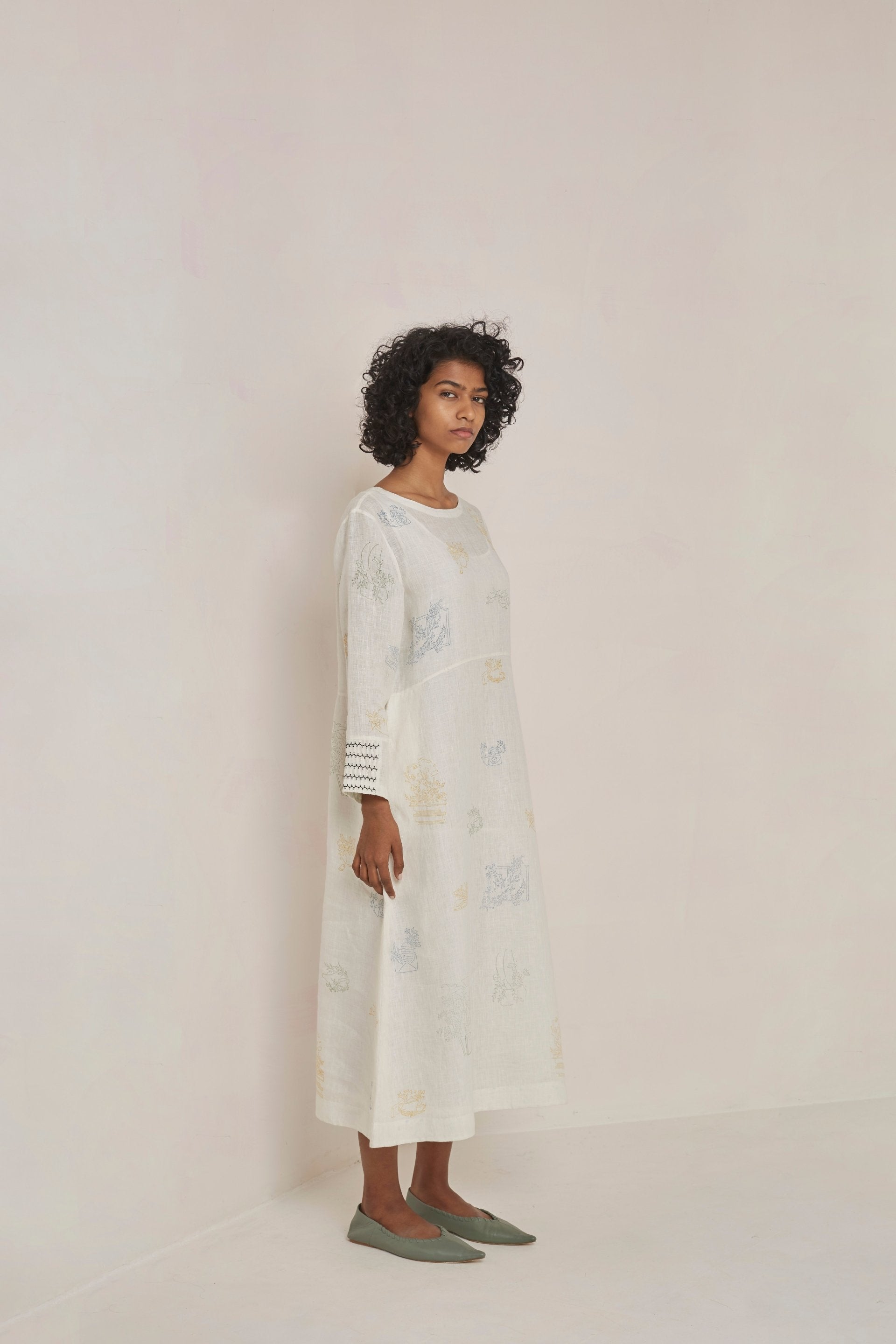 White straight dress with all over hand block quarantine theme printed motifs and smocking details on the cuff, made in linen