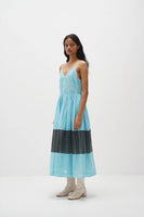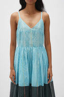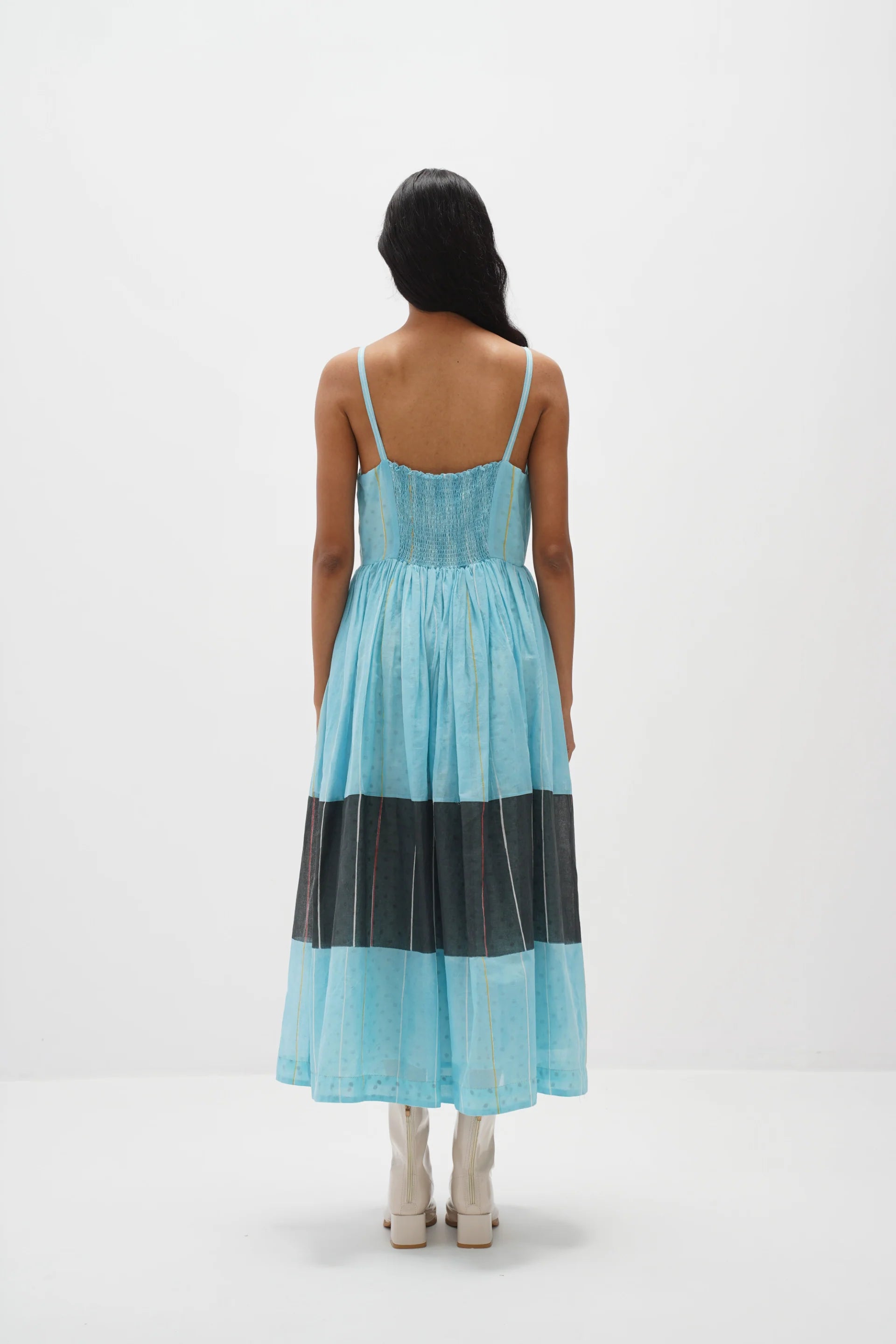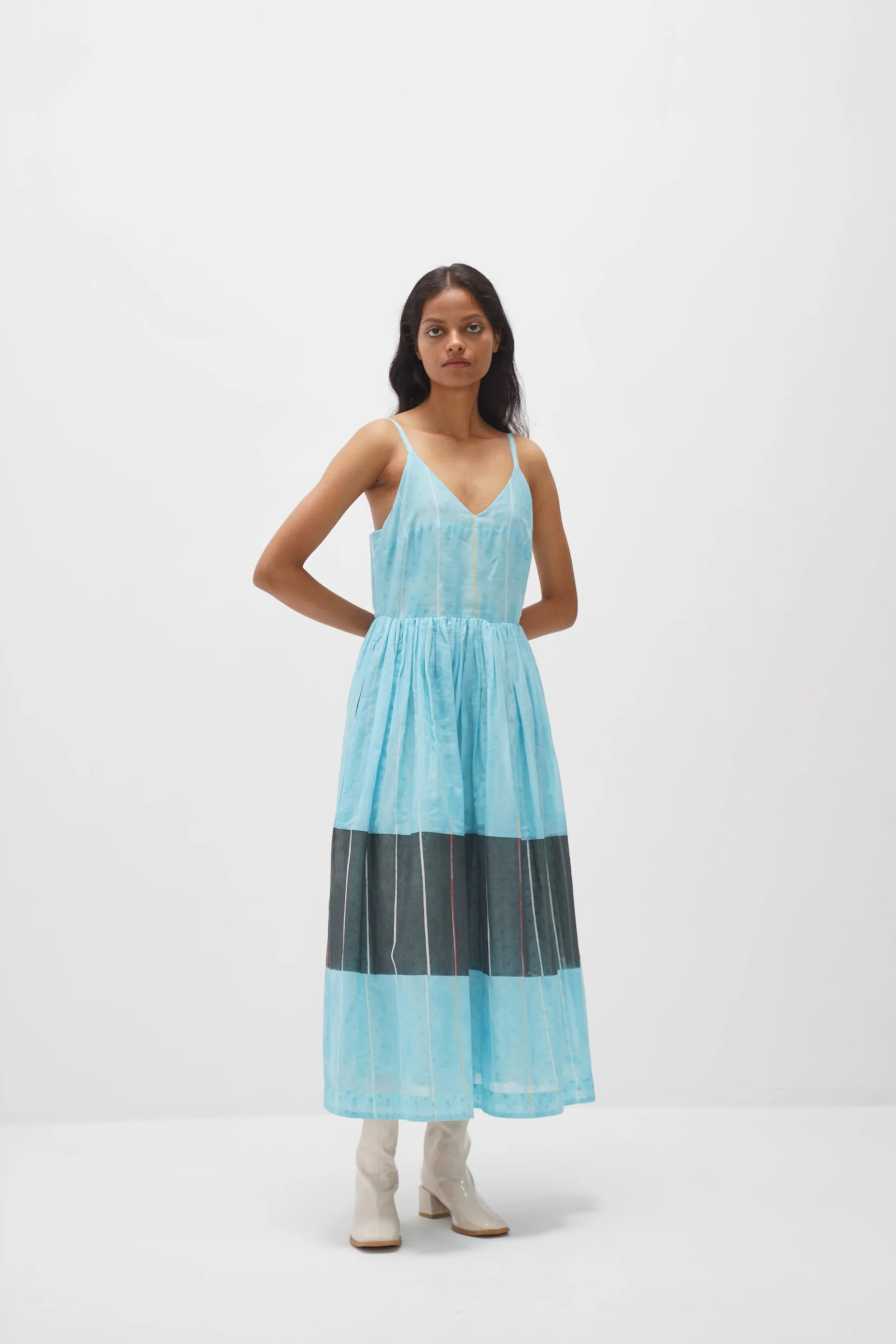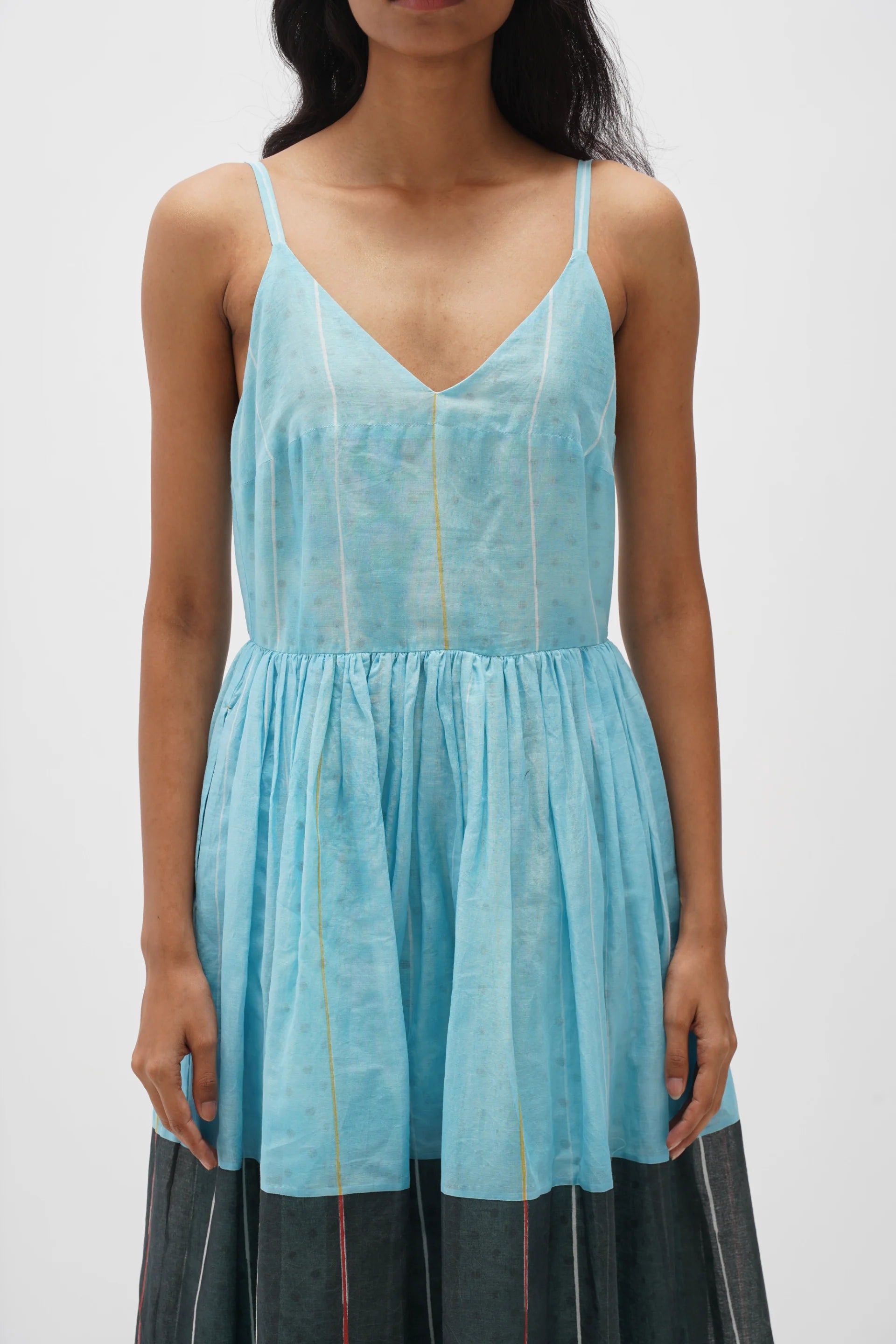 Spaghetti straps dress featuring an all-over hand-blocked stripes print with contrast hand block charcoal print panel on the bottom of the dress, detailed with gathers around the waist and back smocking detail, accompanied by an attached hand block printed cotton silk lining.