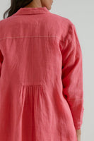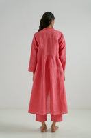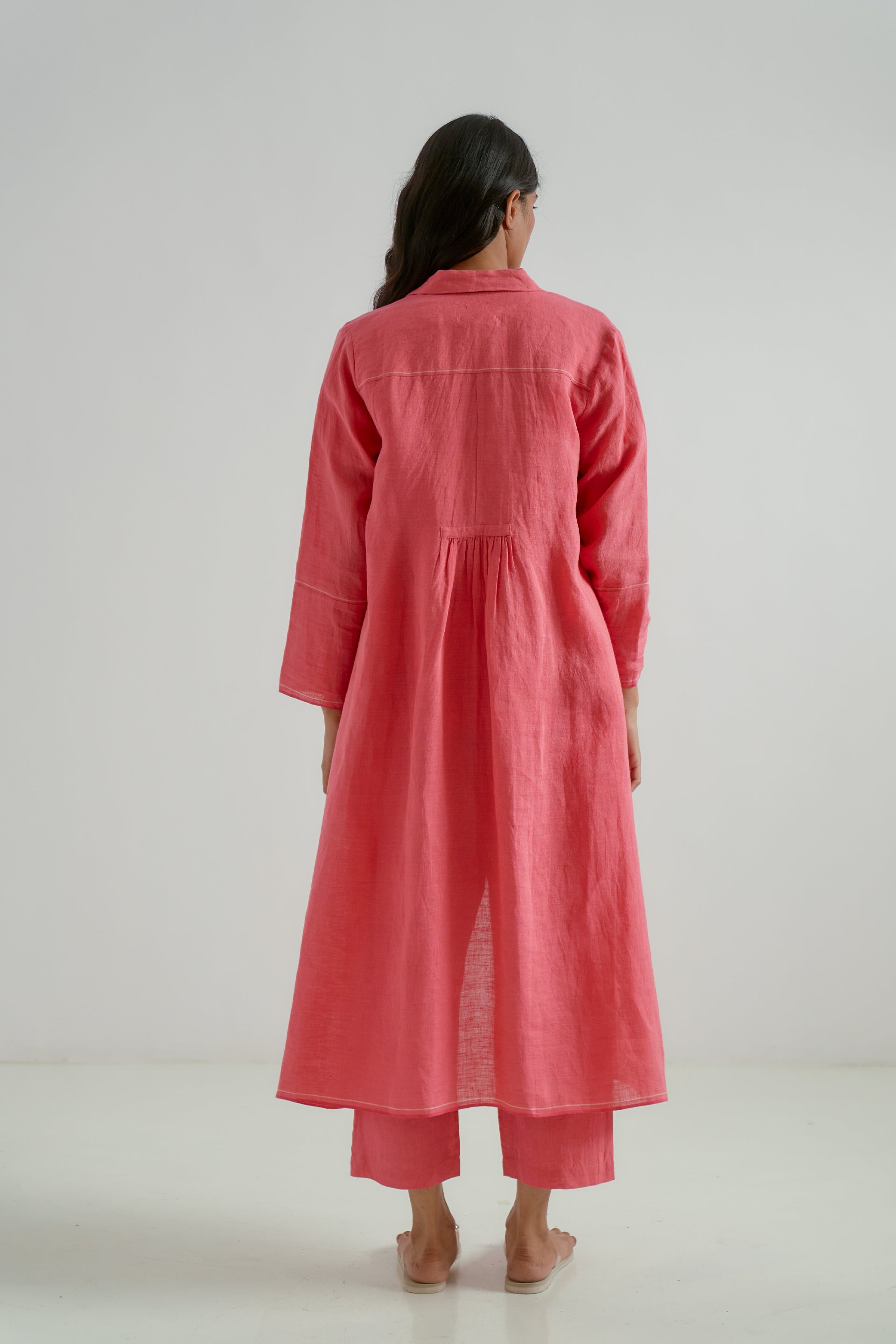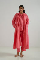 This relaxed-fit , front-open button-down collar midi dress cum jacket is designed with gathered details at the waist featuring a yoke patch and contrast selvedge stitching along the seams, while the buttons are adorned with delicate handwork. A unique text print hand embroidery embellishes the side, adding a touch of artisanal charm. Crafted from 100% linen fabric.