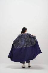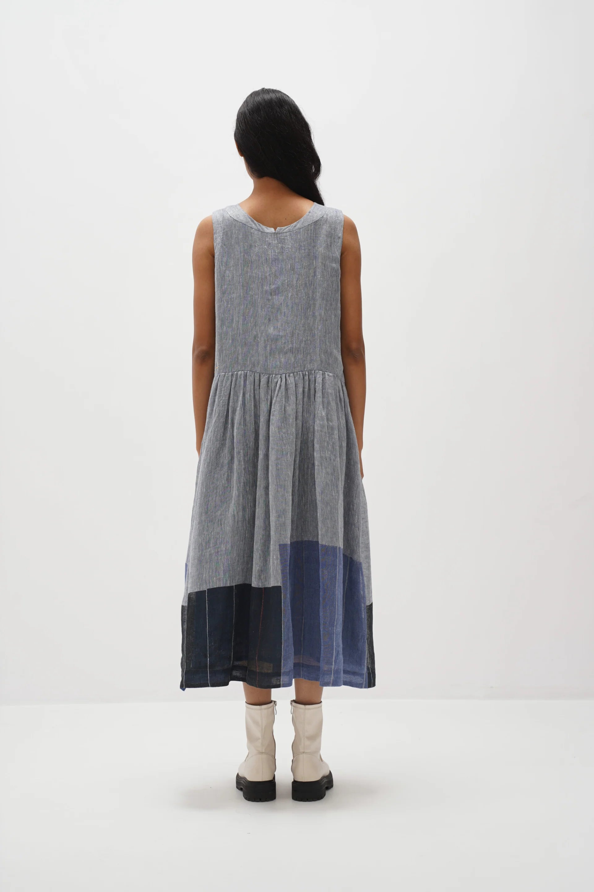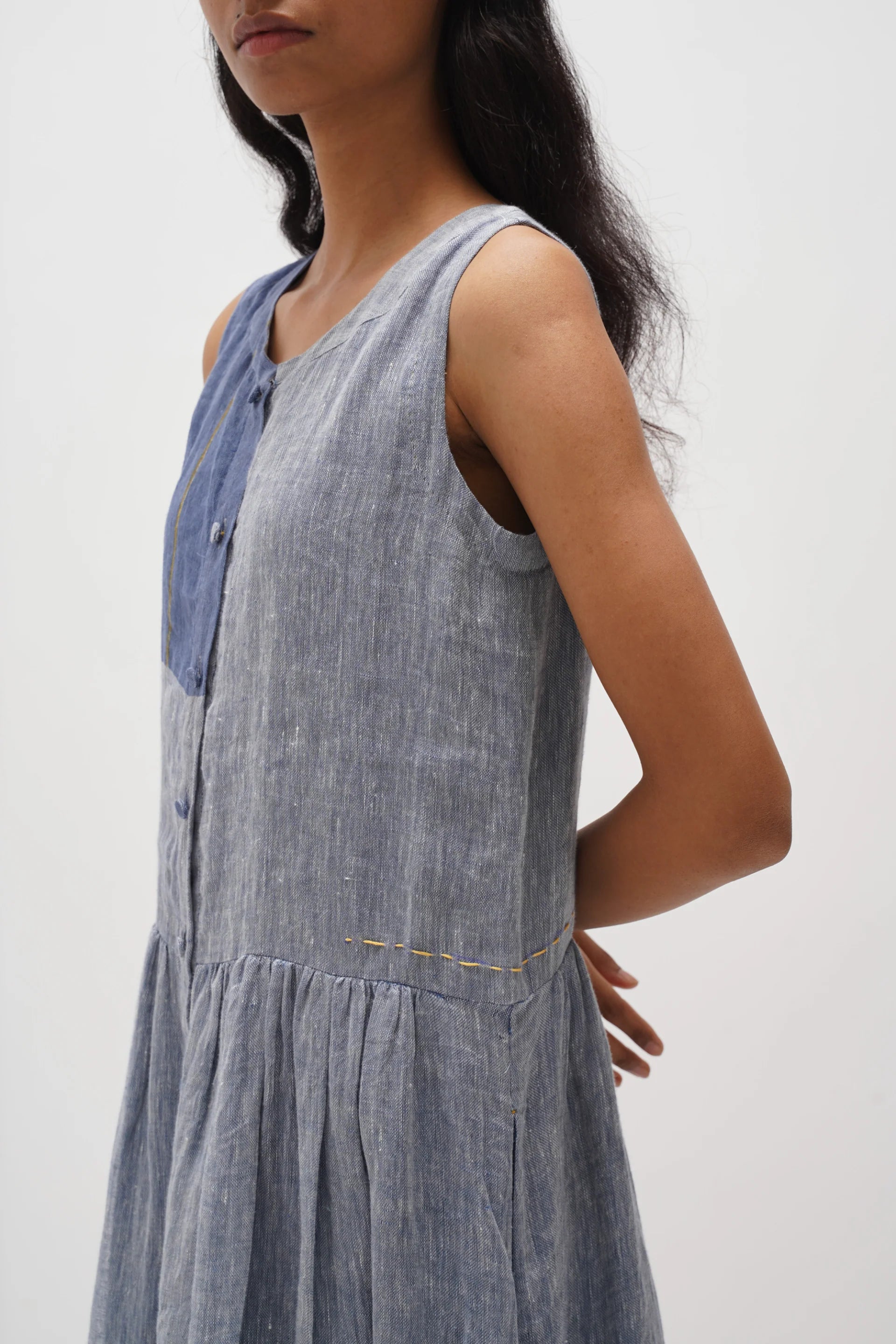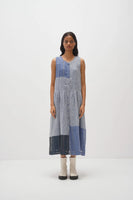 Sleeveless button-down, front-open dress featuring a chunky hand-block multi-color panel print design. Featuring contrasting hand embroidery details and gathers around the waist, complete with an attached hand block printed cotton silk lining.