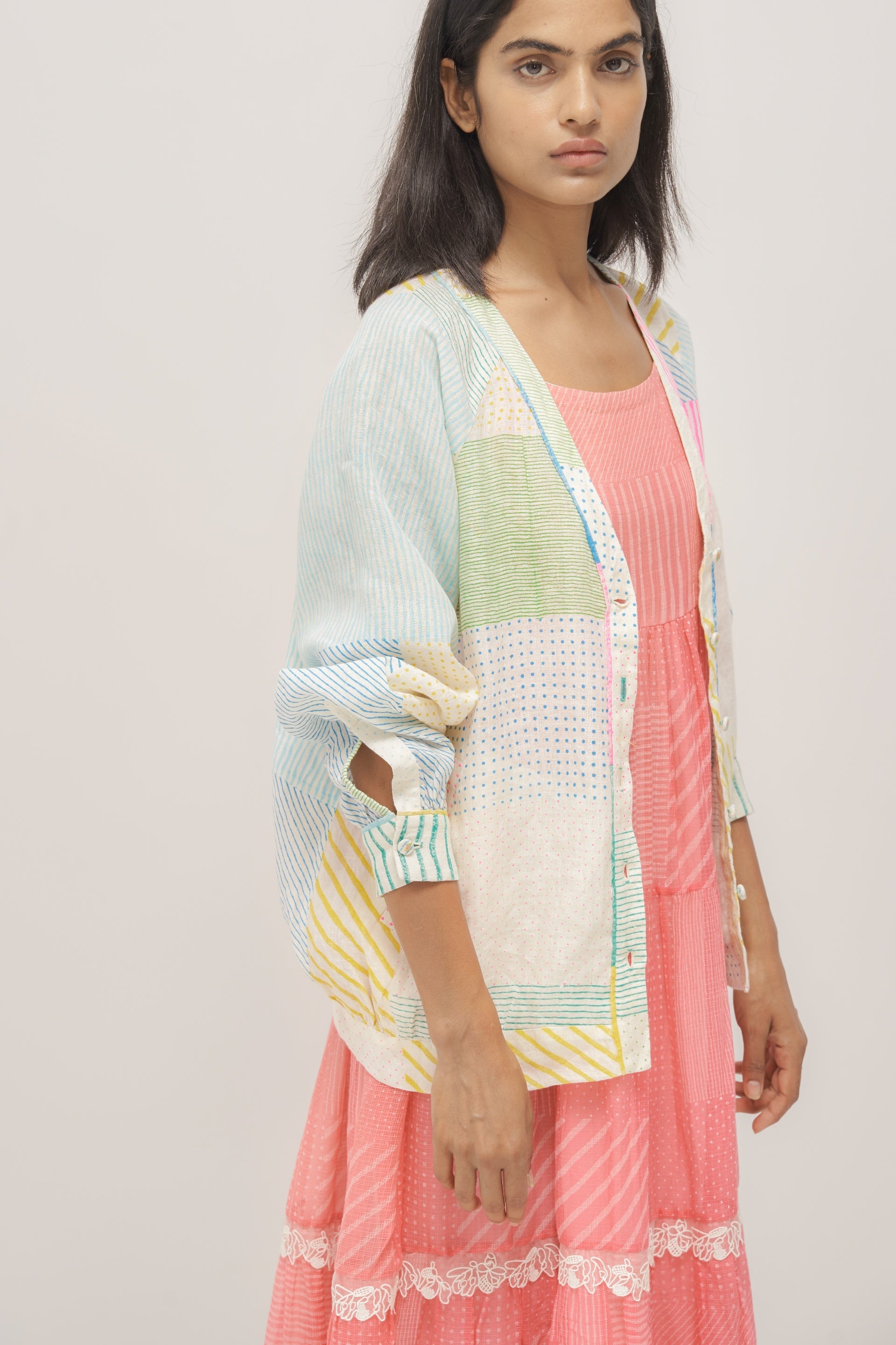 Short linen jacket with multicolor print collage and multicolor printed selevedge detail