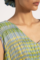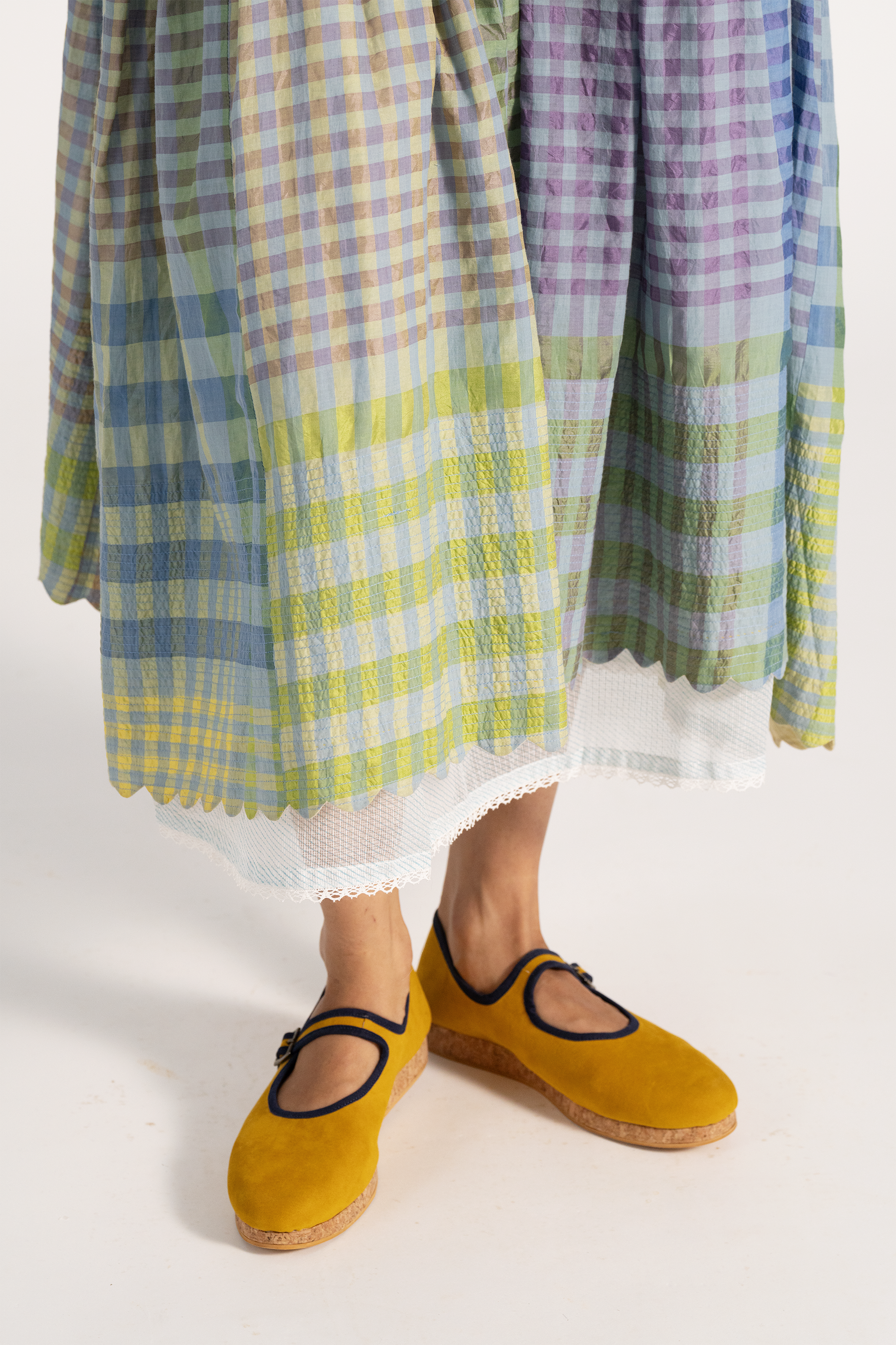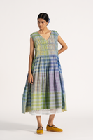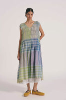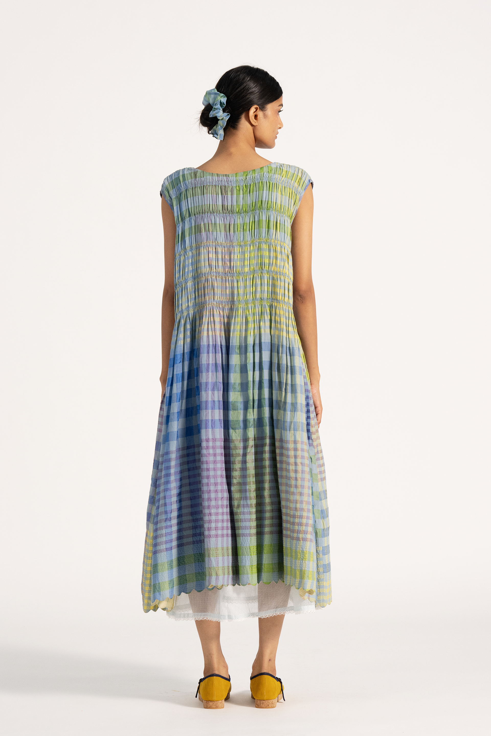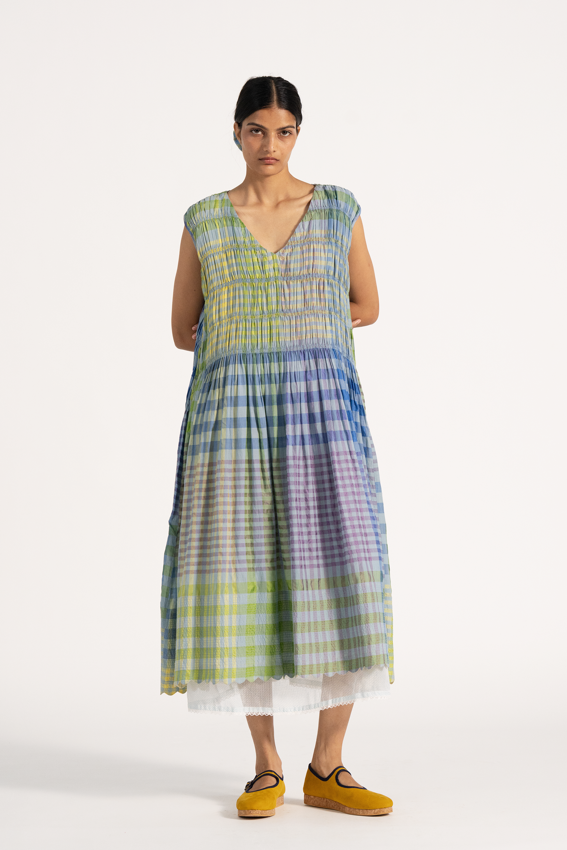 Multicolor checkered sleeveless midi dress in cotton silk blend. V neckline with smocking detail.