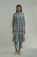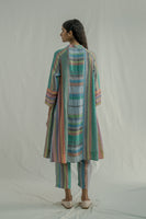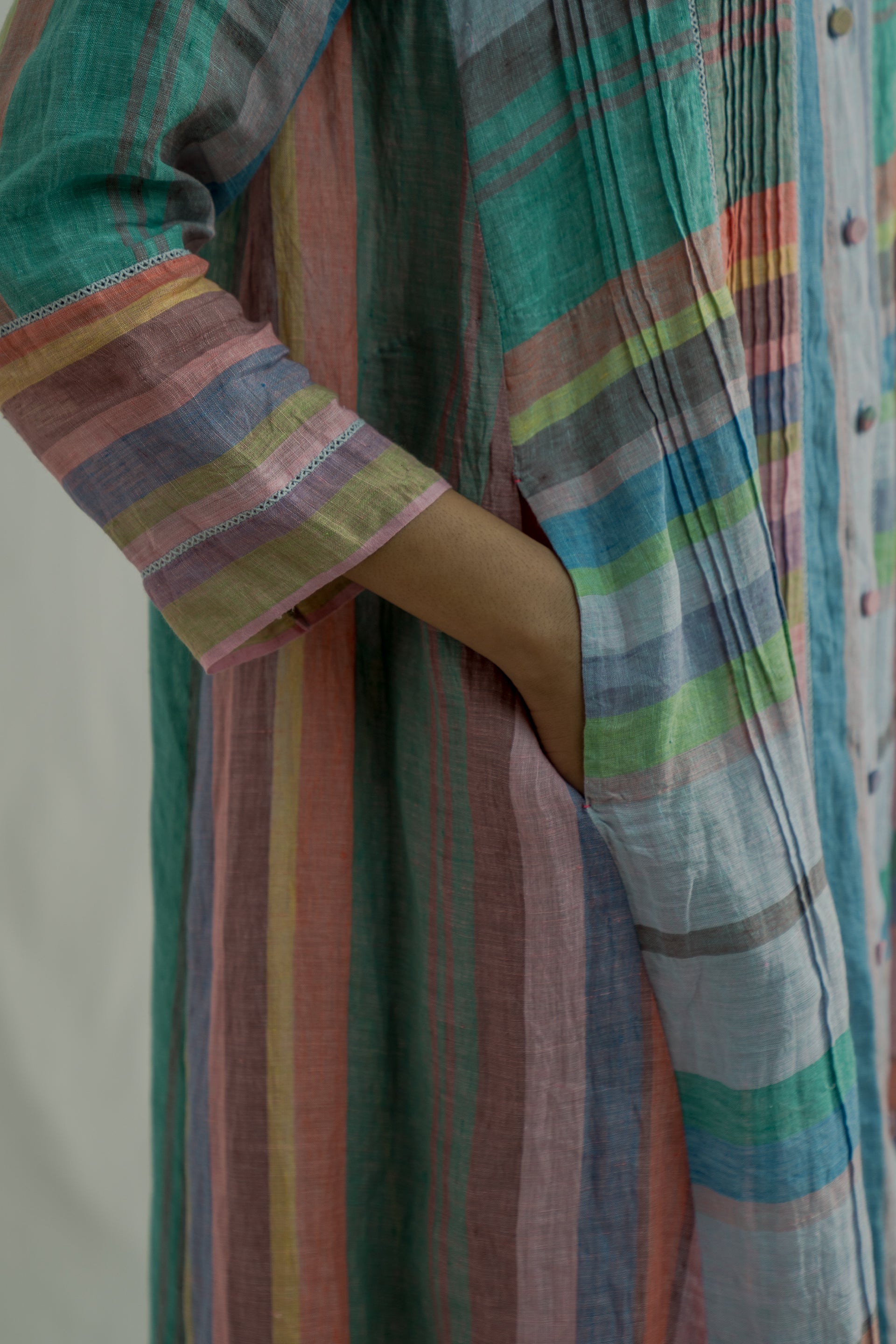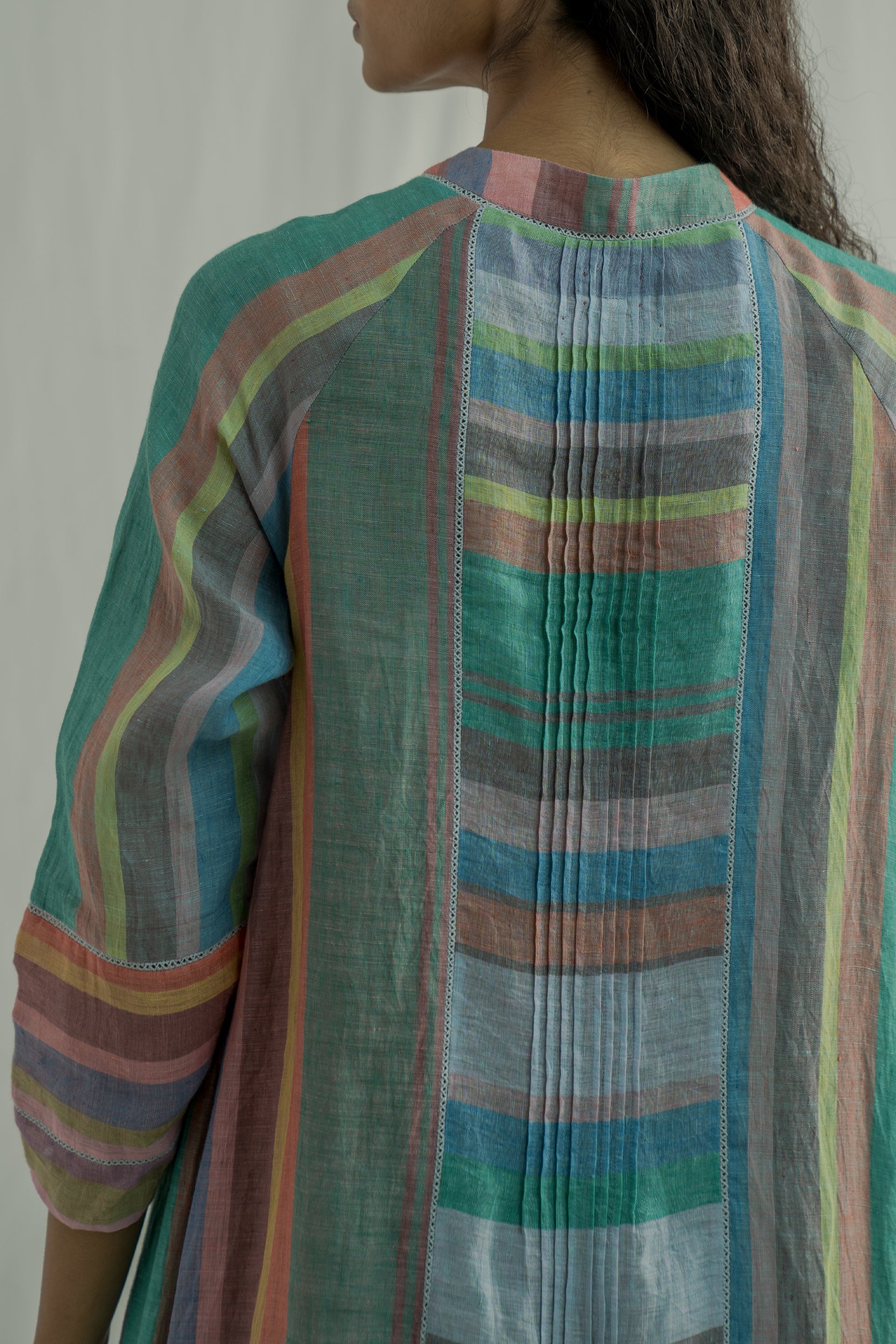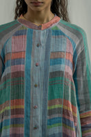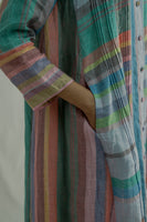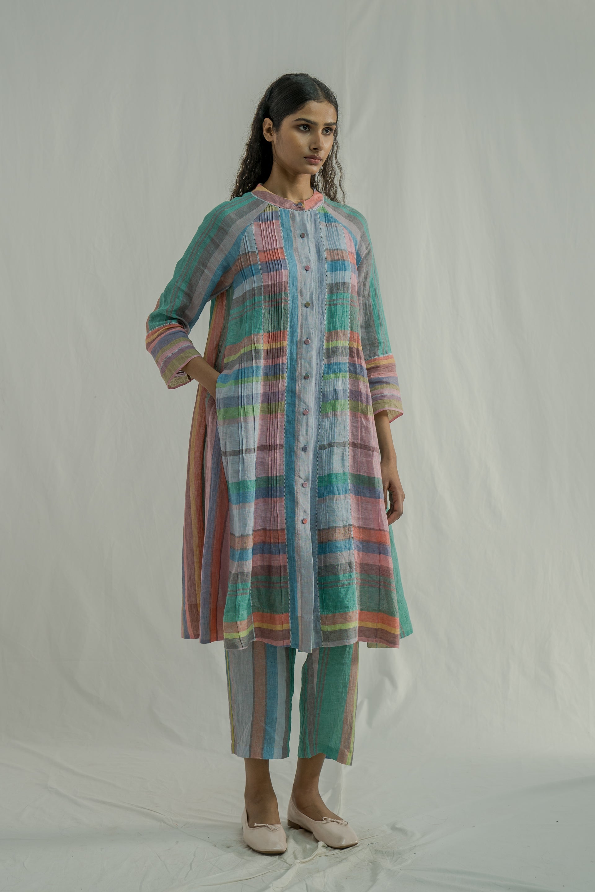 Front-open, button-down stand-collar jacket dress features 3/4 sleeves and all-over pintuck detailing. Made from a mix of two multicolor striped 100% linen fabrics. Comes with a straight fit trouser in the same fabric