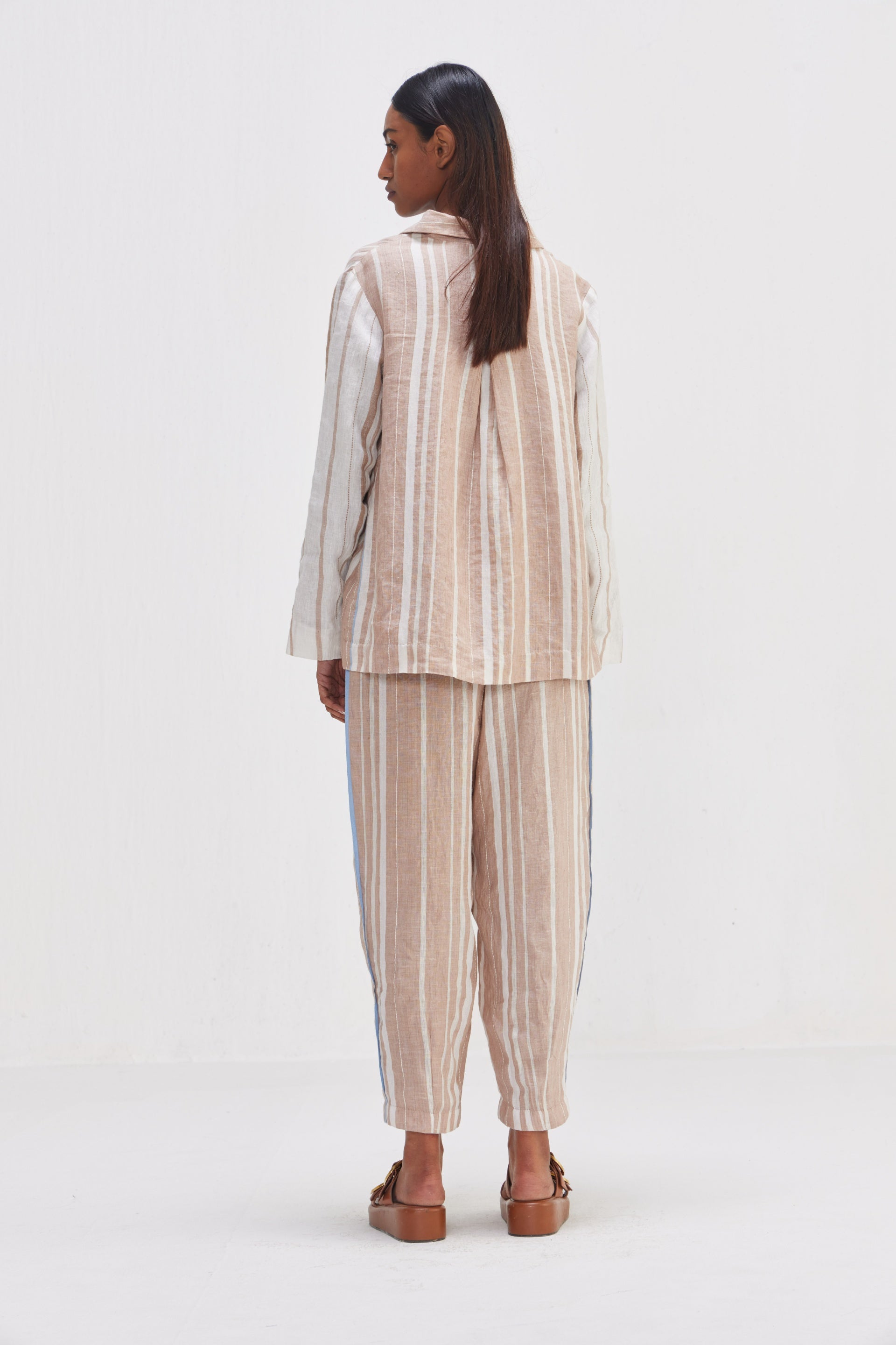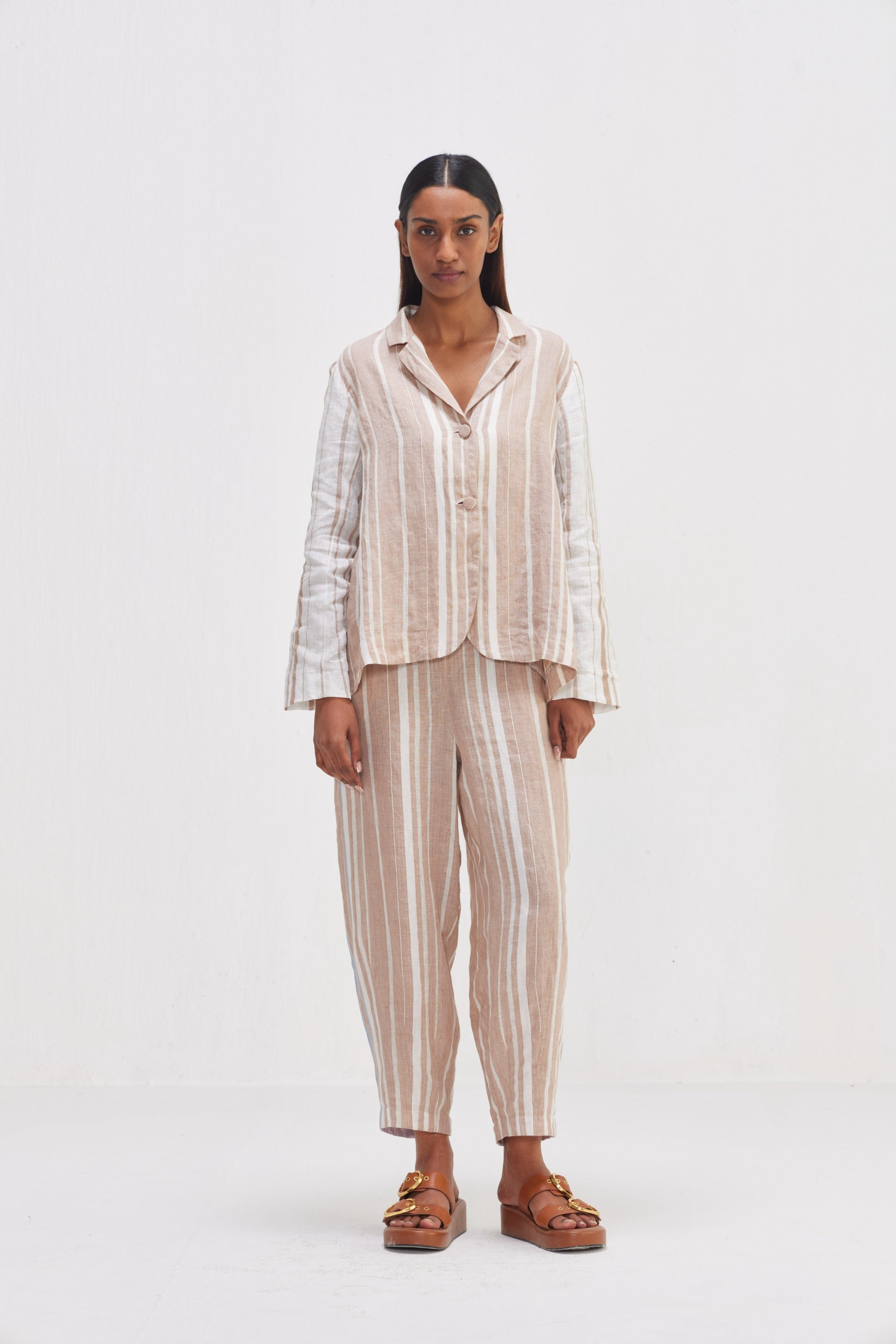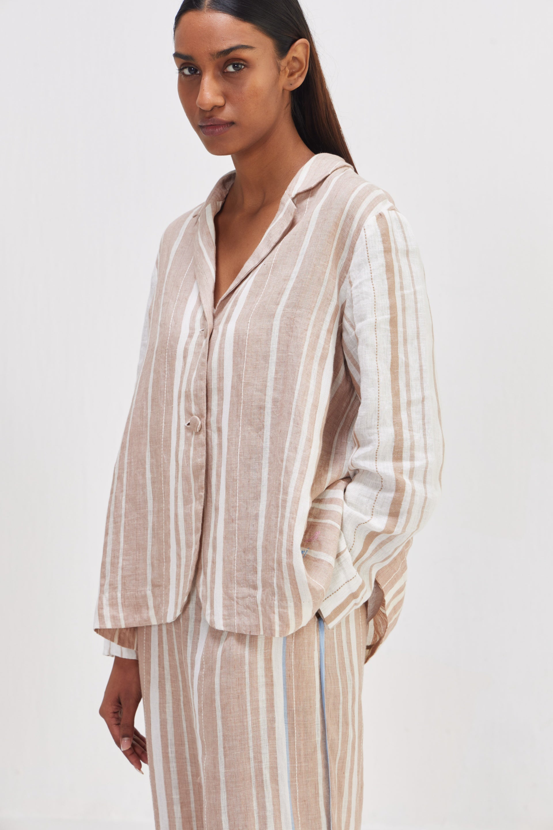 This short striper blazer combines classic tailoring with modern design elements, making it a versatile and stylish, the blazer's sharp lines and structured silhouette are softened by the playful contrast details. Comes with an attached floral printed lining.
