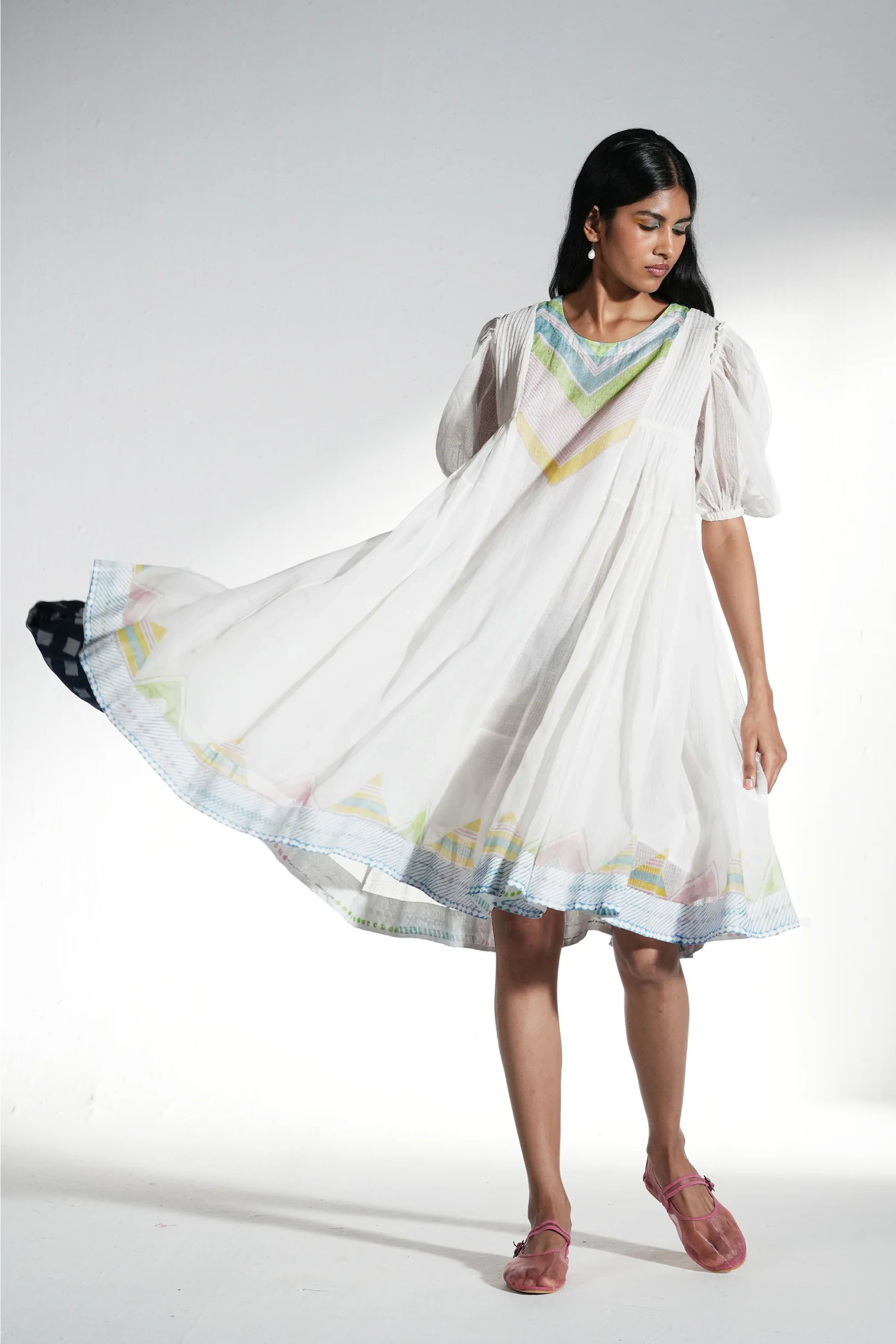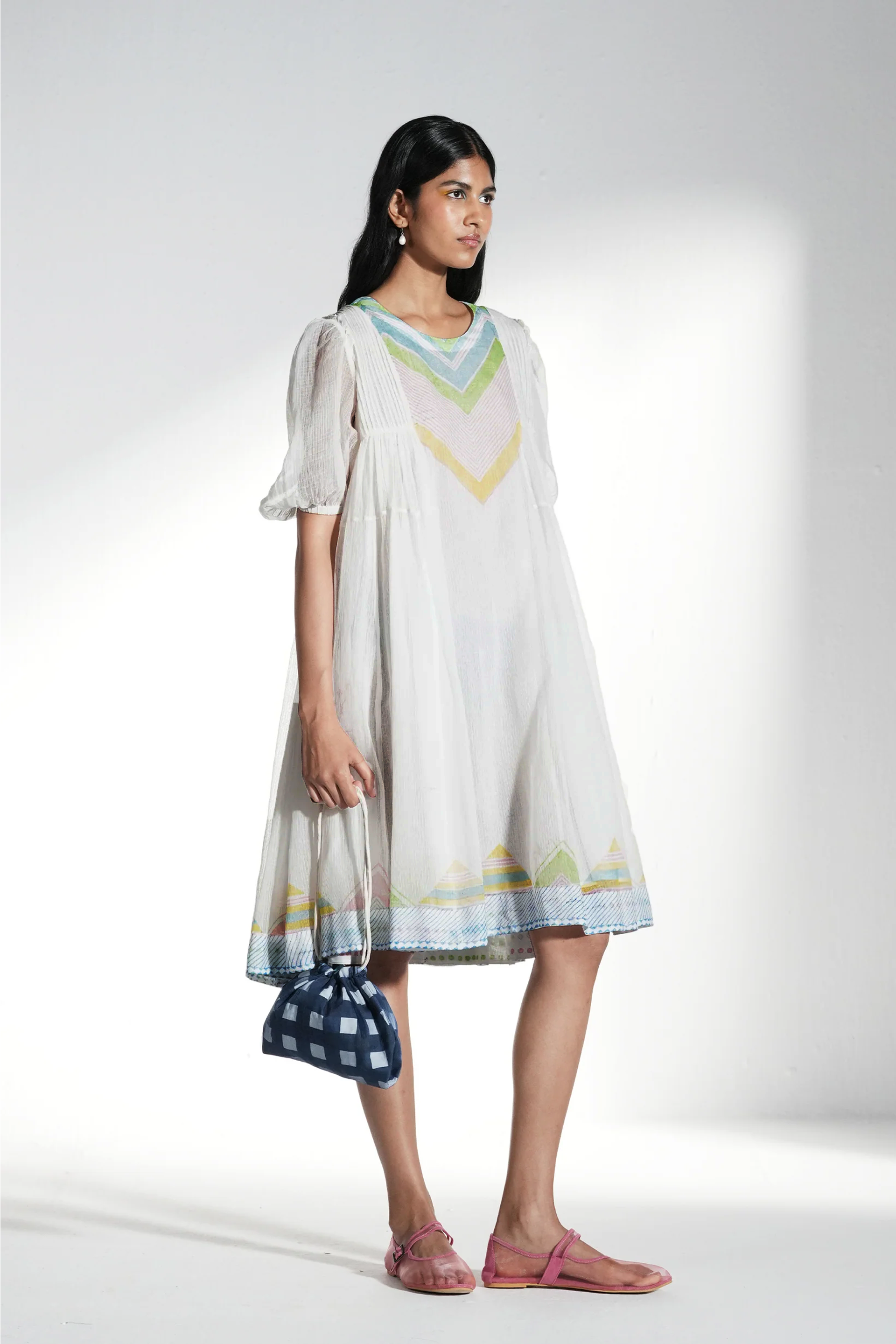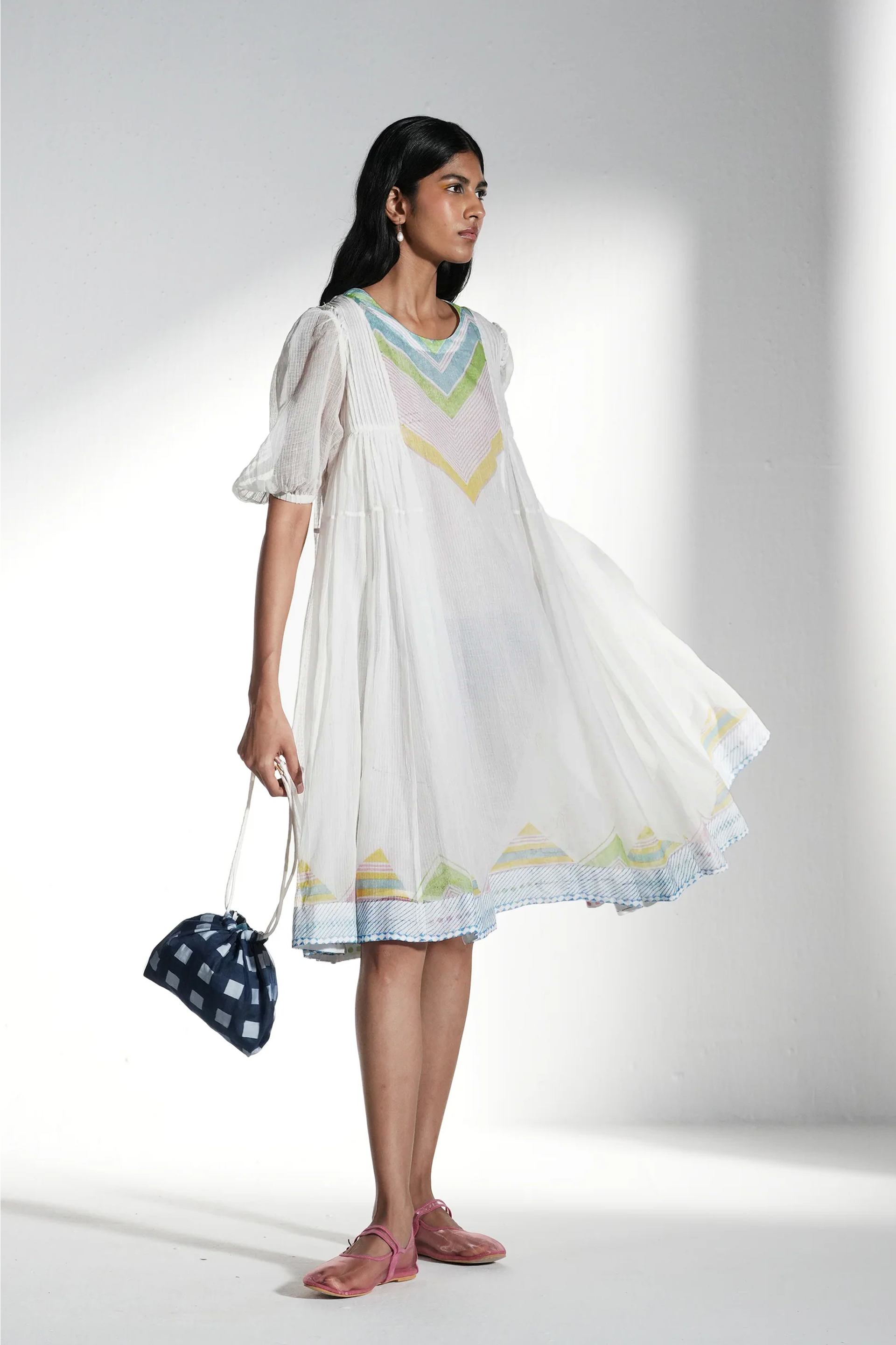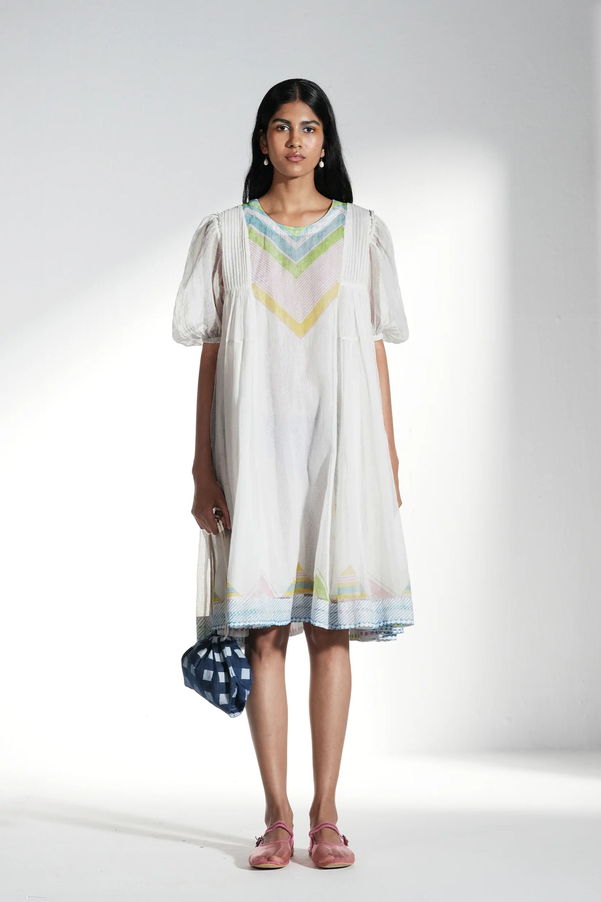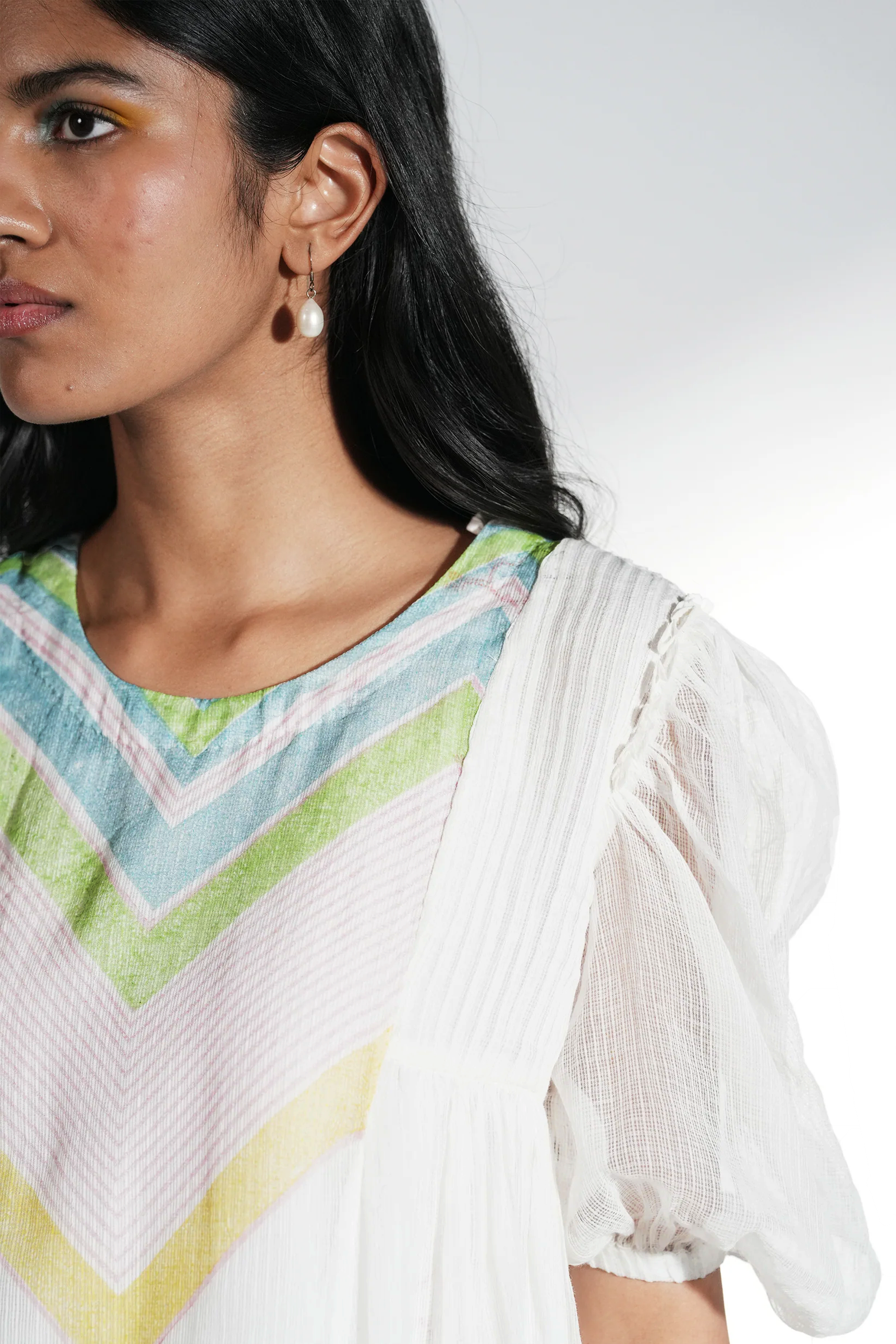 Midi panelled dress in multi chevron print. Lined in cotton silk.