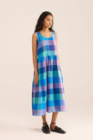 A sleeveless midi dress with a round neckline, featuring gathered details and a tie-up back. Made from multicolor chunky checkered 100% linen.