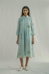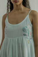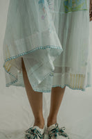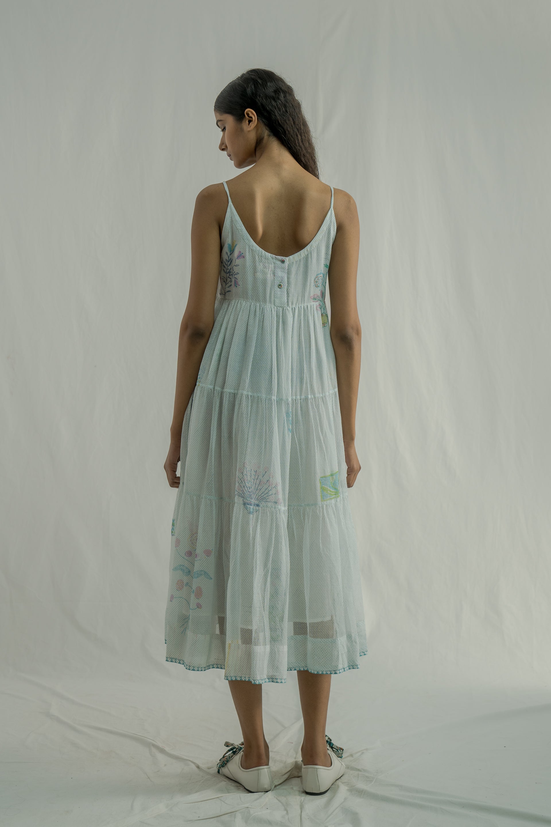 Round deep-neck, adjustable spaghetti strap tiered dress featuring soft gathers for a flattering, flowy silhouette. Crafted from diagonal pinstripes and a placement hand-block print in Kota Doriya fabric, the dress is lined with a matching cotton-silk hand-block print lining.