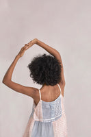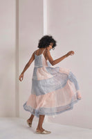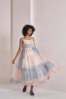 Multicolor spaghetti dress with hand block printed checks in patchwork, highlighted with embroidered buttons in the back, made in kota doriya