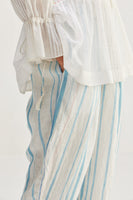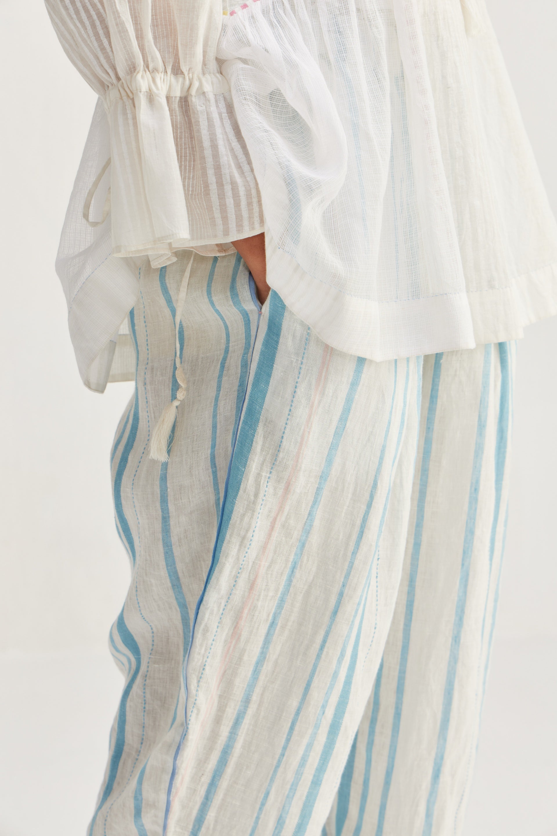Tapered fit high rise trousers with inverted box pleats and elastic waist band drawstring closure.