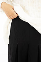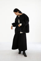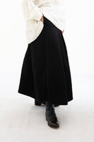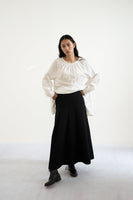 Black quilted skirt in 100% merino wool with box pleats and elasticated waist, lined with handwoven silk.