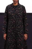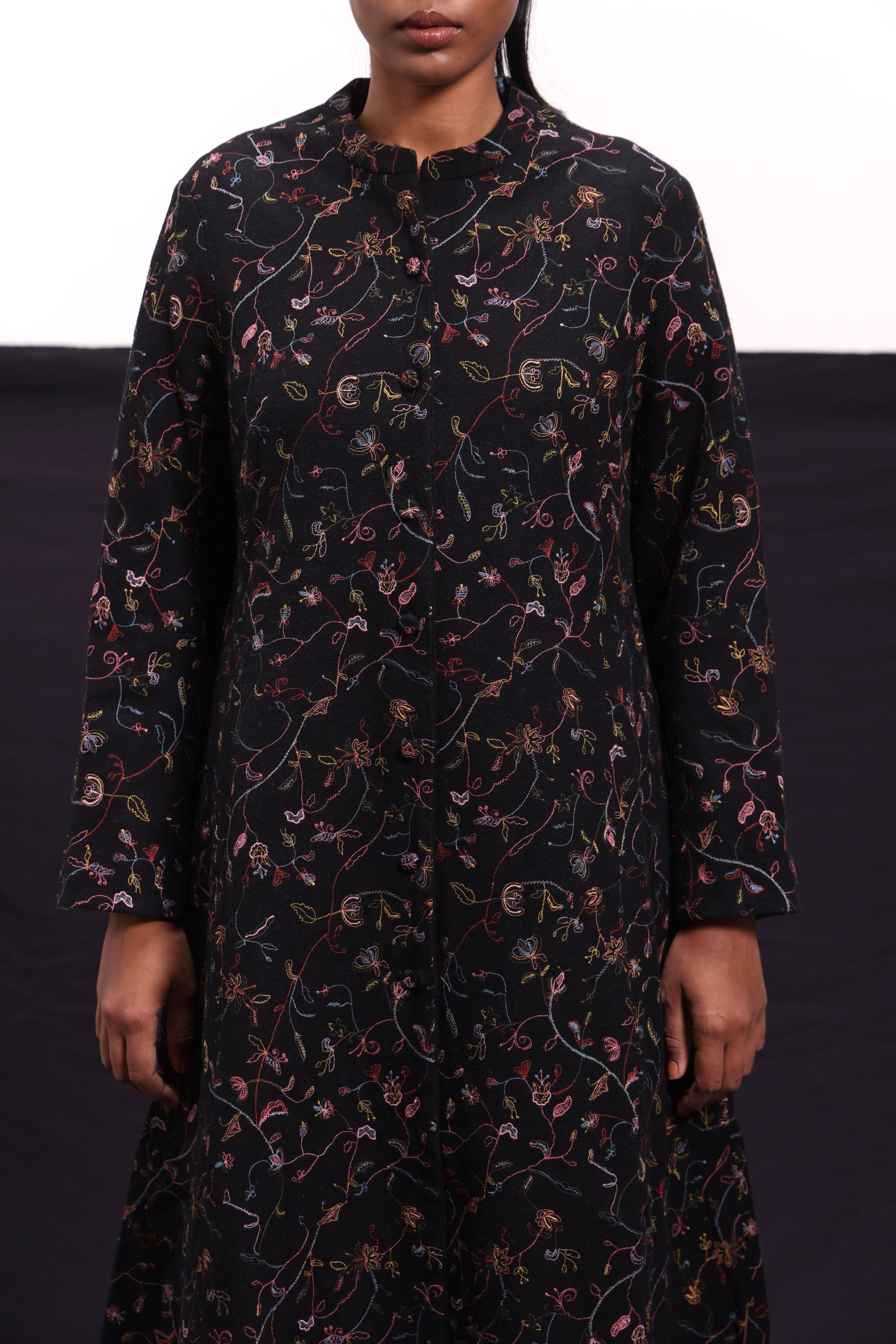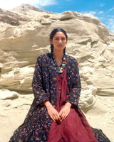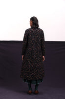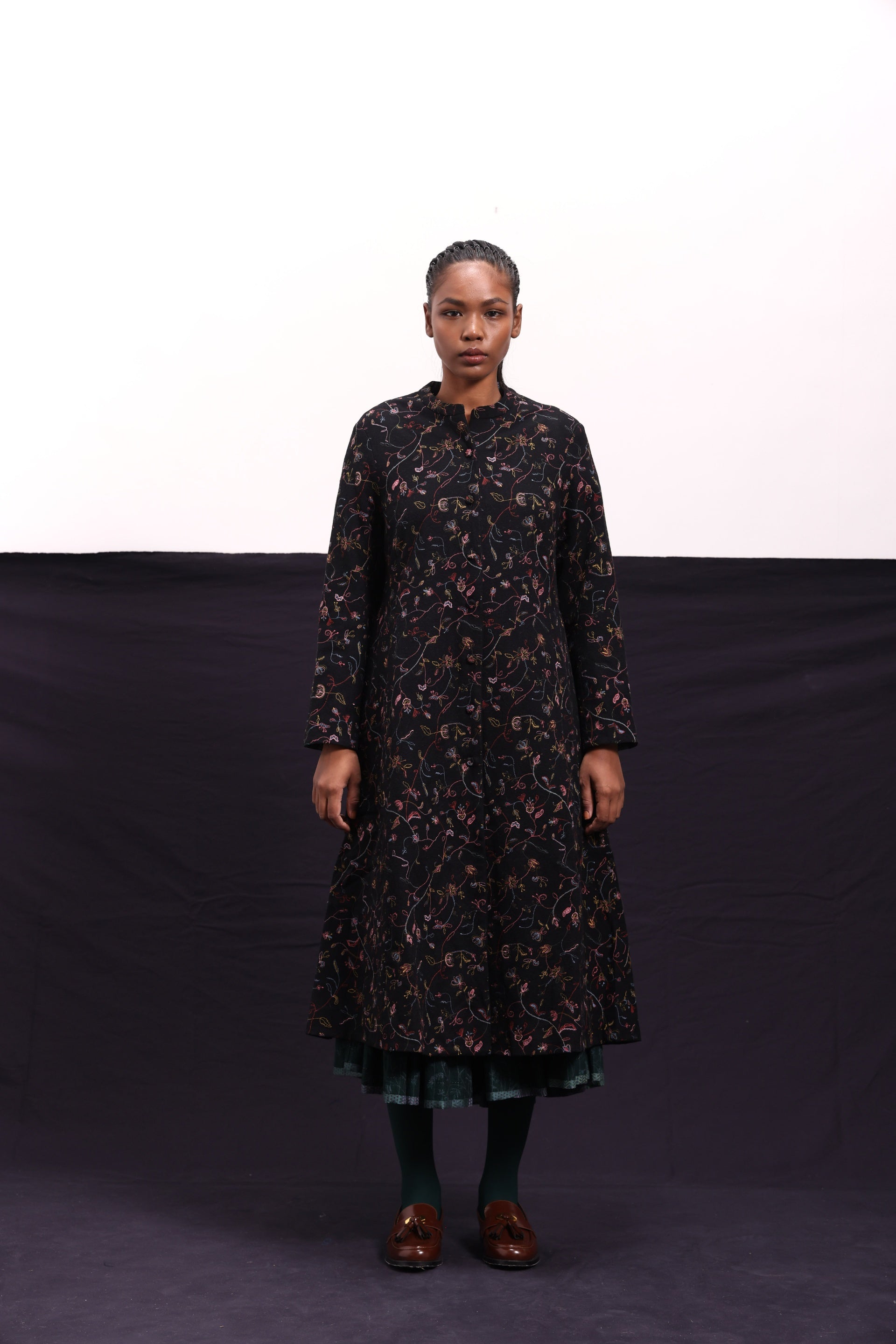 Front open jacket constructed in all over floral blocks printed wool. Comes with an attached hand block printed silk lining.