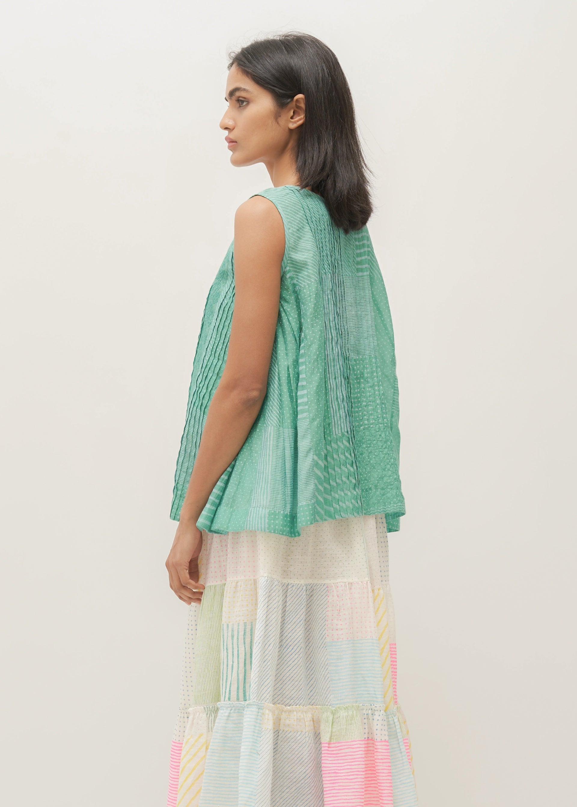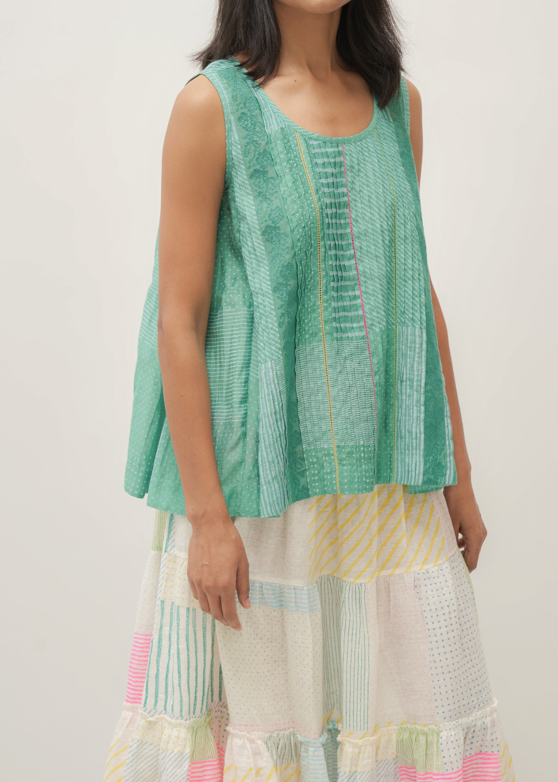 Tiered skirt in linen with multicolor print collage and selvedge detail