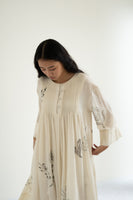 Ecru round neck dress in 100% merino wool featuring hand block-printed floral motifs, pintucks on the front and silk trim border along the sleeves and hemline.