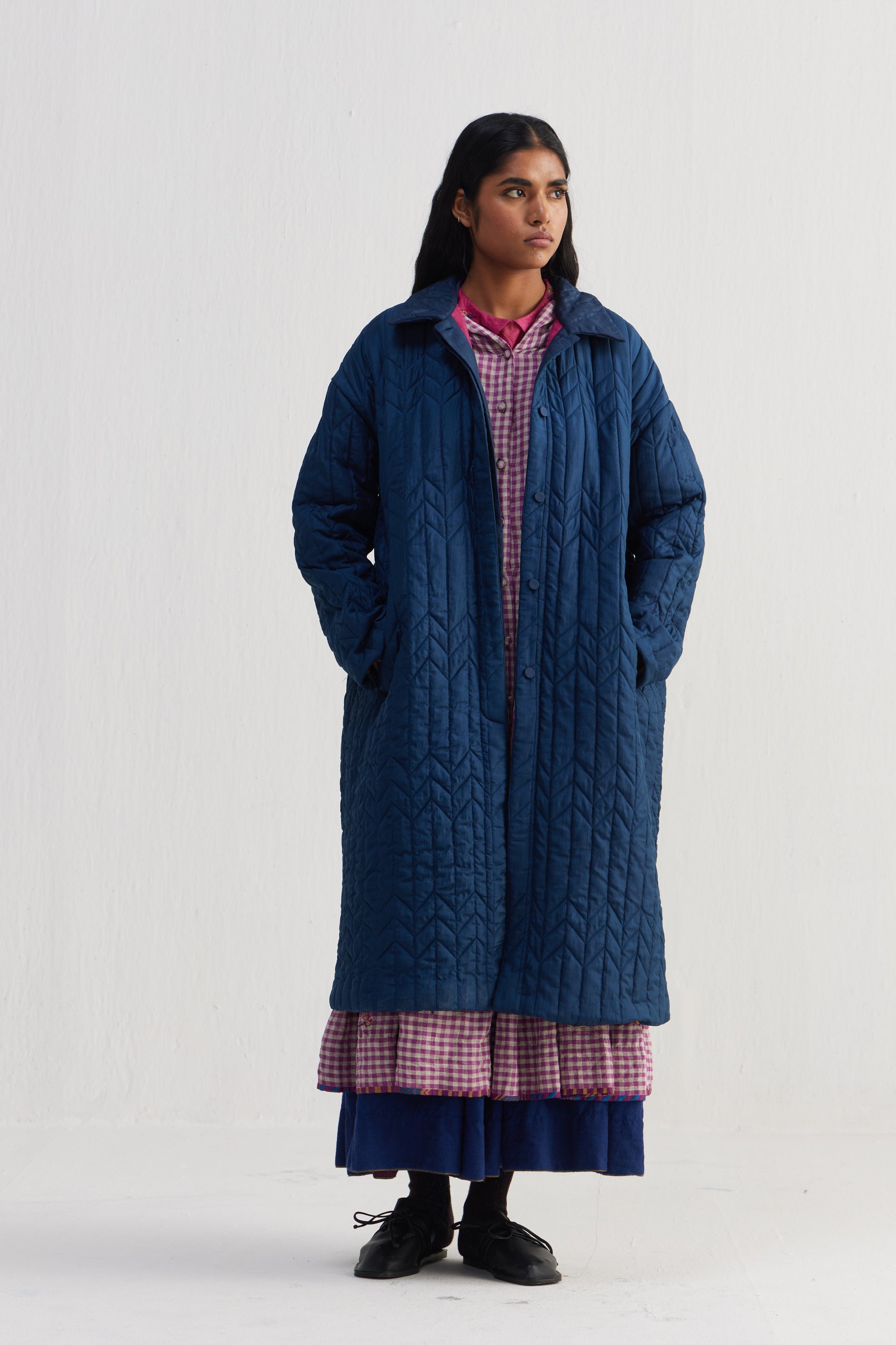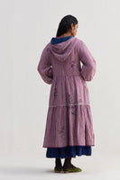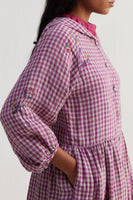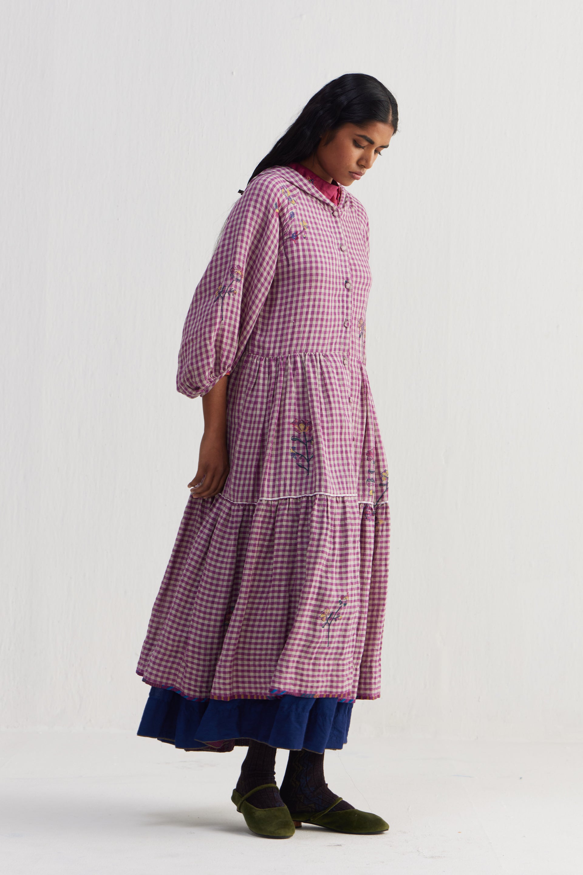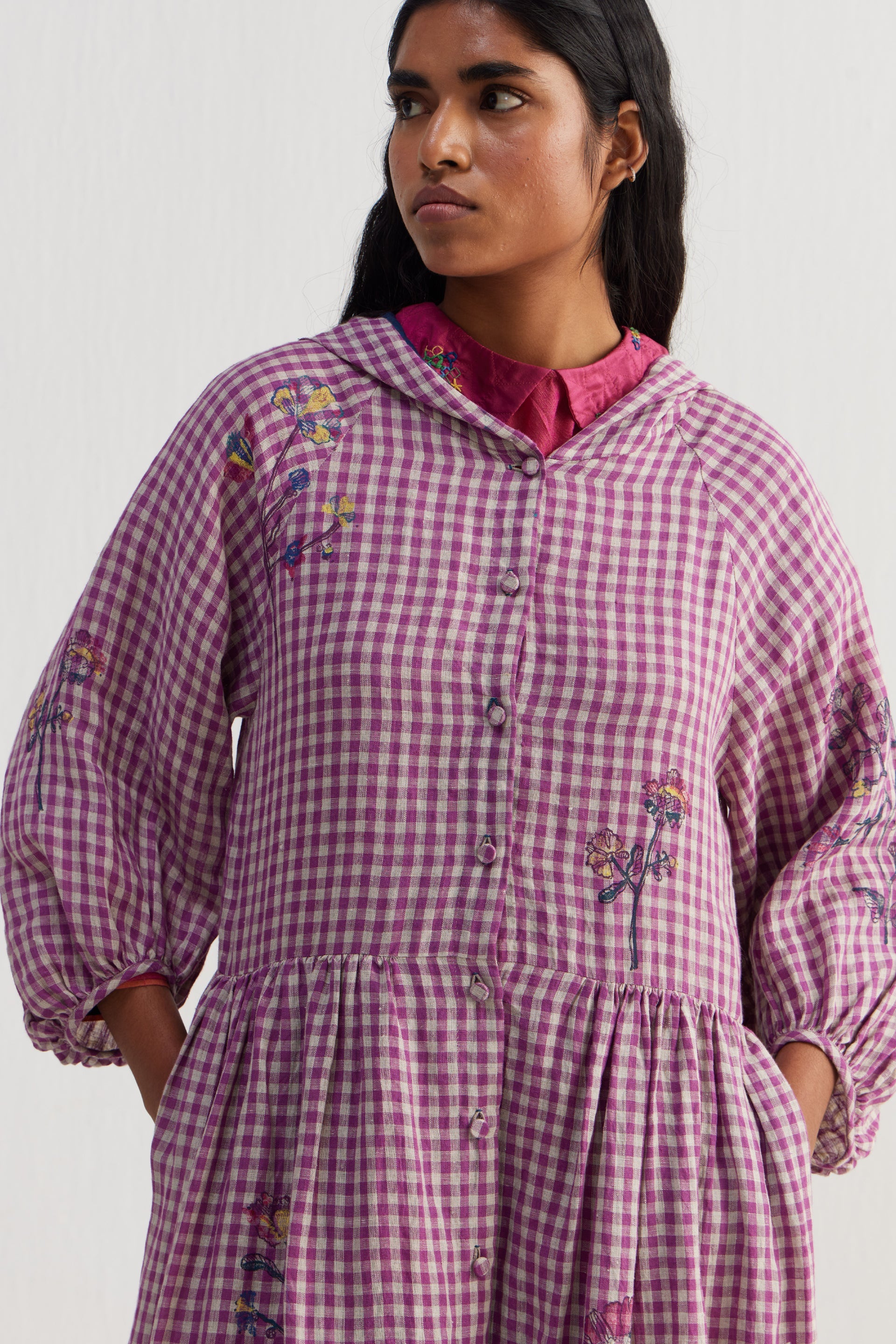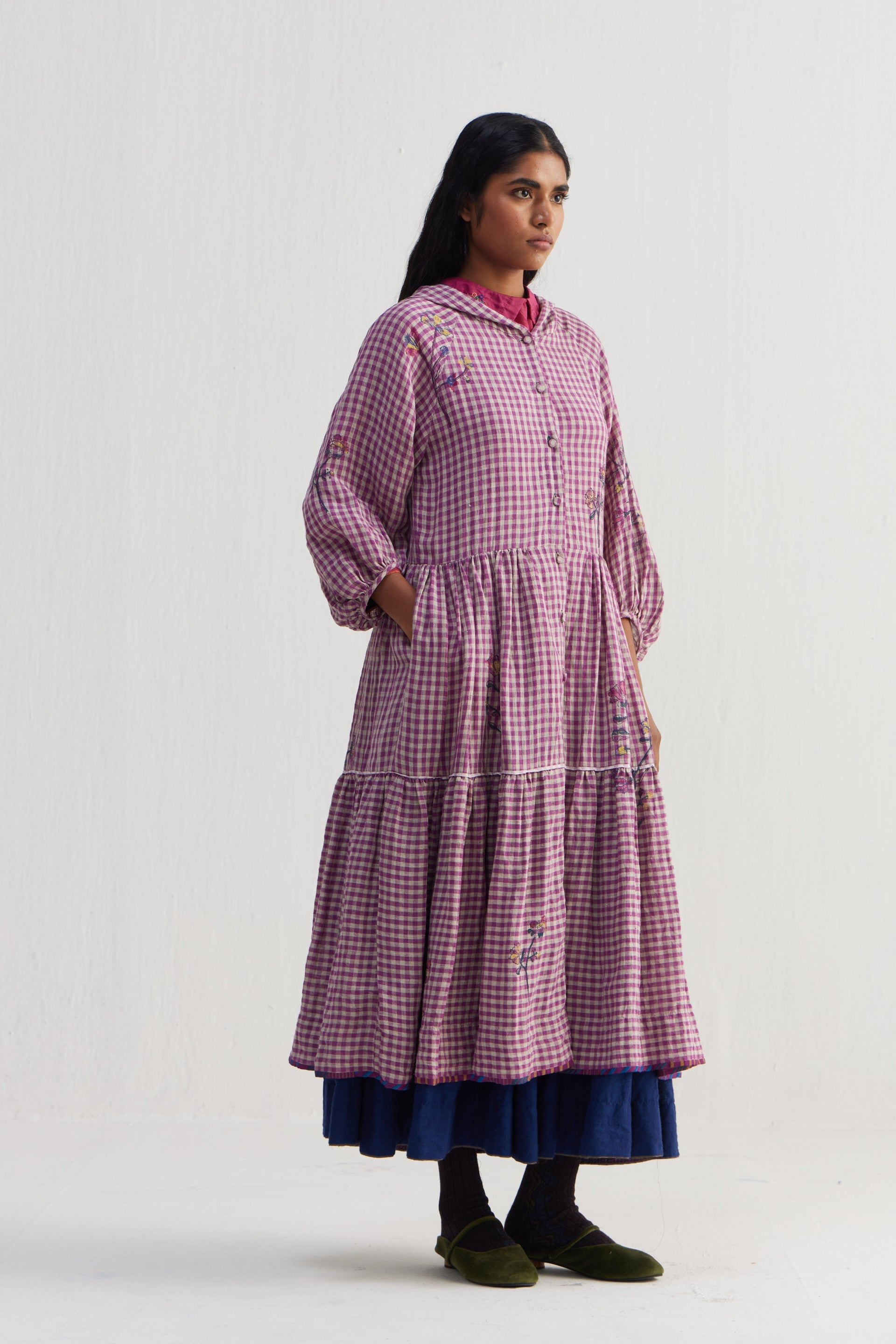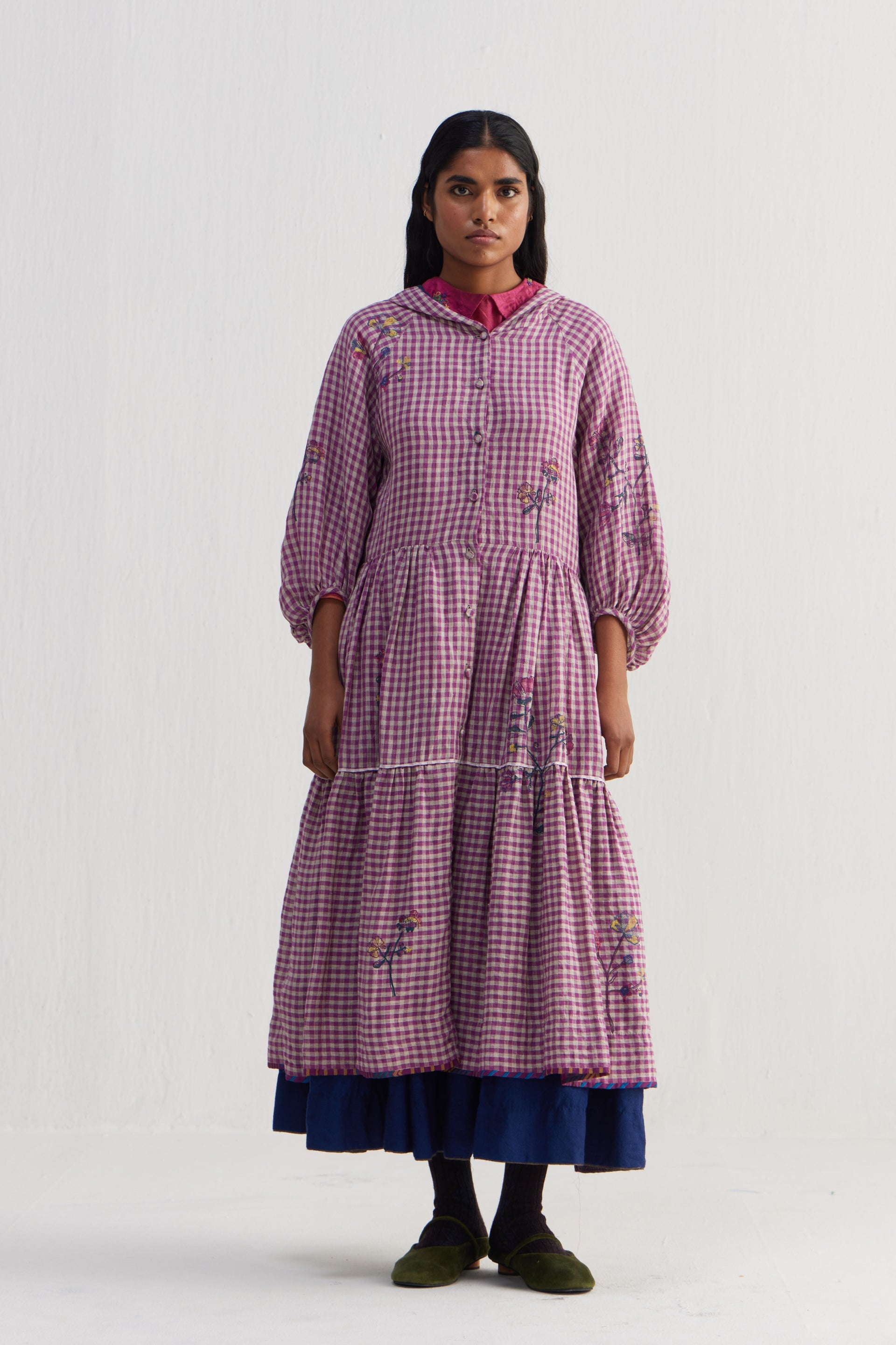 Round neckline buttondown front open midi tier dress with hoodie and full sleeves.Constructed in checkered 100% linen with placement handblock printing. Finished with selvedge detail and collage handblock print 100% silk fabric facing detail.