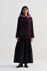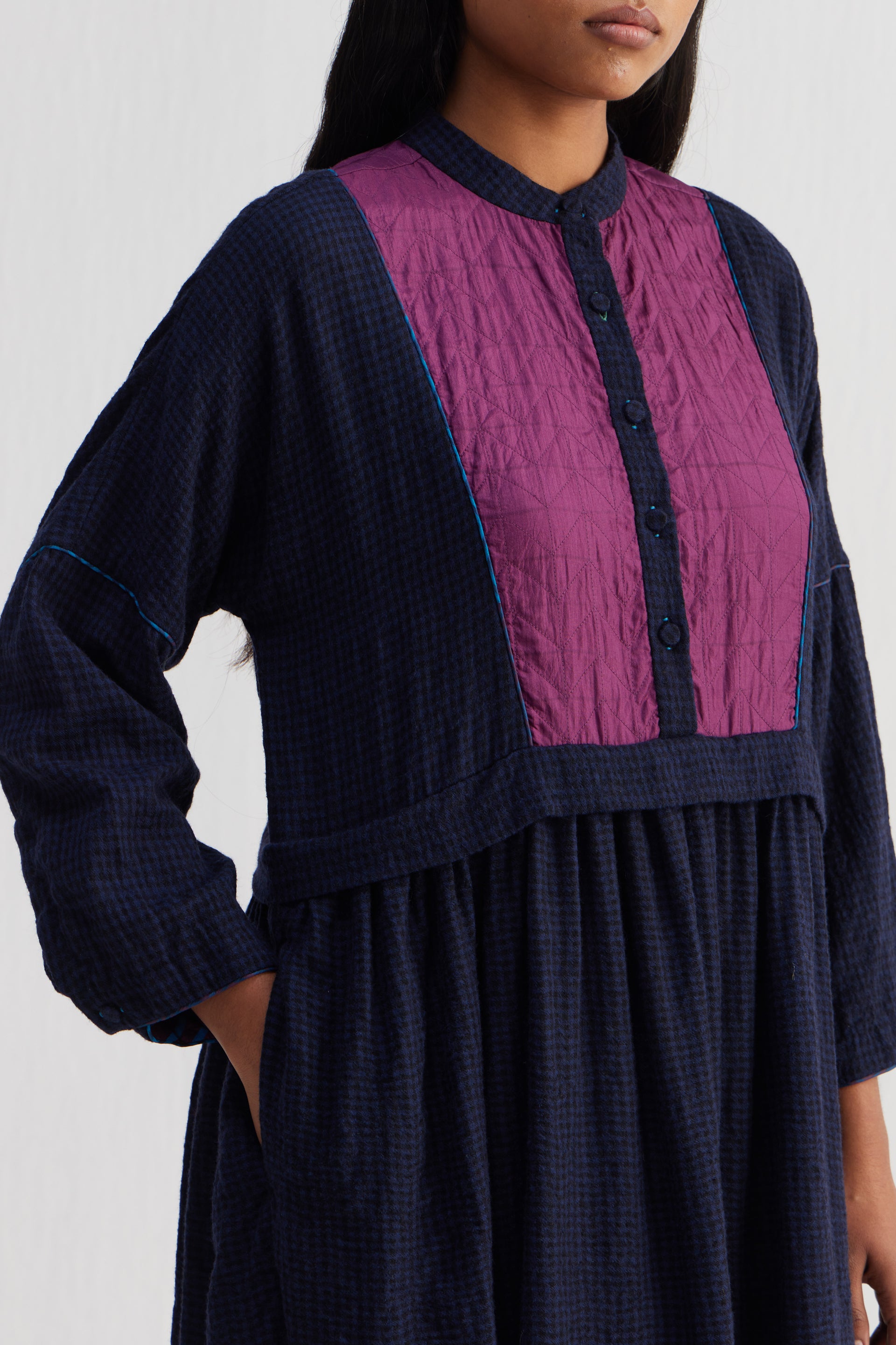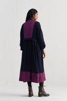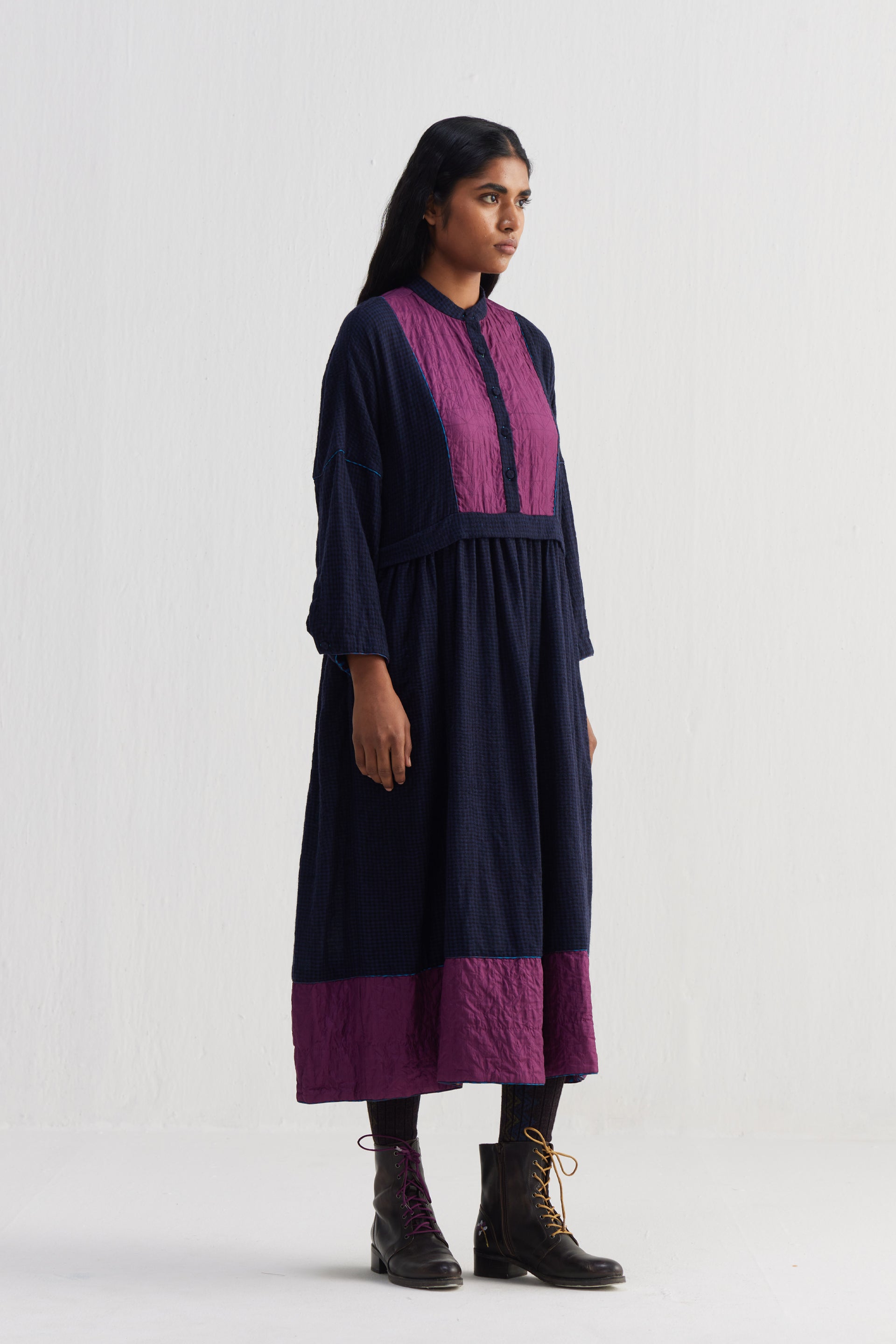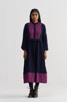 Round neckline front open buttondown full sleeves midi dress with gathers on waist and quilted silk patch at hem and yoke.Constructed in solid 100% merino wool. Finished with contrast handblock print piping detail and collage handblock print 100% silk fabric facing detail.