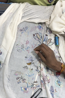 Sozni embroidery—is a 500 year old needle craft embroidery  passed down through generations. Each piece reimagines traditional motifs with delicate chain stitches in silk and wool threads. Originally sozni was done in Kashmir on pashmina wool shawls in silk threads. We’ve used the dexterity and elegance of sozni and contemporized it in patterns, colors, and stitch variations.
