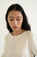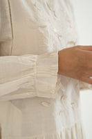 Ecru dress in wool-linen with hand-embroidered applique florals on the front, gathered waistlin and ruffles along the neckline and cuffs.