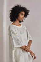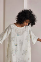 White handwoven linen dress, hand block printed with over 30 different blocks and colors to create special quarantine theme motifs and punctuated with applique work