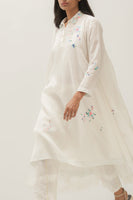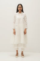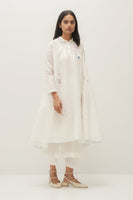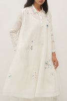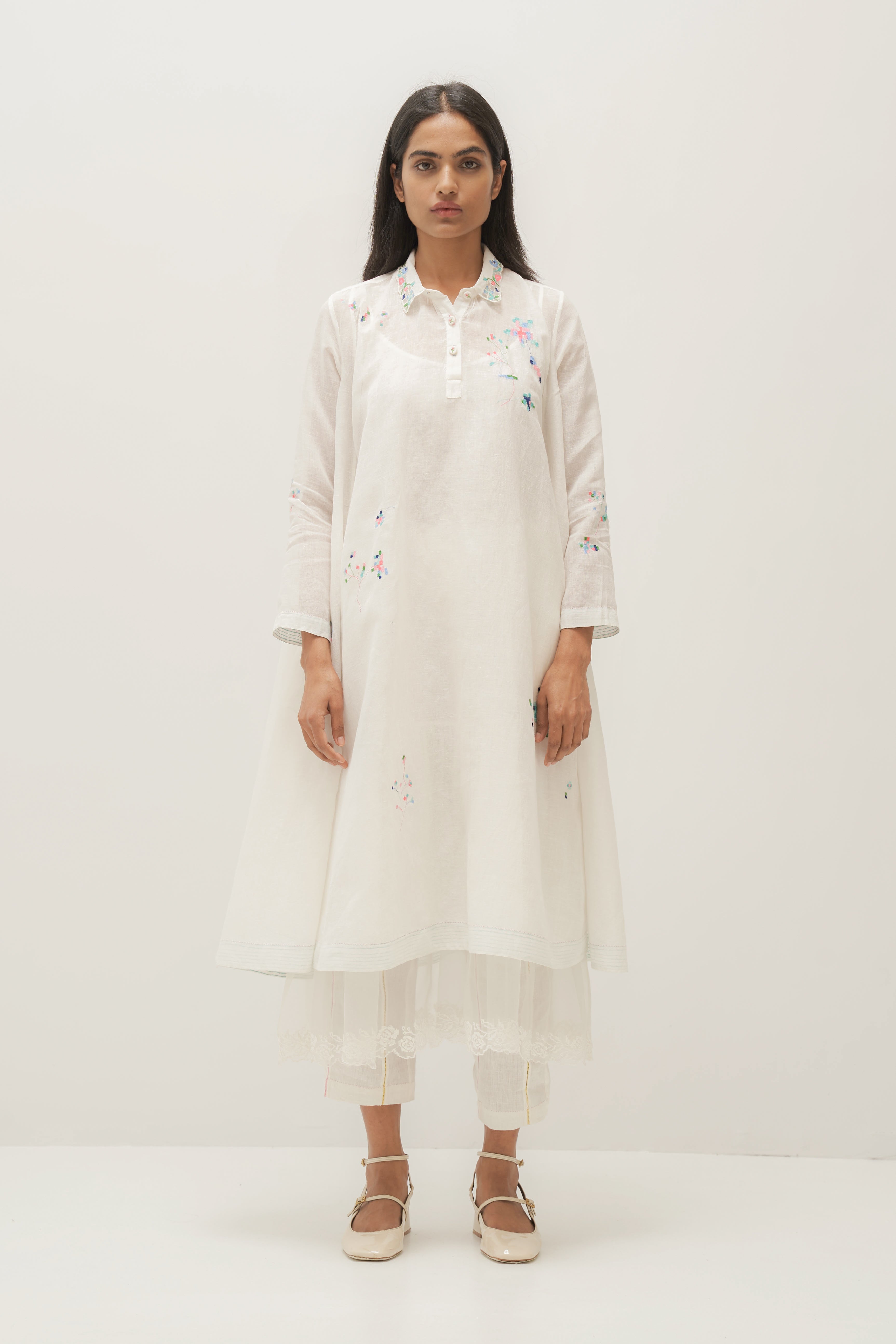 A-line white dress in cotton silk handloom with placement floral embroidery and hand embroidery detail on the collar